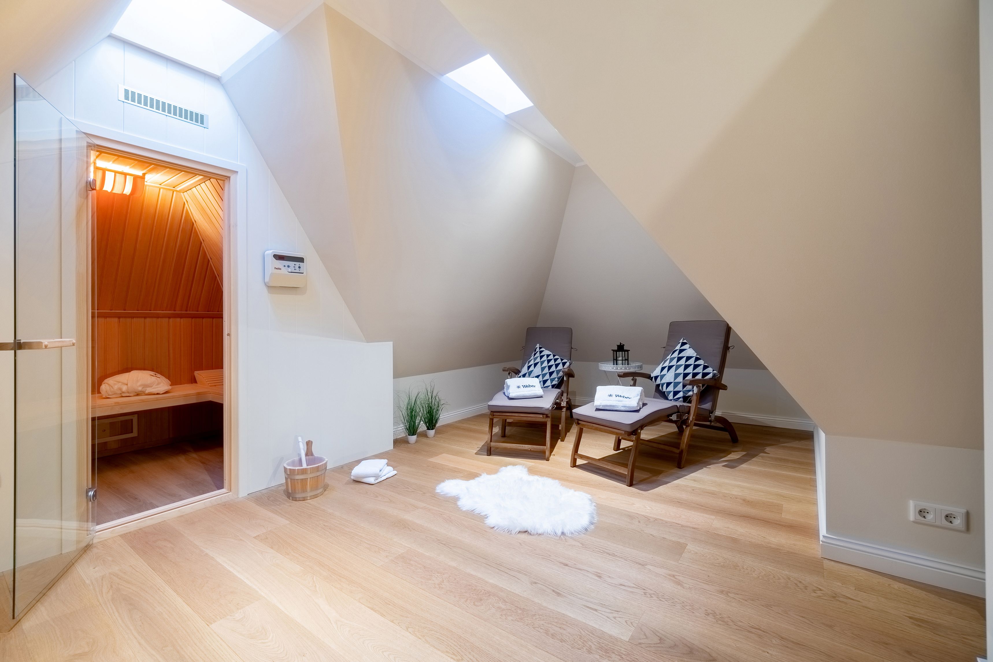 Im Dachgeschoss befindet sich die hauseigene Sauna samt Ruheraum.