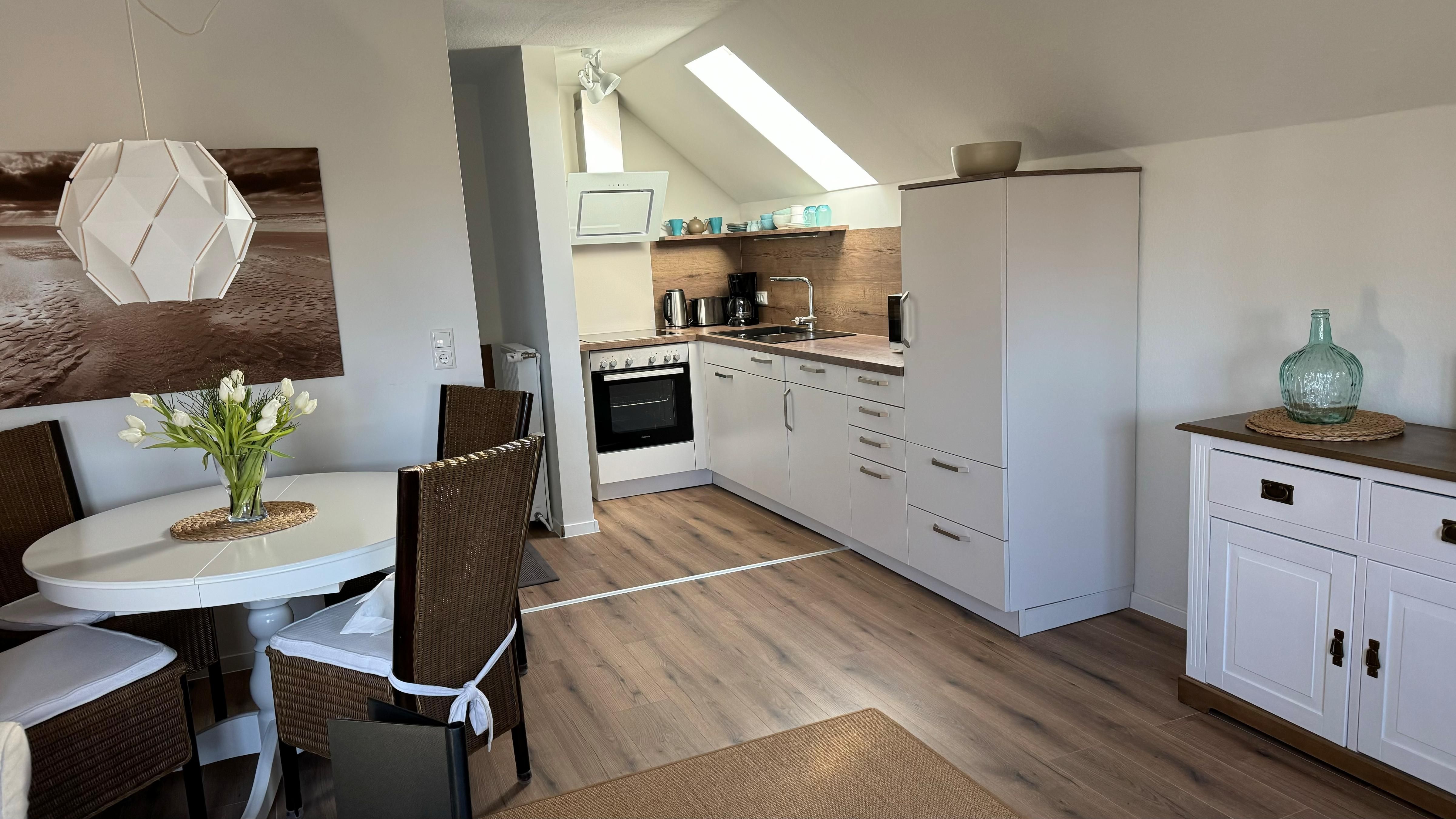 Die Ferienwohnung "Utkiek" für 2 Personen liegt in der 1. Etage des historischen Gebäudeteils. Nach der schönen Aussicht müssen sie nicht lange suchen, sie haben einen wunderschönen Blick auf das Dornumersieler Tief. Die Wohnung ist gerade frisch renoviert und hat eine neue großzügige, offene Küche und ein Wohnzimmer mit Essbereich, ein SmartTV, ein Schlafzimmer mit Doppelbett (1,80 m) und ein neues Duschbad. Es steht eine separate Waschküche mit Waschmaschine, Trockner, Bügeleisen und Bügelbrett gegen Gebühr zur Verfügung. Ein Aussensitzplatz sowie kostenloses WLAN sind ebenfalls vorhanden. Ein Hund darf gerne mitreisen.