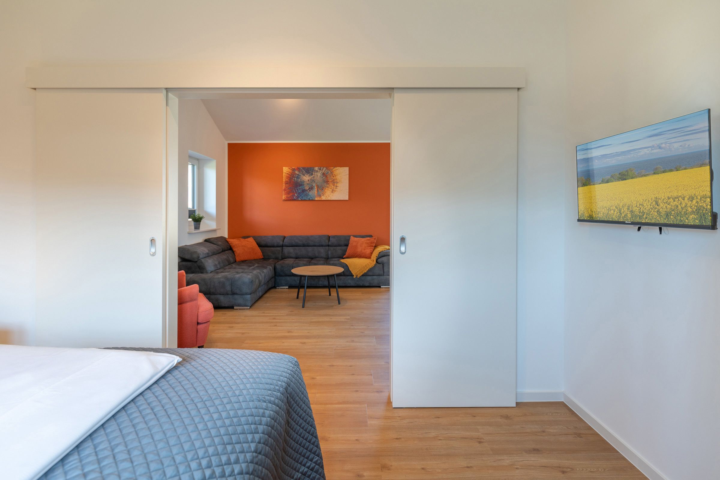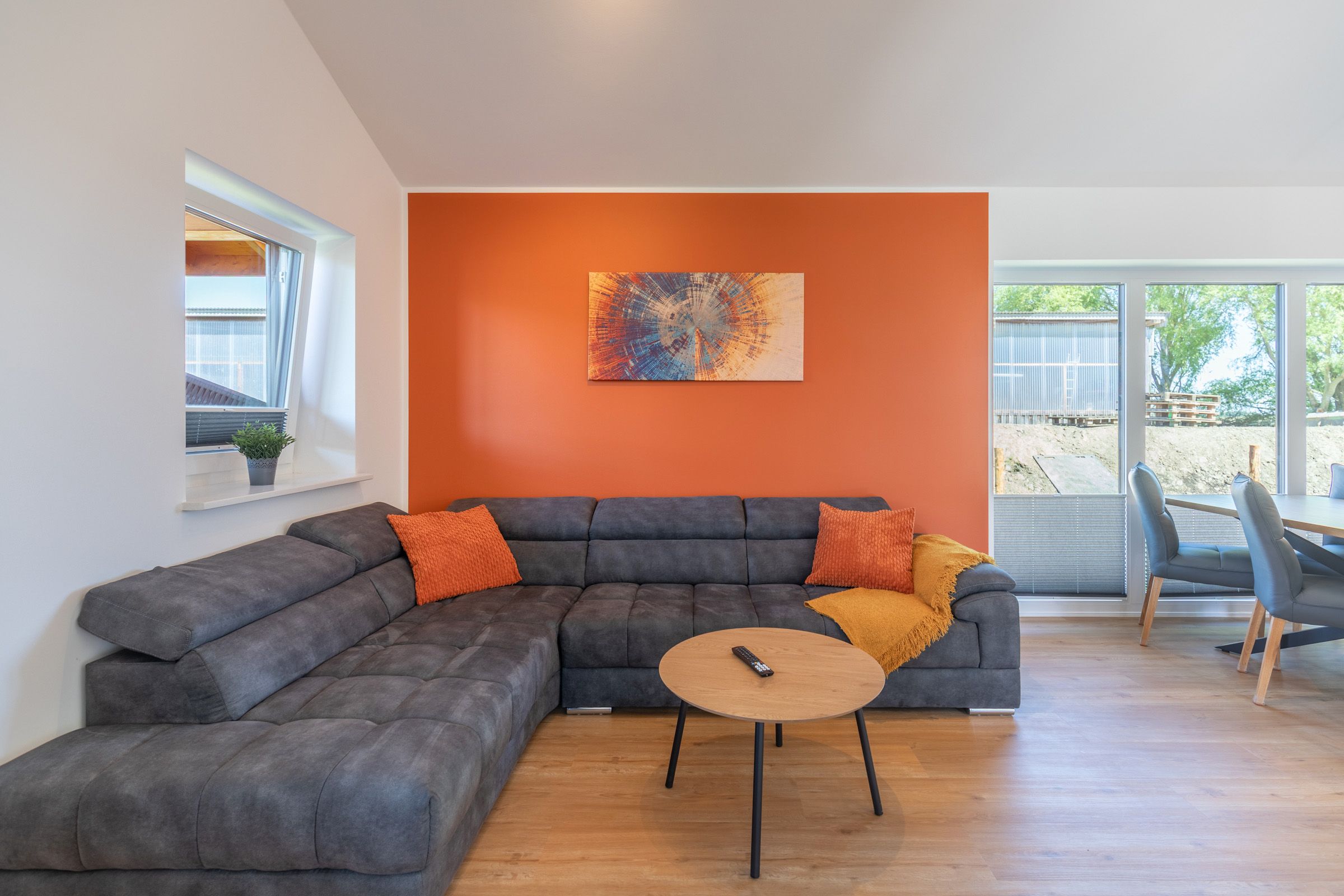 Die offene Küche ist voll ausgestattet mit Induktionskochfeld, Backofen, Mikrowelle, Spülmaschine, Senseo-Kaffeemaschine und Kühlschrank mit Gefrierfach – perfekt für gemeinsame Kochabende. Im gemütlichen Wohnbereich laden eine Sofaecke und ein SMART-Fernseher zum Verweilen ein. Kostenloses, schnelles WLAN hält Sie jederzeit online. Der angrenzende Essbereich bietet ausreichend Platz für alle Gäste.