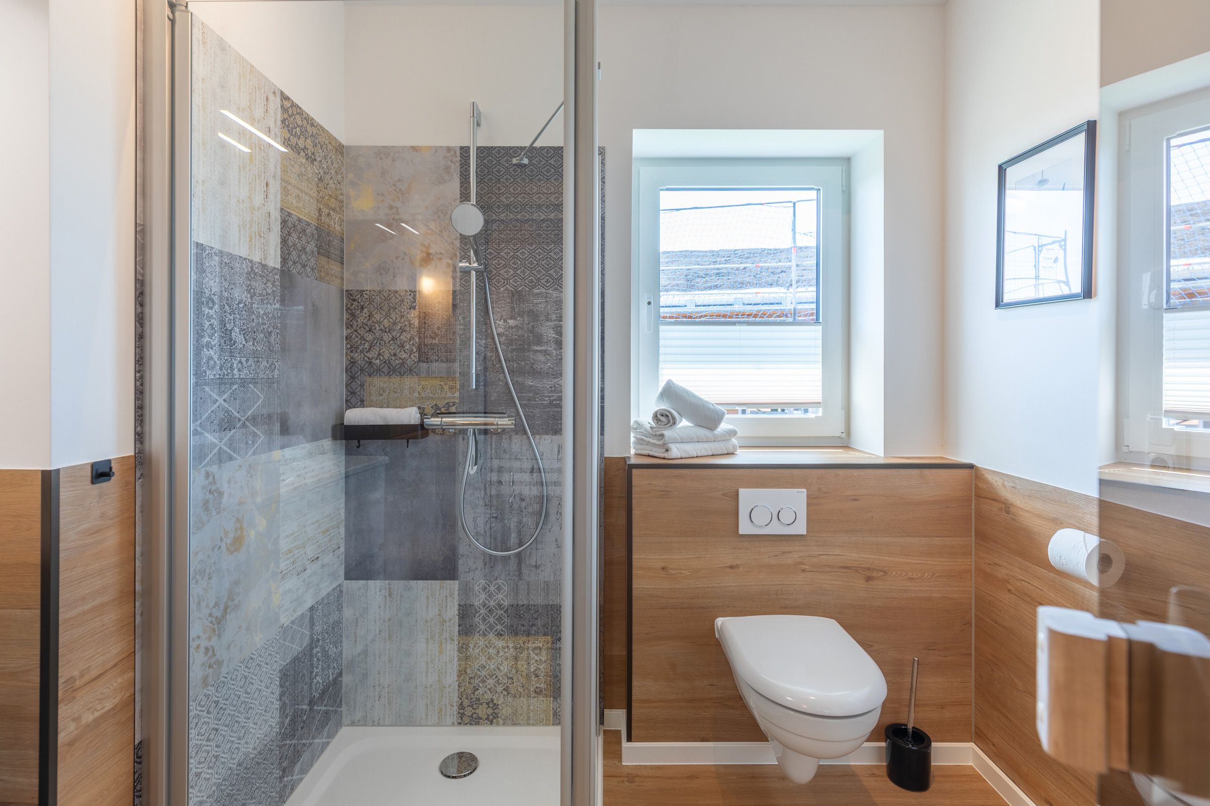 Ein modernes Badezimmer mit bodengleicher Dusche, WC und Sauna sowie ein zusätzliches Gäste-WC sorgen für besonderen Komfort.