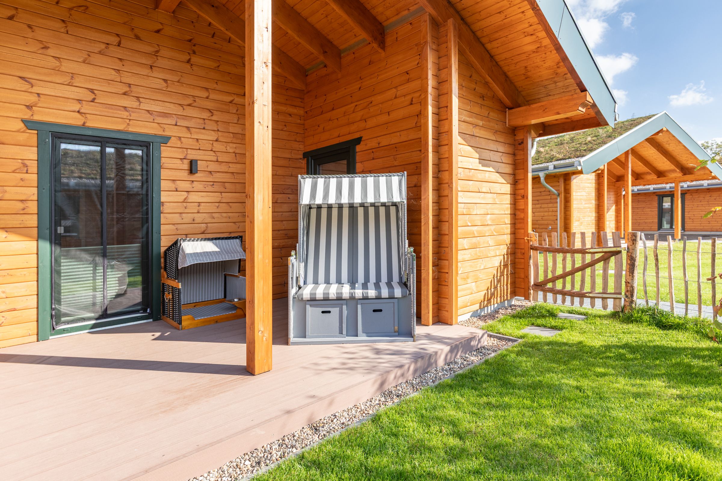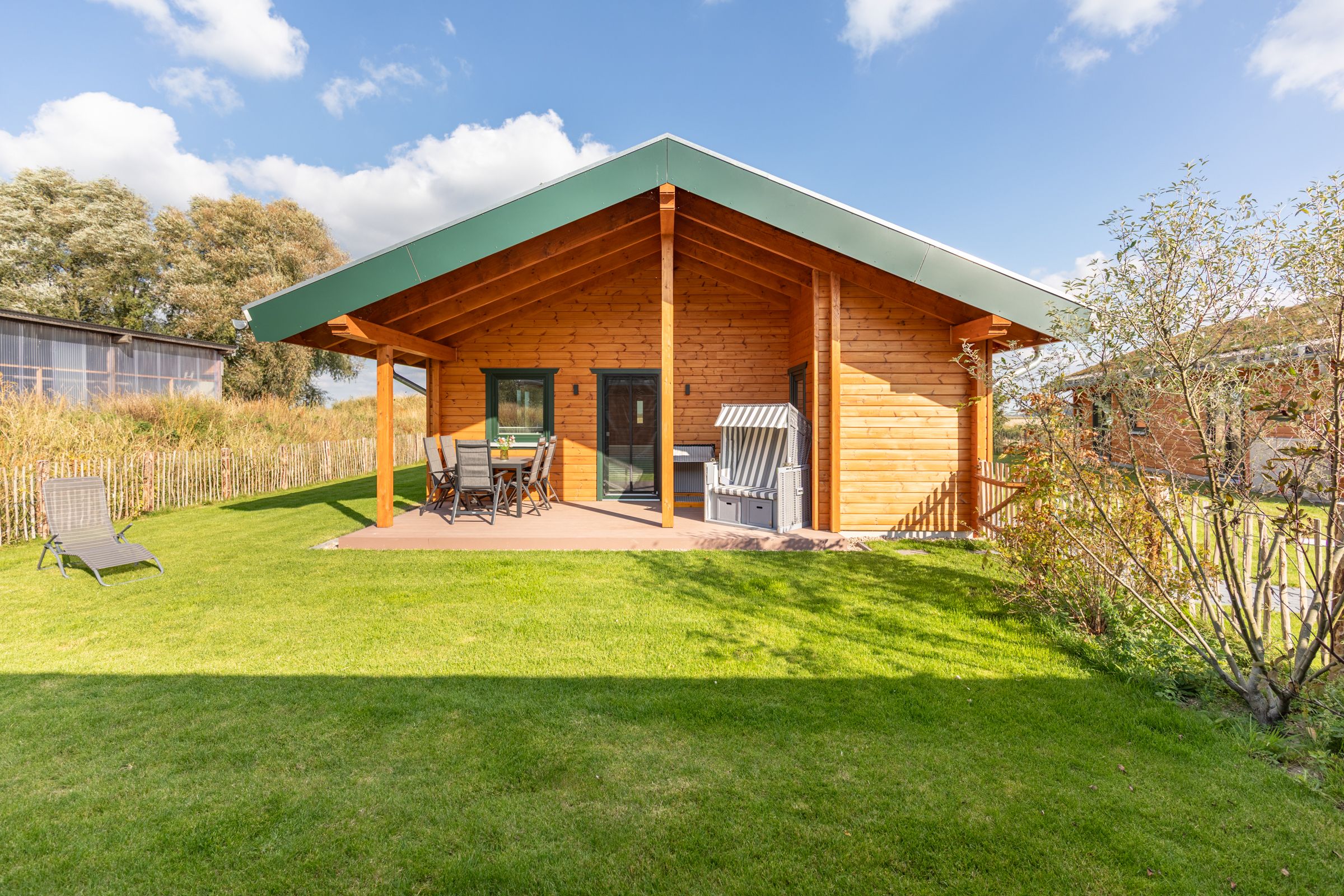 Gartenmöbel, ein Kugel-Holzkohlegrill, ein Strandkorb und ein Windschutz laden zu entspannten Stunden auf der Terrasse ein. Für Wellnessliebhaber steht eine eigene Sauna zur Verfügung – ideal, um nach einem aktiven Tag zur Ruhe zu kommen.