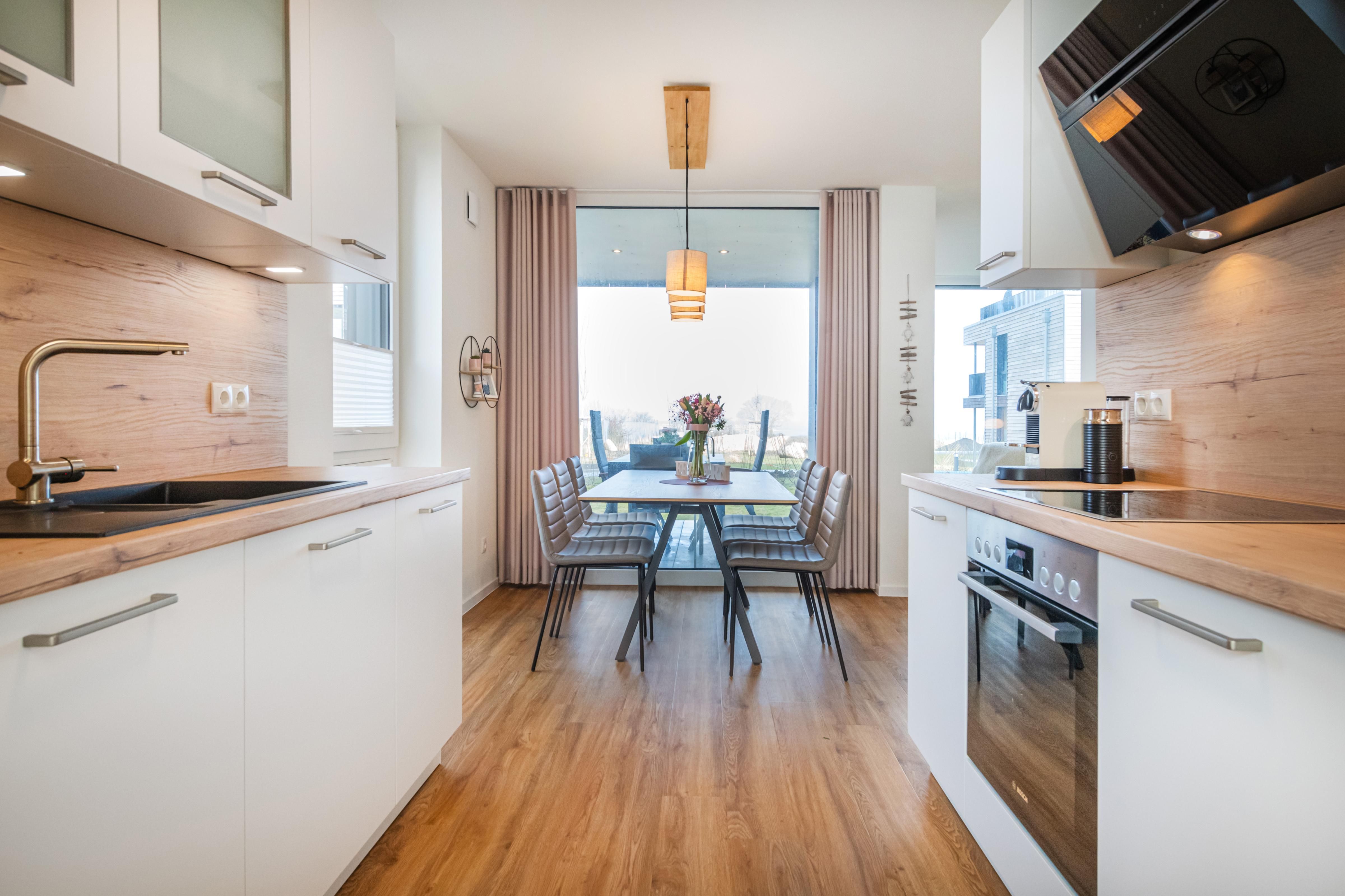 Der offene Wohnbereich mit bodentiefen Fenstern schenkt dir Licht, Weite und Meerblick. Die voll ausgestattete Küche mit modernen Markengeräten lädt zum gemeinsamen Kochen ein. Im großzügigen Essbereich finden bis zu sechs Personen bequem Platz. Stilvolle Möbel, warme Farben und Naturfotos schaffen eine wohnliche Atmosphäre – dank Fliegengittern bleibst du dabei stets ungestört.