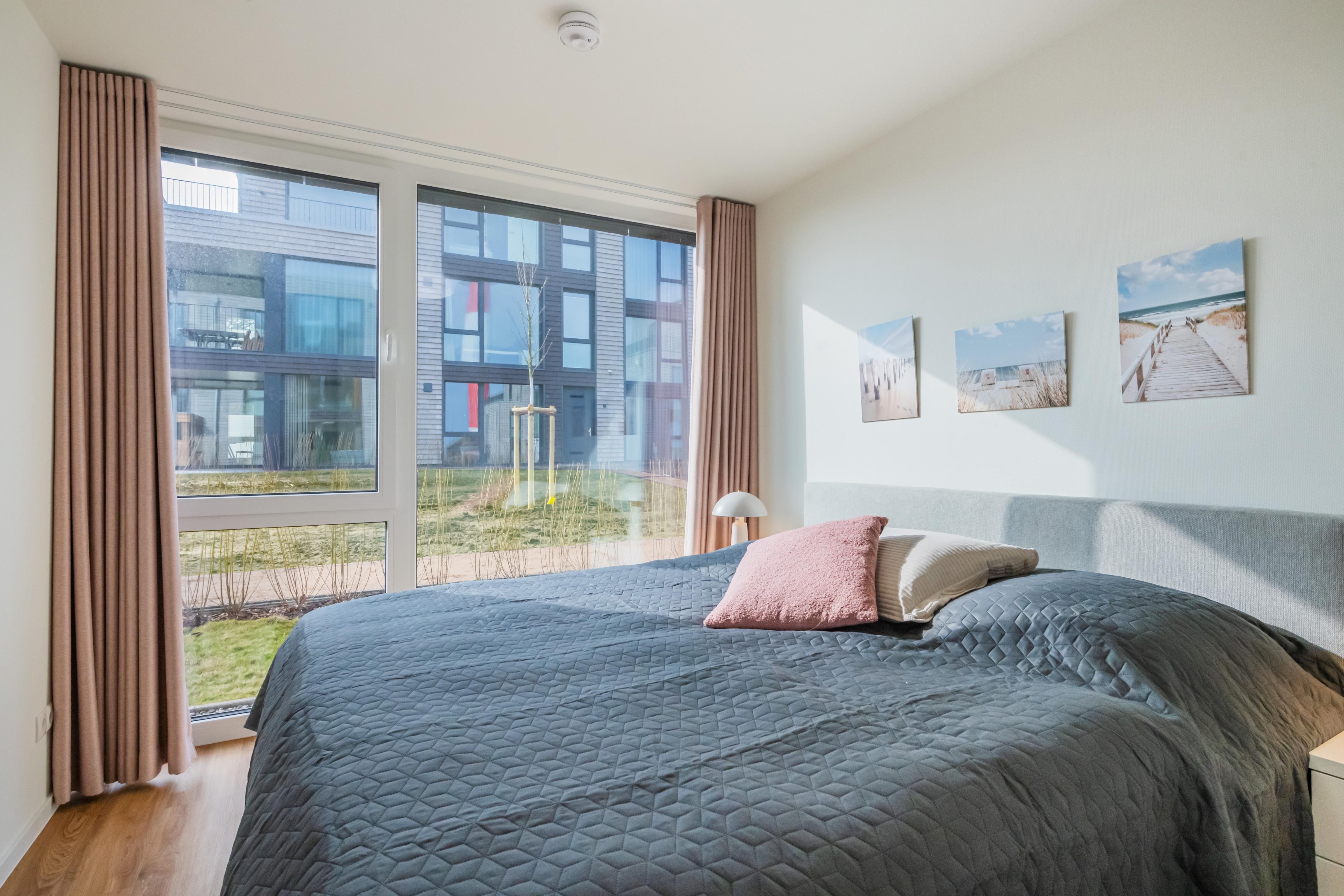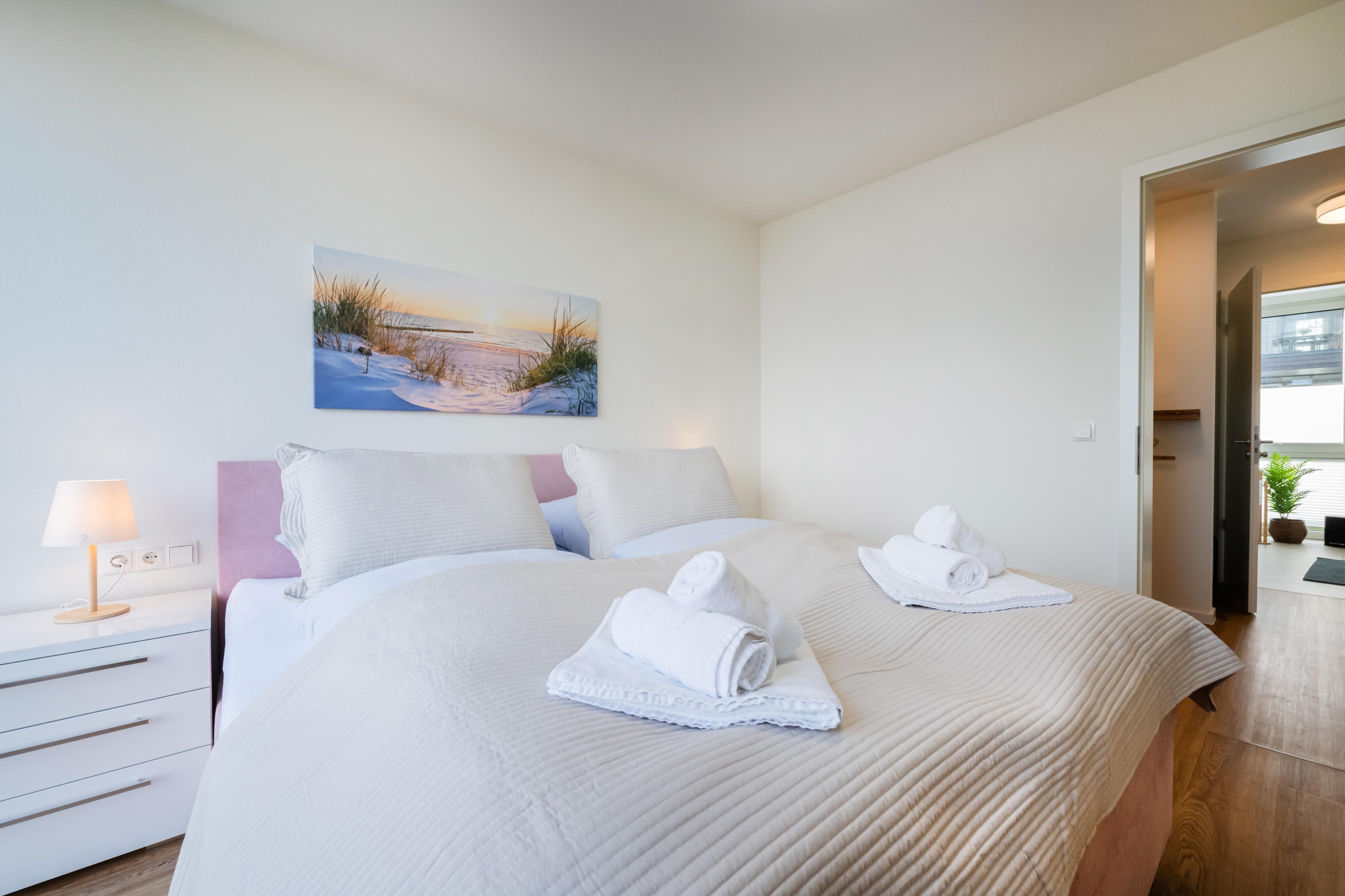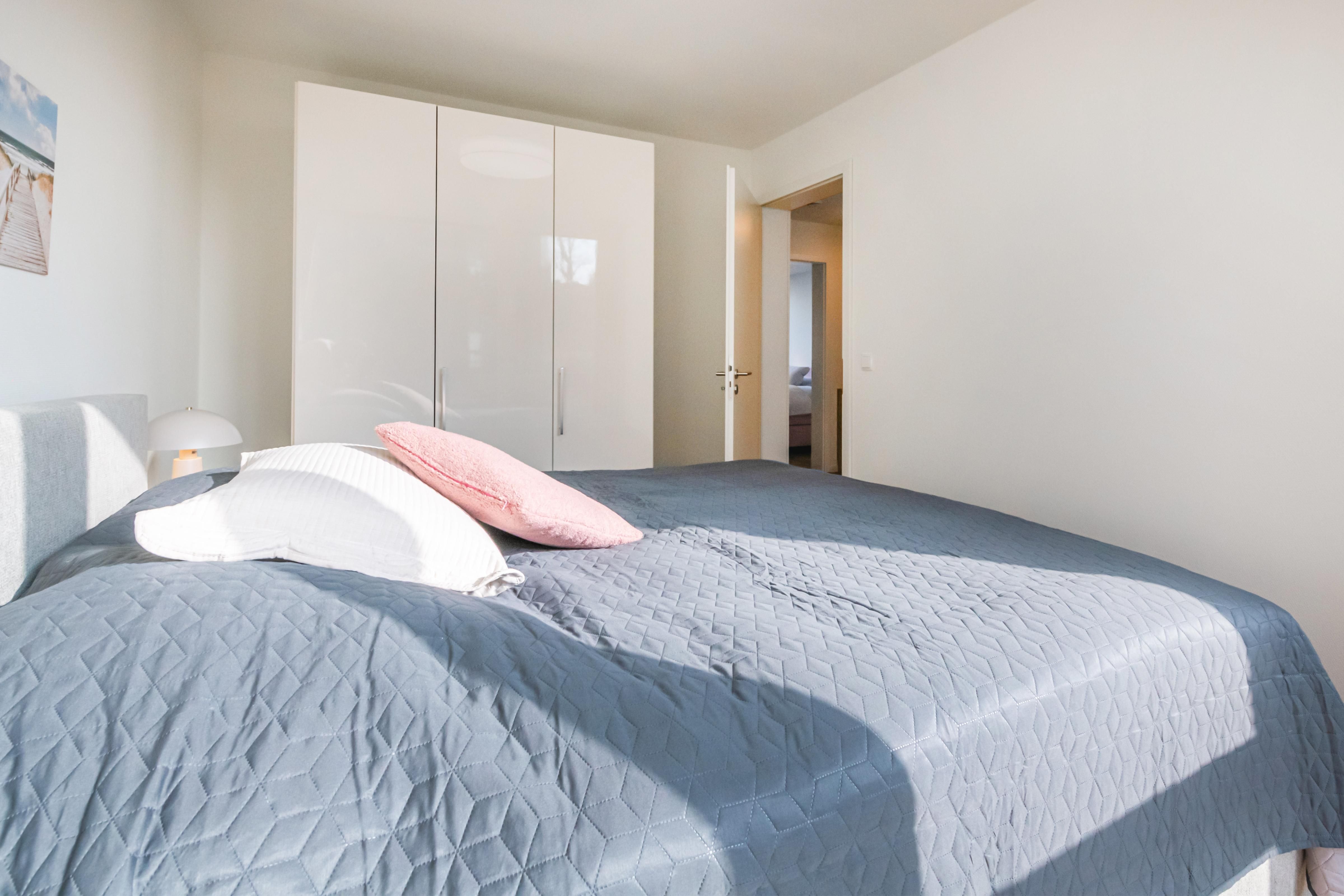 Zwei ruhige Schlafzimmer mit hochwertigen Boxspringbetten und Verdunklungsvorhängen sorgen für erholsame Nächte. Im Hauptschlafzimmer steht dir ein funktionaler Arbeitsplatz zur Verfügung – perfekt für Workation. Die durchdachte Farbgestaltung unterstützt eine entspannte Schlafumgebung.