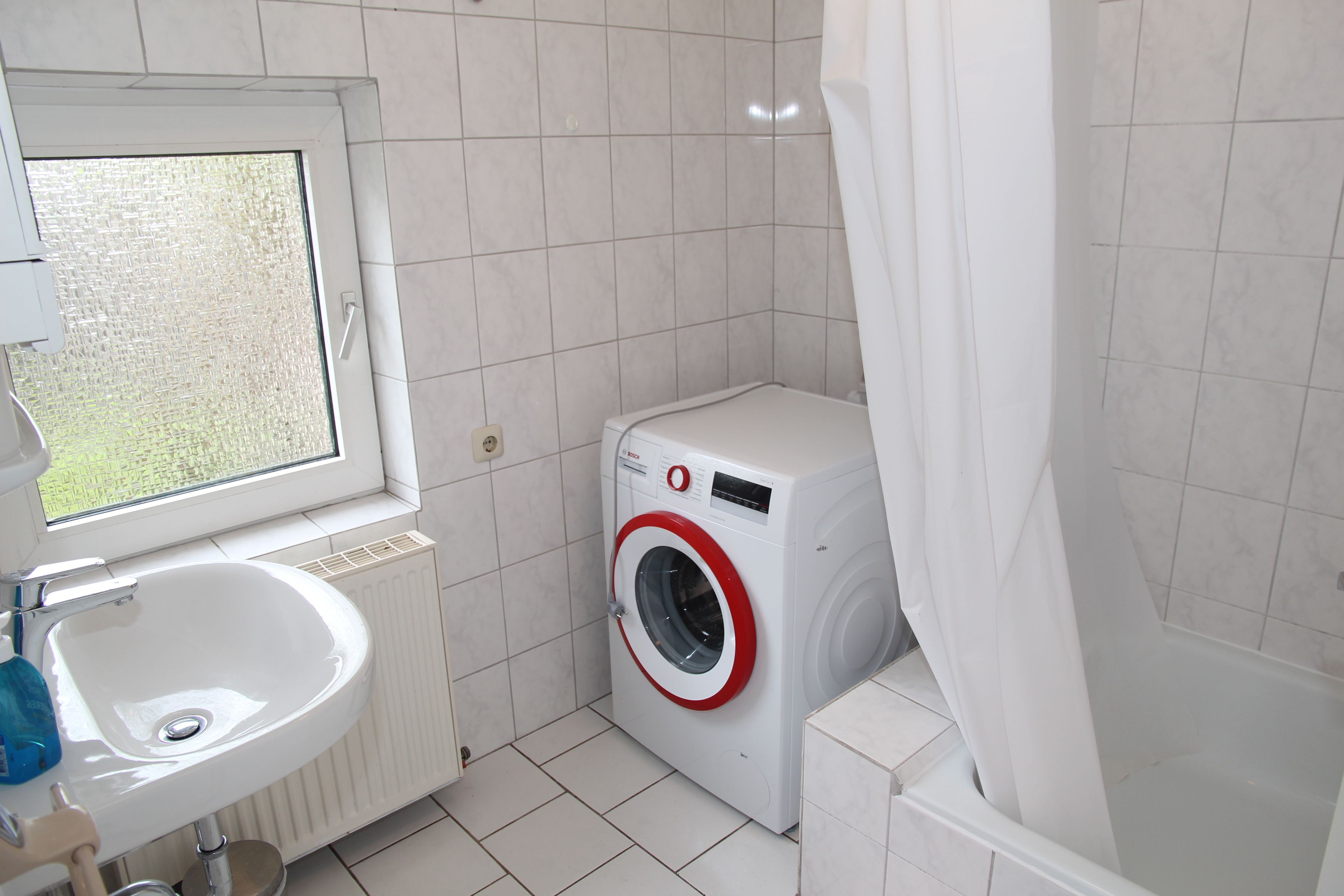 Im ehemaligen Stall, was auch der Eingangsbereich ist, befindet sich ein weiteres Gäste-WC und ein Badezimmer mit Dusche, Waschbecken und Waschmaschine. Dieser Gebäudeteil liegt etwas tiefer als der Rest der Wohnung und ist über ein paar Stufen miteinander verbunden.