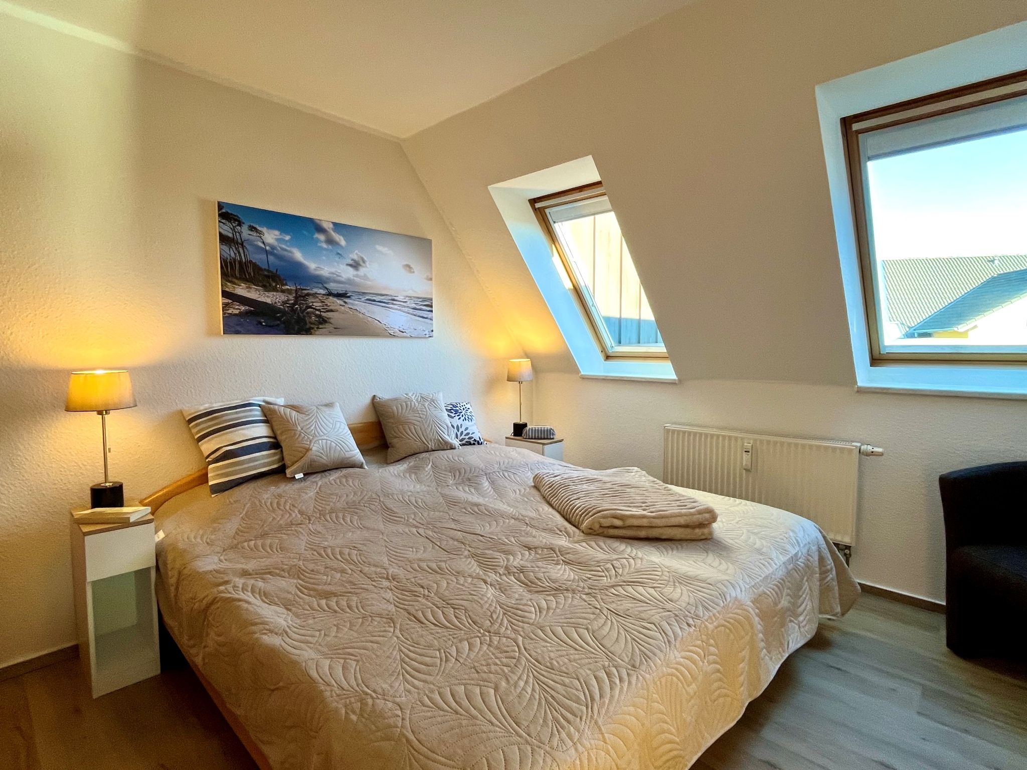 Das großzügige Wohnzimmer mit Essbereich geht in eine offene Küche über. Das Schlafzimmer ist mit einem Doppelbett ausgestattet, im Wohnbereich befindet sich ein gemütliches Schlafsofa.