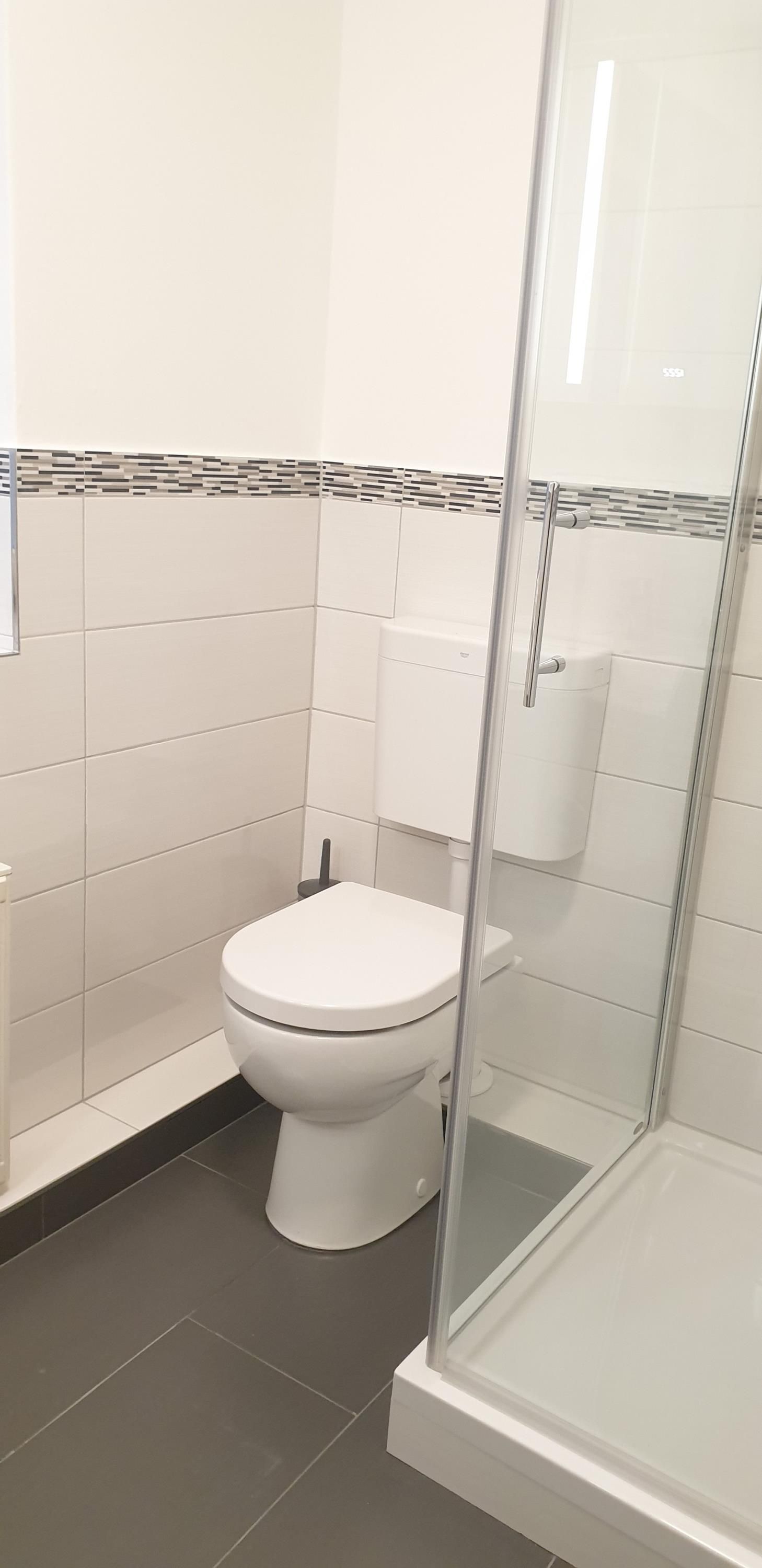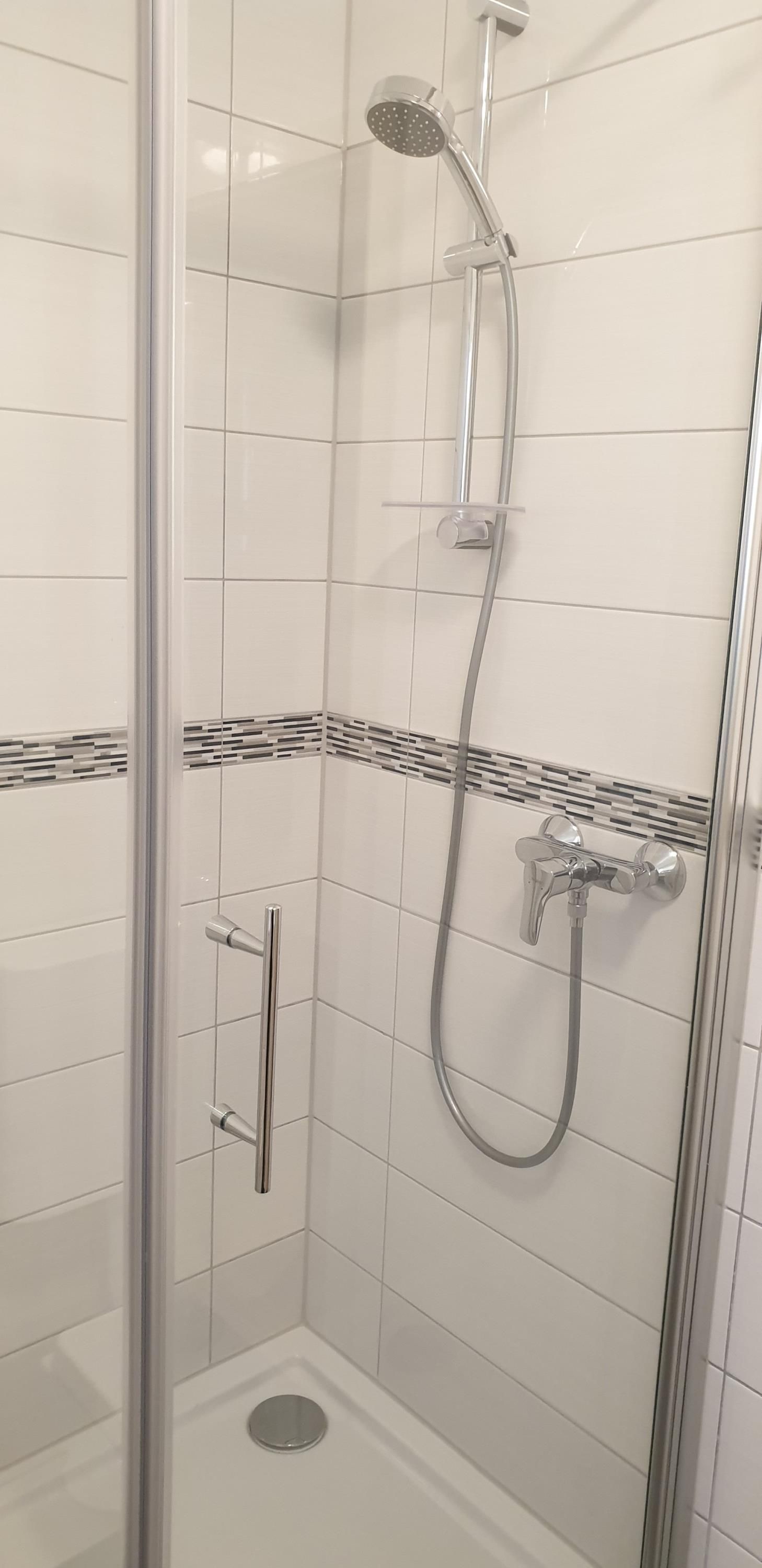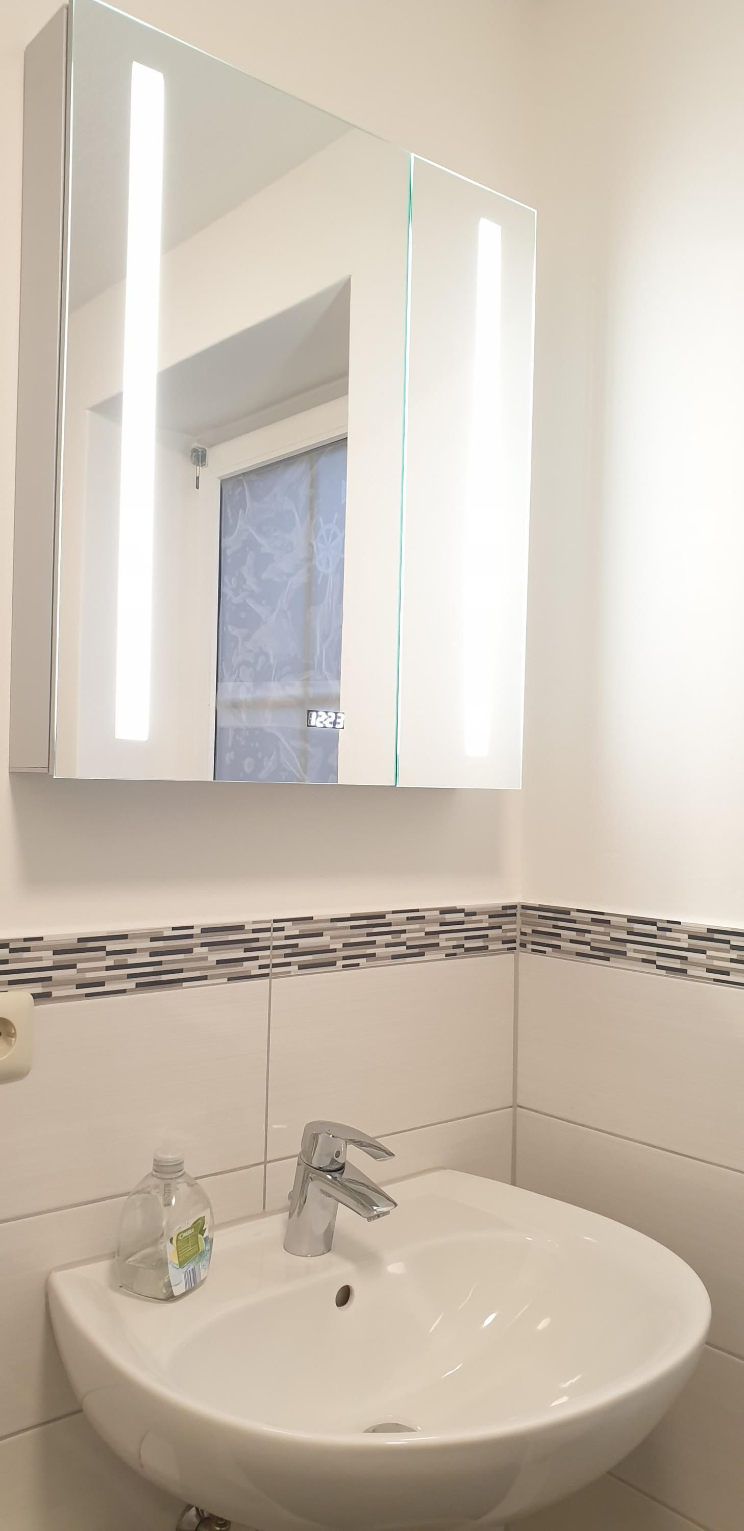 Das Bad ist funktional eingerichtet, mit Dusche, Waschbecken und WC – alles sauber, praktisch und zweckmäßig. Auch ein Föhn und ein Kosmetikspiegel sind vorhanden.