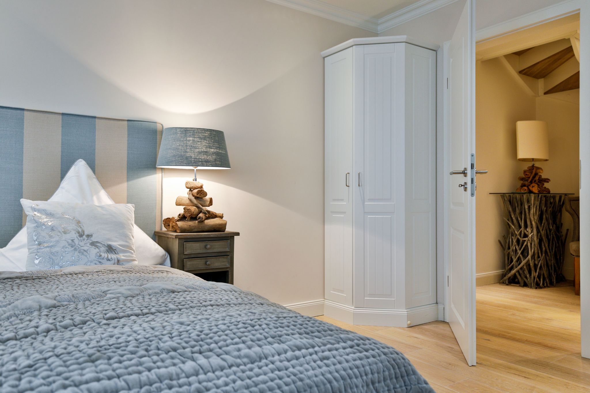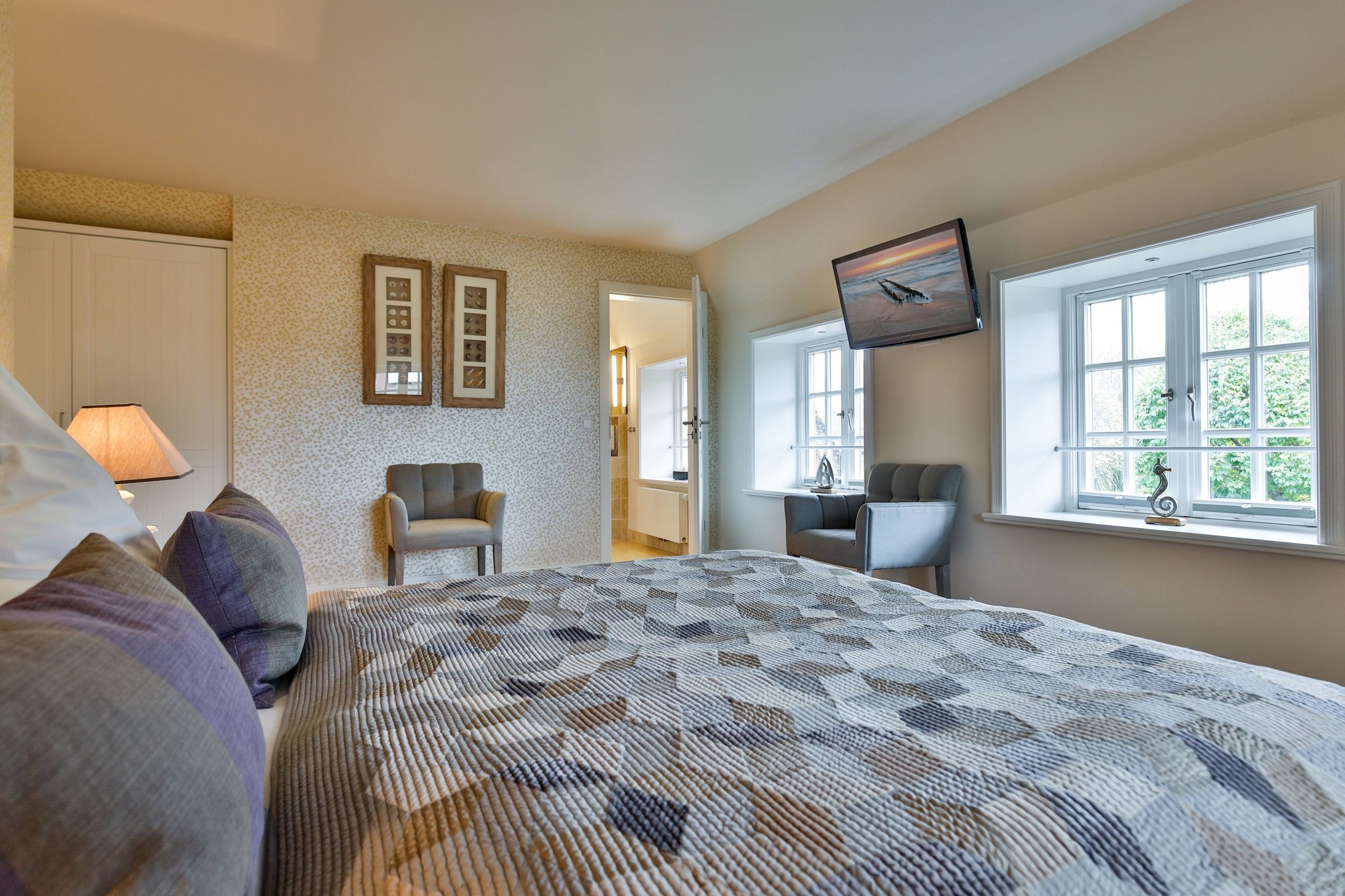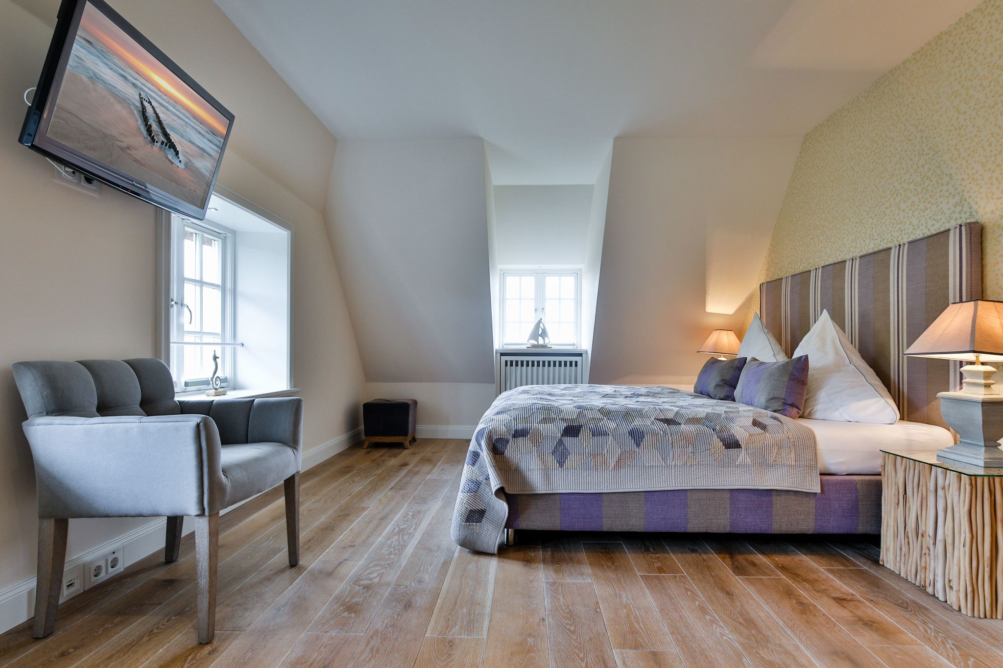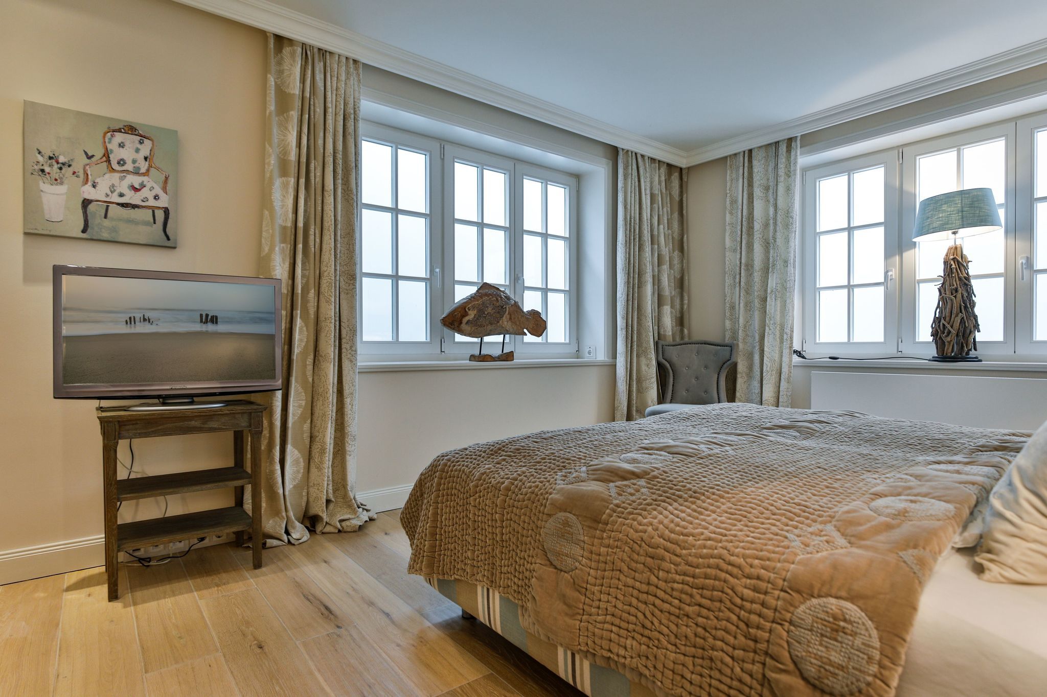 Schlafen 1: geräumiger Schlafraum mit Doppelbett (180cmx200cm) und TV, einmaliger Blick zum Wattenmeer sogar aus der alleinstehenden Badewanne, kleines Ankleidezimmer