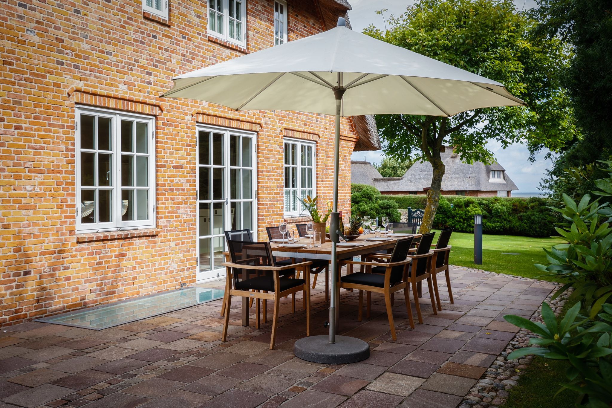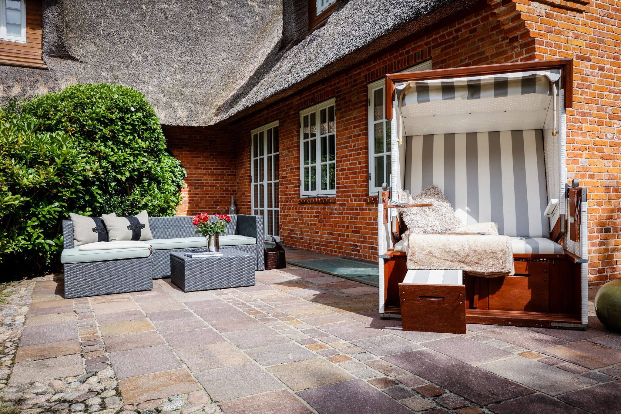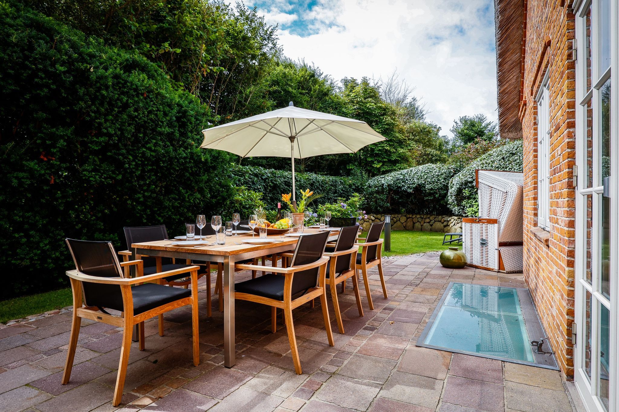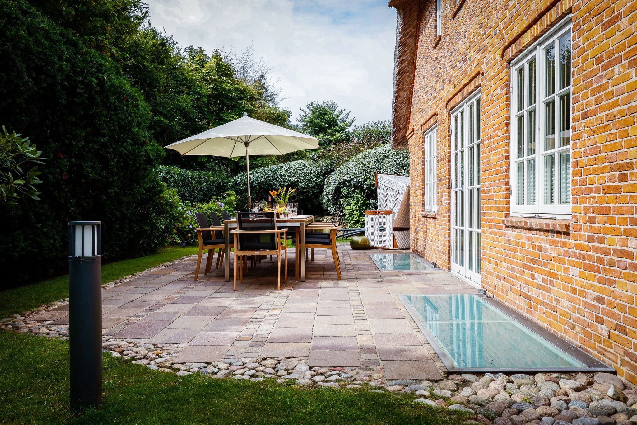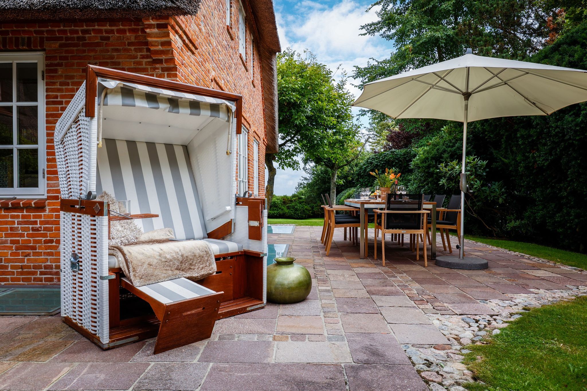 Das Haus ist hochwertig und exklusiv ausgestattet und von einem großzügigen Garten umgeben. Selbstverständlich ist dieses Haus mit 5 Sternen des DTV klassifiziert. Diese mit Reet gedeckte Doppelhaushälfte mit Einzelhaus-Charakter liegt fußläufig zur Keitumer St. Severin und in unmittelbarer Nähe zum Wattenmeer. Der Blick auf das Wattenmeer ist traumhaft. Das helle und großzügige Haus über drei Ebenen (EG, OG, Souterrain) ist ca. 280 m² groß und bietet zwei bis acht Personen ausreichend Platz. Das geräumige und hochwertige Objekt liegt auf einem insgesamt etwa 1.000 m² Grundstück südlich der St. Severin Kirche in Keitum. Das exklusive Doppelhaus wurde mit aufgearbeiteten Ziegelsteinen von 1886 erbaut. Die Räumlichkeiten im Erdgeschoß sind mit großflächigen sehr hochwertigen Natur Limestone ausgelegt, im Obergeschoß liegen Echtholzeichendielen, das gesamte Souterrain und die Bäder sind ebenfalls mit Limestone und Holzboden verlegt. Im Erdgeschoss und im Souterrain ist jeweils eine Fussbodenerwärmung integriert, zusätzlich sind auch Heizkonvektoren in allen Räumen angebracht. Auf allen Ebenen finden Sie hochwertige Tischlereinbauten. Darüber hinaus bietet das Haus jeglichen Komfort wie Sauna mit Ruheraum, Gaskamin, Flat-TV's (streamingfähig) mit Soundbar, WLAN (High-Speed Internet), alle Schlafzimmer und Wohnzimmer mit Flachbildschirmen, Alarmanlage, Geschirrspüler, Mikrowelle, Backofen, Kühlschrank, Nespresso Kaffeemaschine, Soda-Stream, Induktionsherd,Hauswirtschaftsraum mit Waschmaschine und Trockner, Safe und zwei Pkw-Stellplätze. Bademäntel sind für Sie in diesem Domizil kostenfrei. Die Betten sind jeweils 1,80 x 2,00 m. Das Haus ist von einem großzügigen gepflegten Garten mit zwei Terrassen und Friesenwällen umgeben.