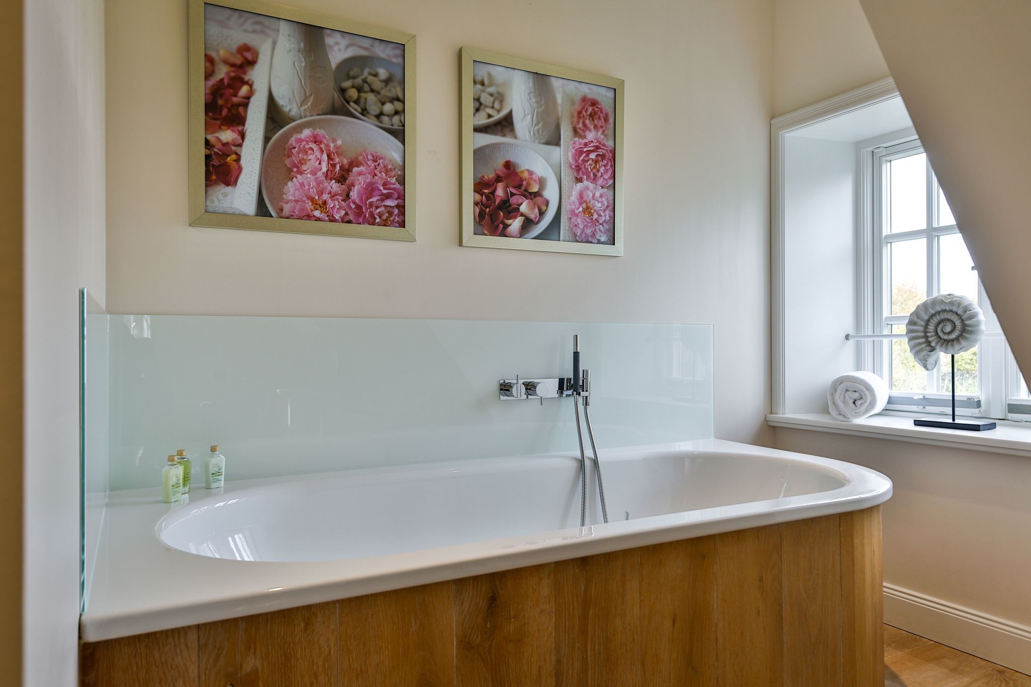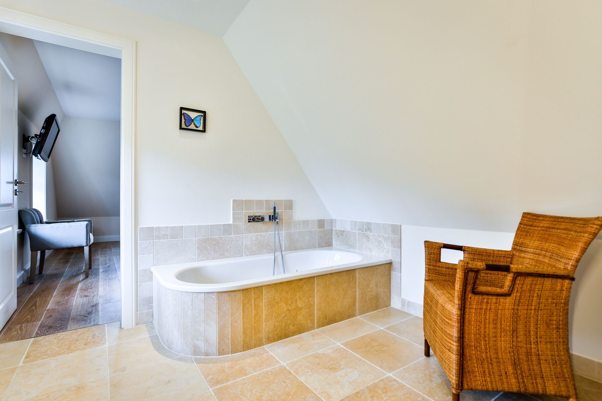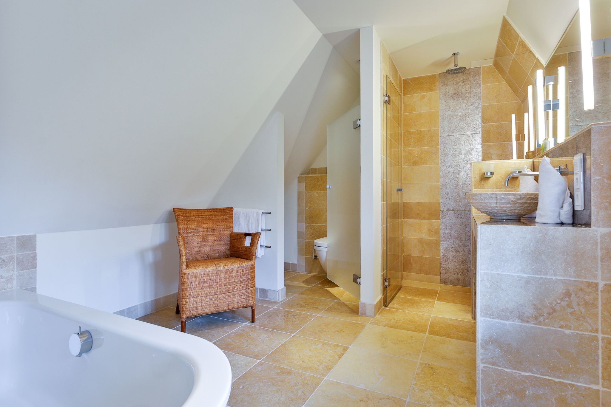 Bad 2: helles en Suite Bad mit Dusche und Badewanne, Handtuchwärmer