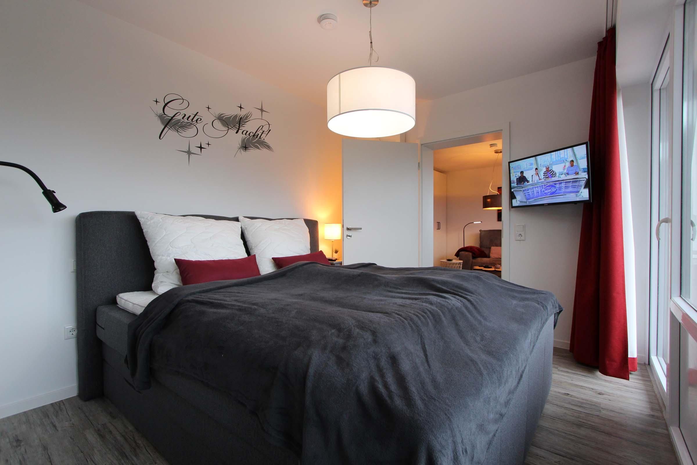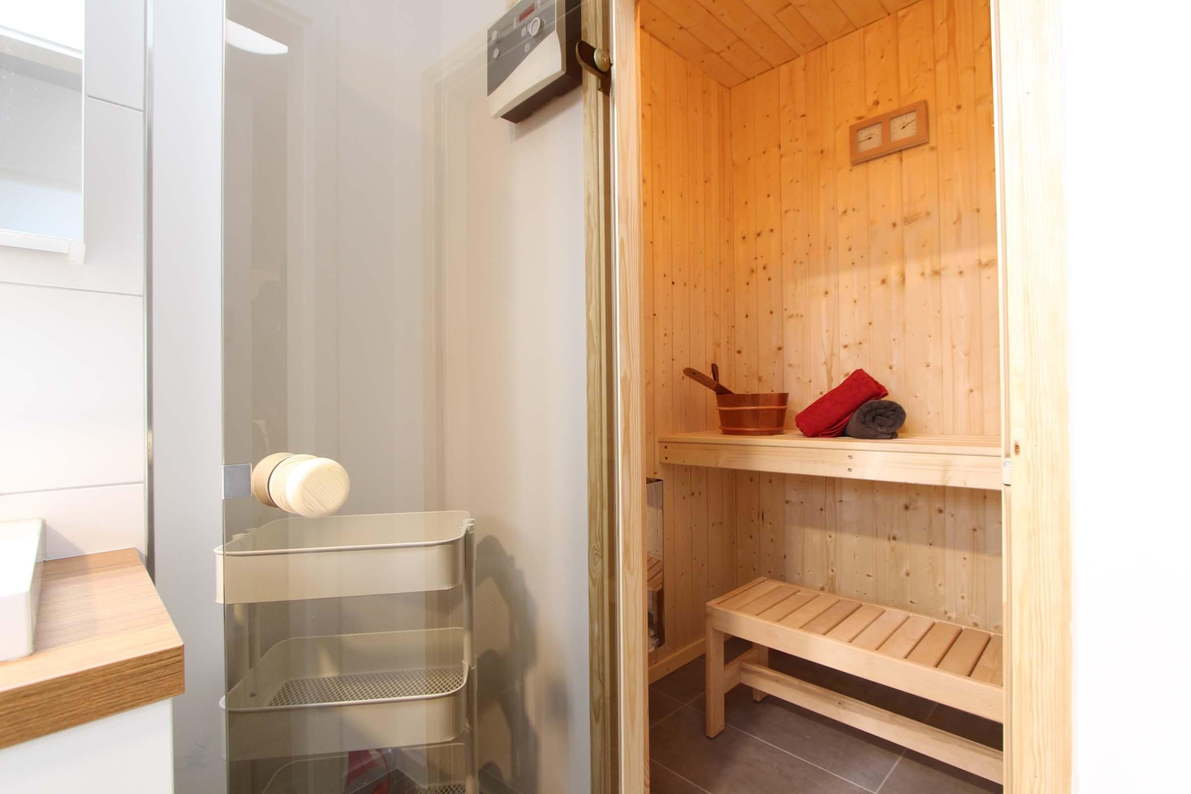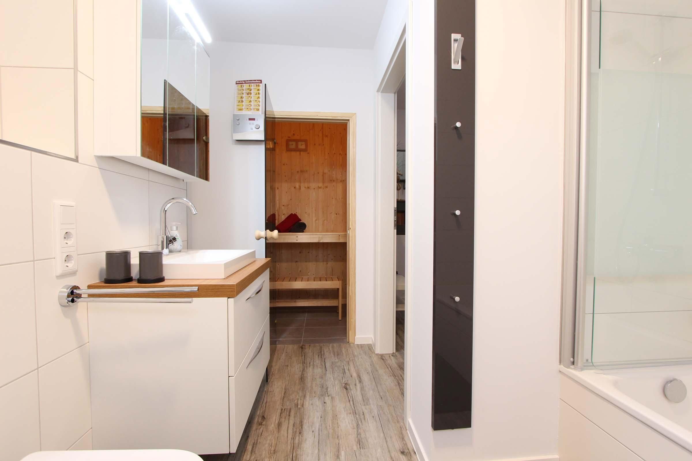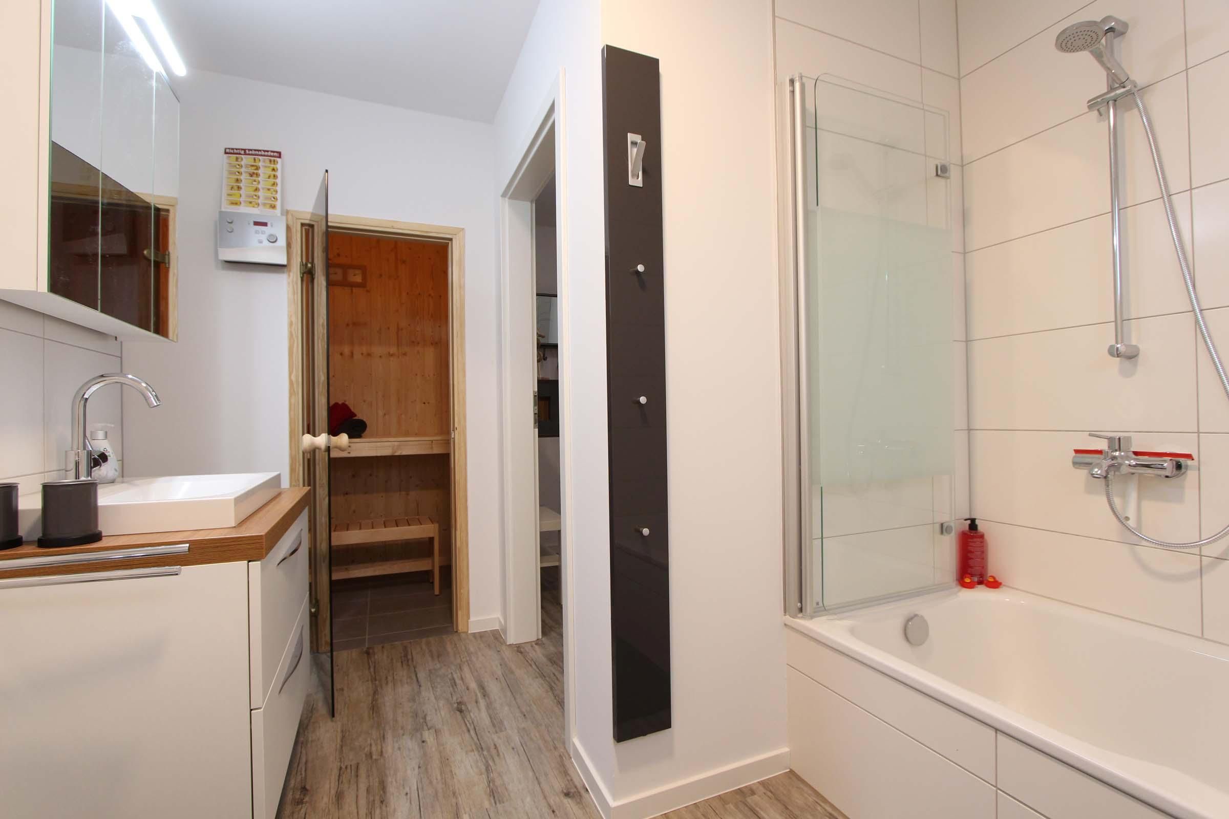Herrlich ausschlafen: Ihr Schlafzimmer ist mit einem modernen Boxspringbett möbliert, damit Sie sich im Urlaub gut erholen können. Auch das Bad ist komfortabel ausgestattet: Neben Dusche und Badewanne dürfen Sie gern auch in der eingebauten Sauna entspannen. Waschmaschine und Trockner stehen für die Wäsche zwischendurch bereit.