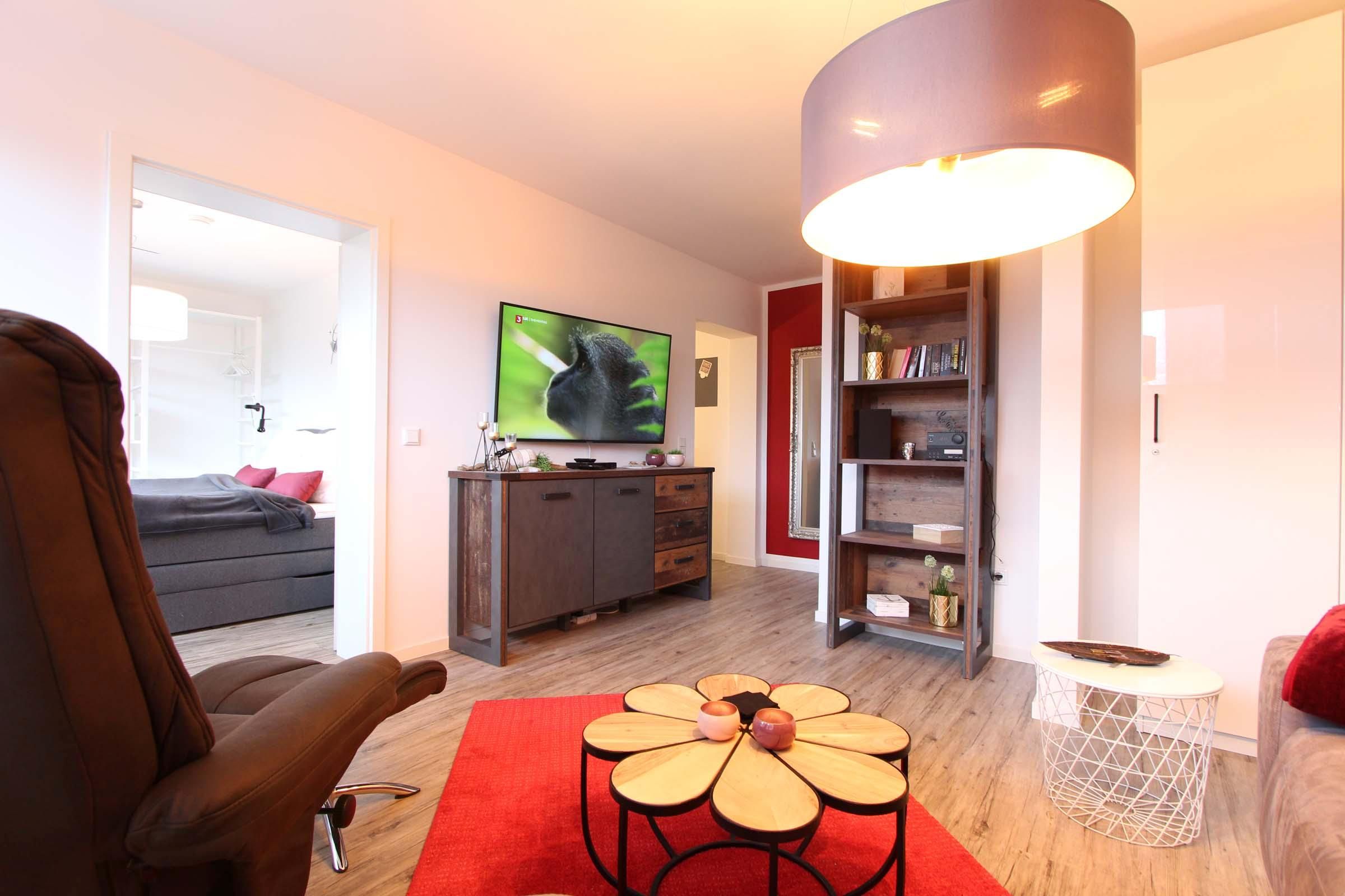 Die gemütliche 3-Zimmer-Ferienwohnung bietet eine komfortabel ausgestattete Küche: Neben Induktionskochfeld und Backofen stehen zum Kochen auch Mikrowelle und diverse moderne Küchengeräte zur Verfügung. Auch die Ausstattung der übrigen Räume – Wohnzimmer, Schlafzimmer und Kinderzimmer - lässt nichts zu wünschen übrig.