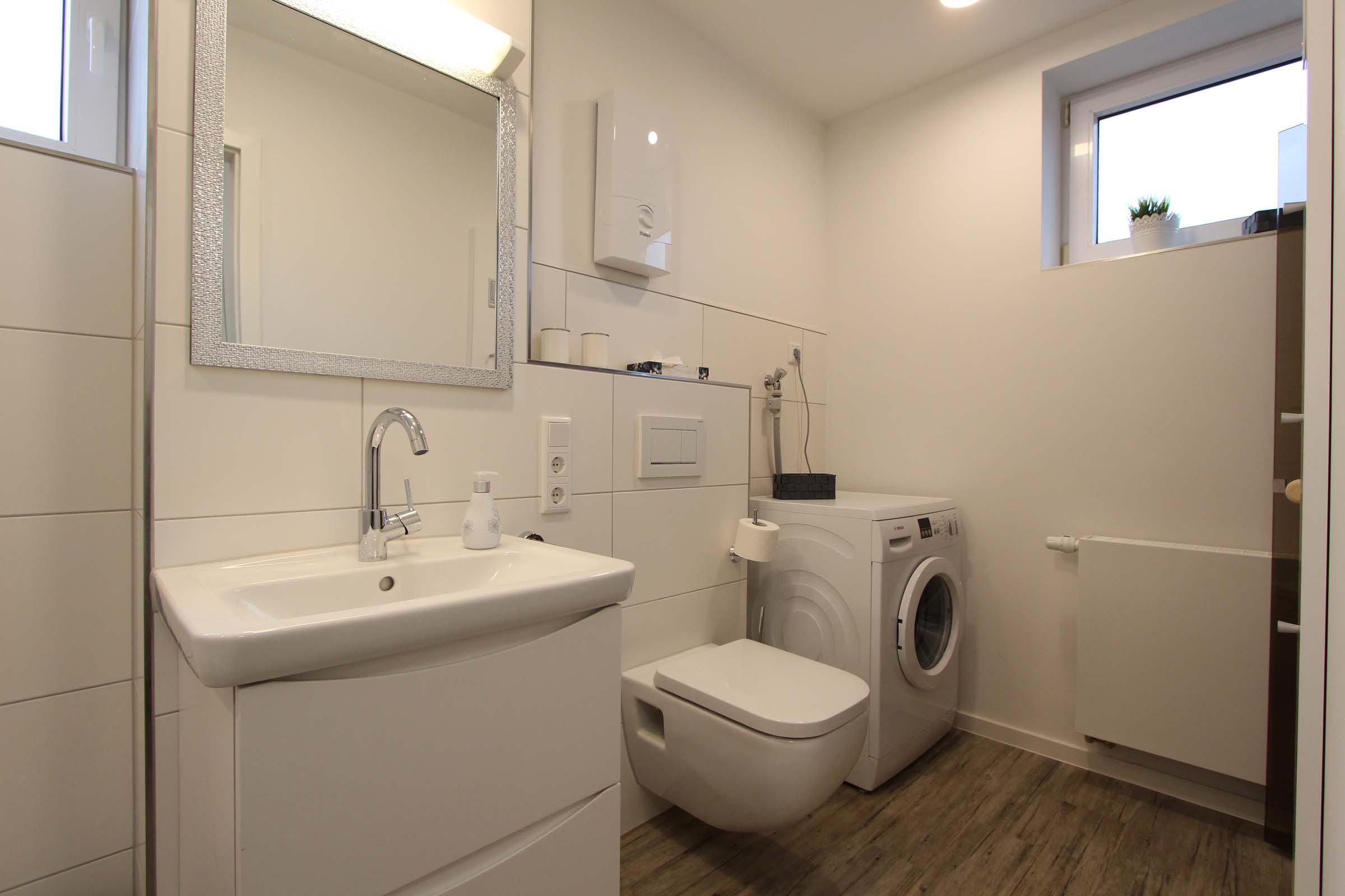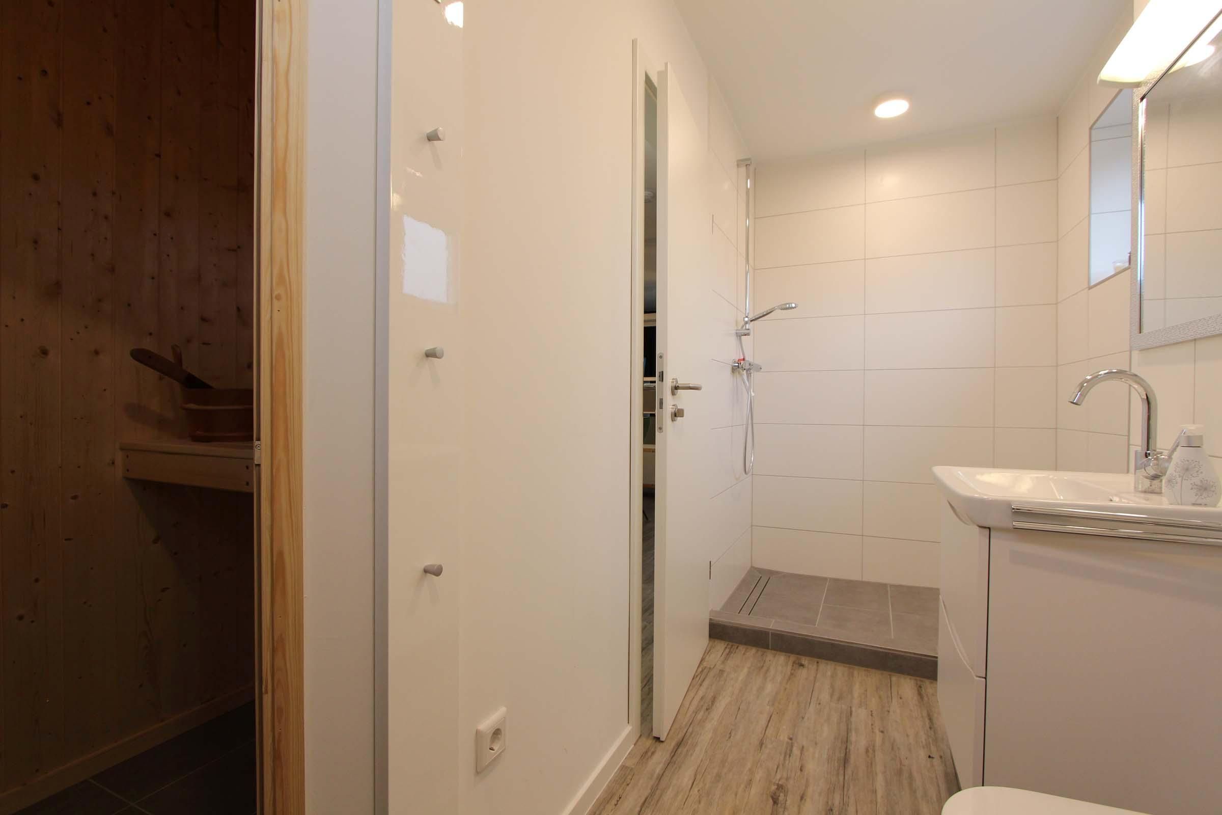 Das Bad ist mit einer begehbaren Dusche und Sauna ausgestattet. Für die Wäsche zwischendurch steht eine Waschmaschine zur Verfügung. Für Ihre Fahrräder halten wir einen Abstellraum bereit.
