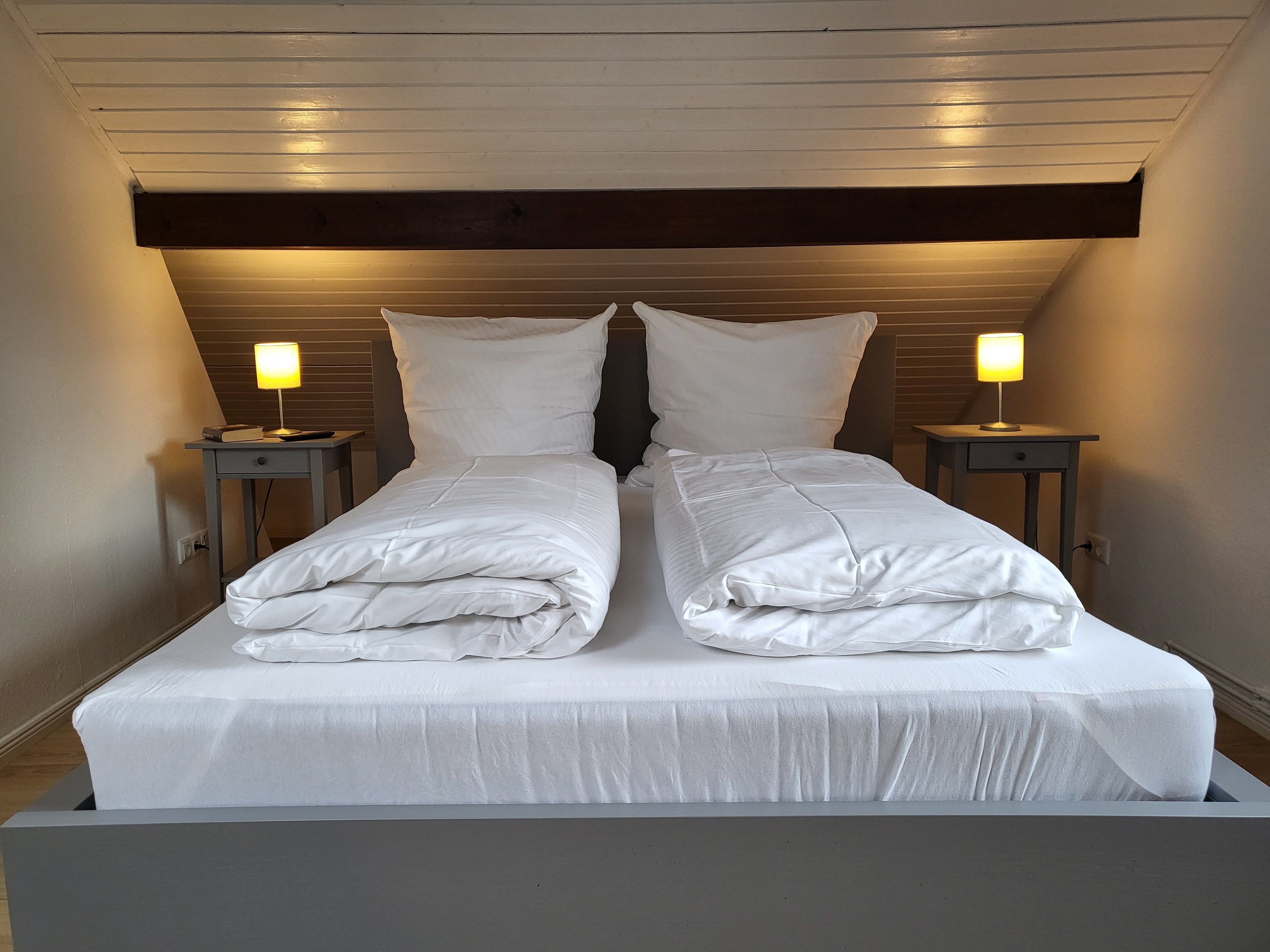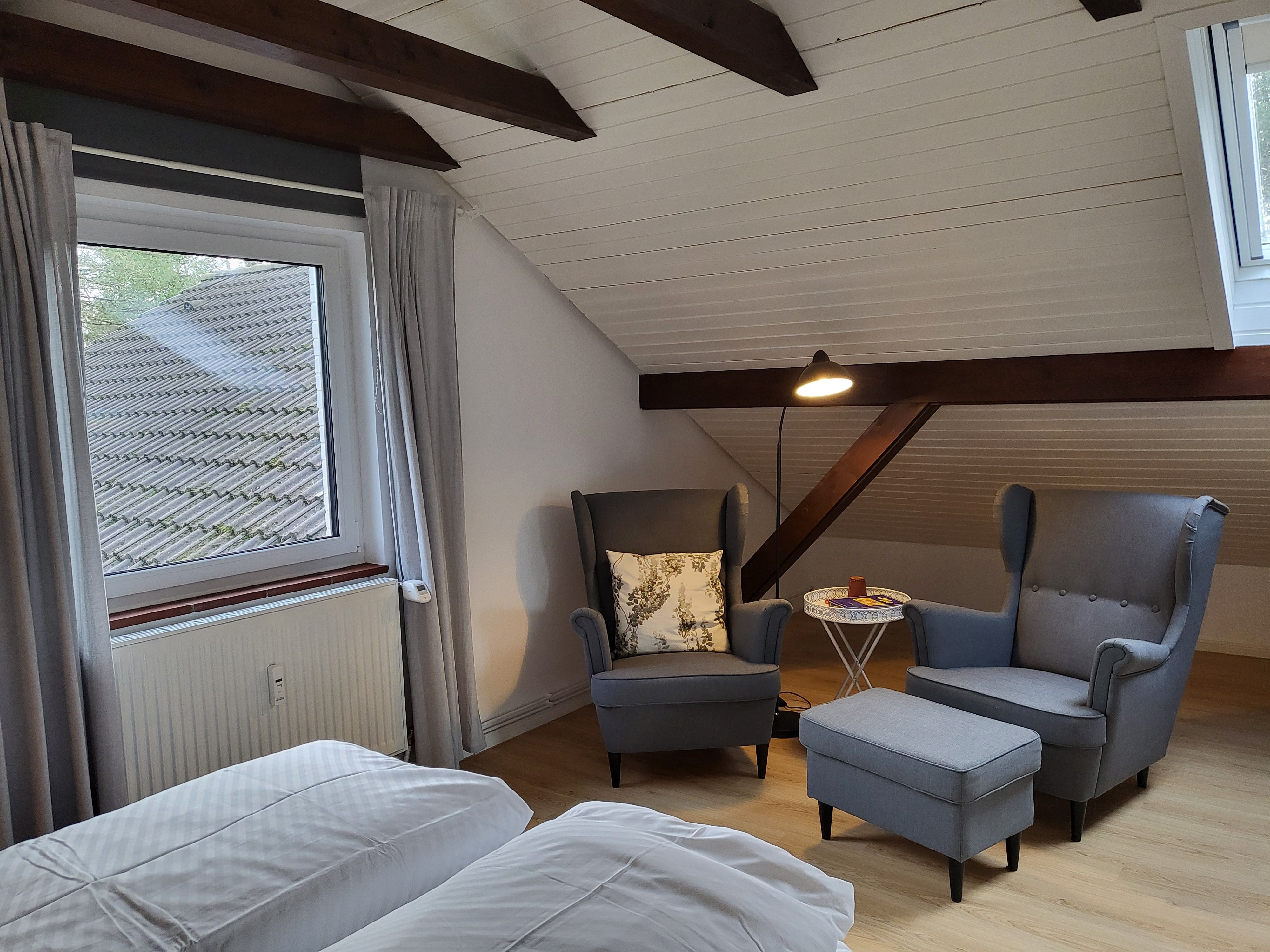 Über eine urige Holztreppe gelangen Sie in das helle Schlafzimmer mit schönen Holzbalken versehen. Das große Schlafzimmer ist mit einem bequemen Bett (160x200), zwei gemütlichen Sesseln, einer Kommode und einem Smart-TV (Magenta TV) ausgestattet.