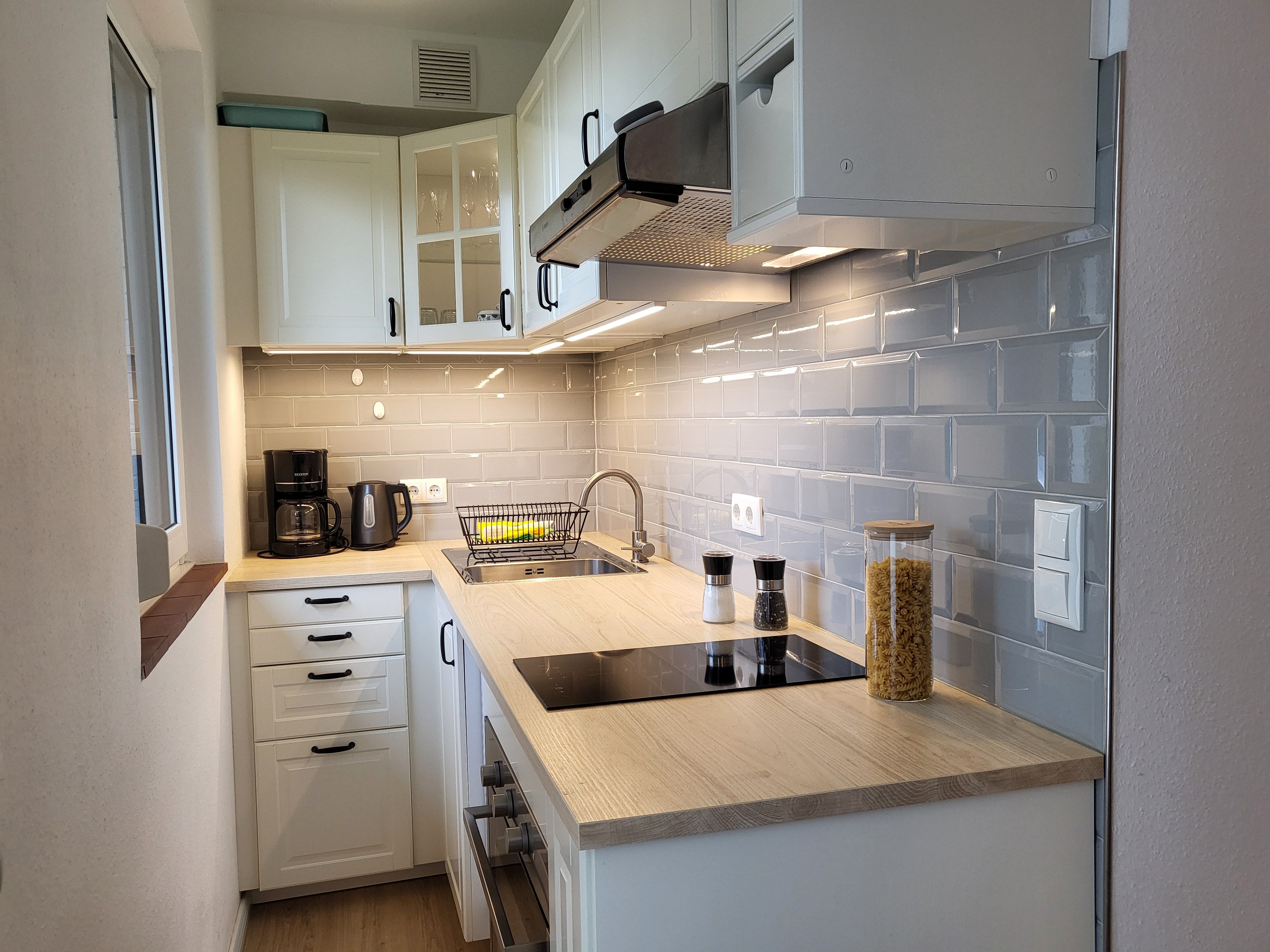 Die moderne Küche ist perfekt ausgestattet mit einem Induktionskochfeld, Backofen, Kühlschrank, Kaffeemaschine, Wasserkocher und Toaster – hier können Sie sich schnell ein leckeres Frühstück zubereiten, bevor Sie an den Sandstrand aufbrechen. Das stilvolle Badezimmer bietet eine Dusche mit Wanne, WC und Waschbecken, sodass Sie nach einem aktiven Tag am Strand erfrischt und entspannt zurückkommen können.