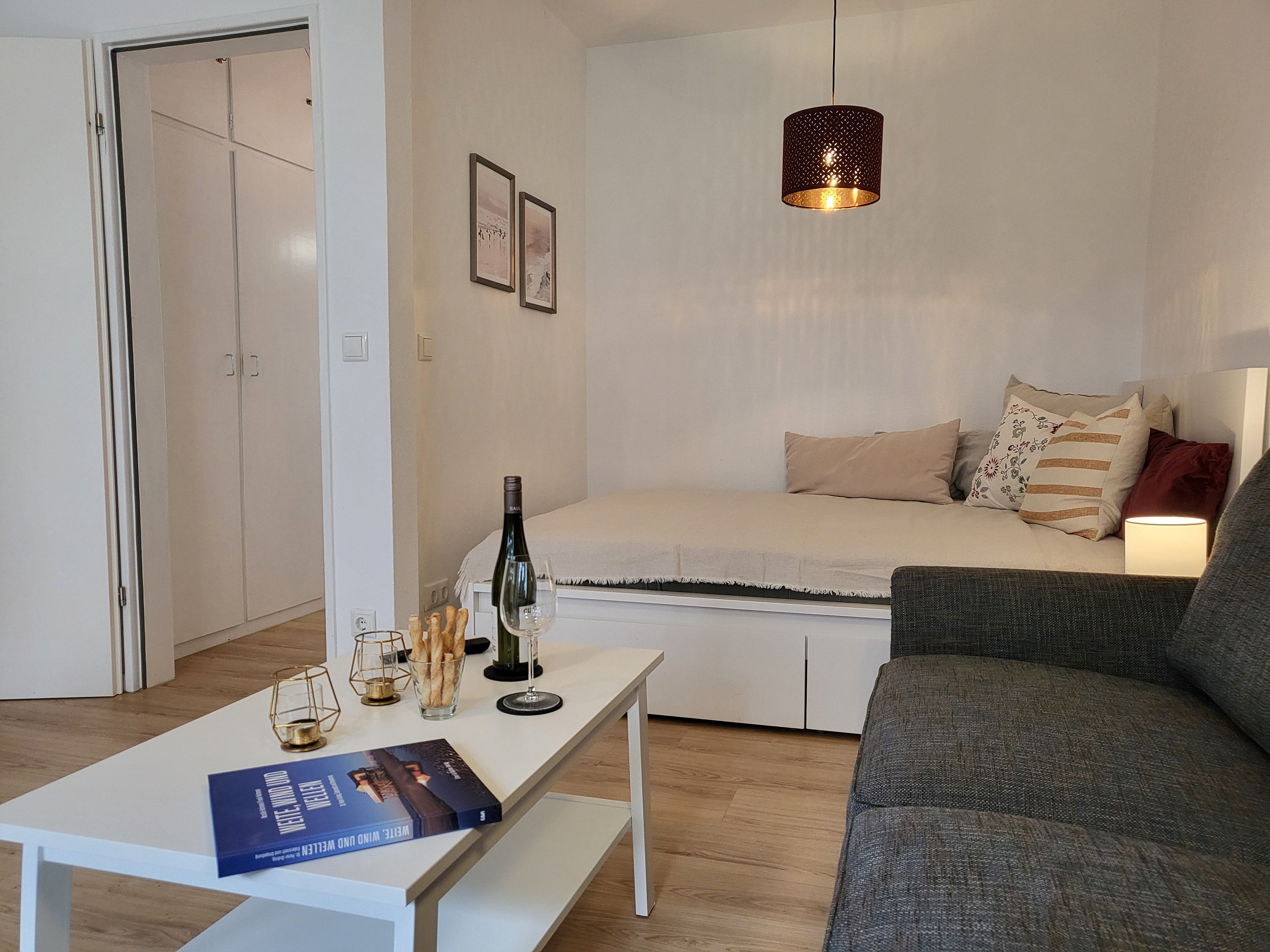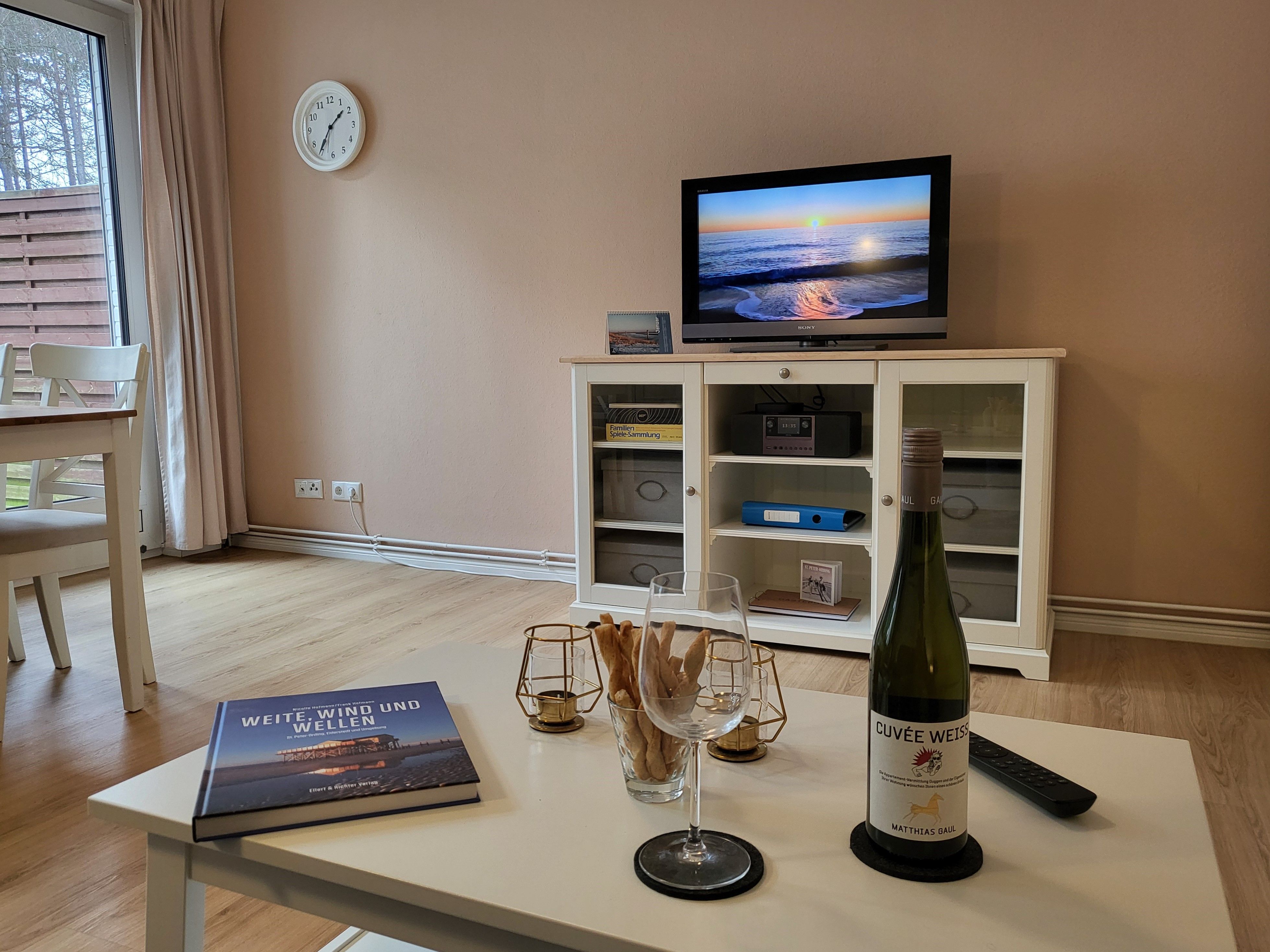 Der großzügige Wohnbereich ist mit einem gemütlichen Sofa, einem Esstisch und einem Smart-TV (Magenta TV) ausgestattet, sodass Sie sowohl entspannen als auch gemeinsame Mahlzeiten genießen können.