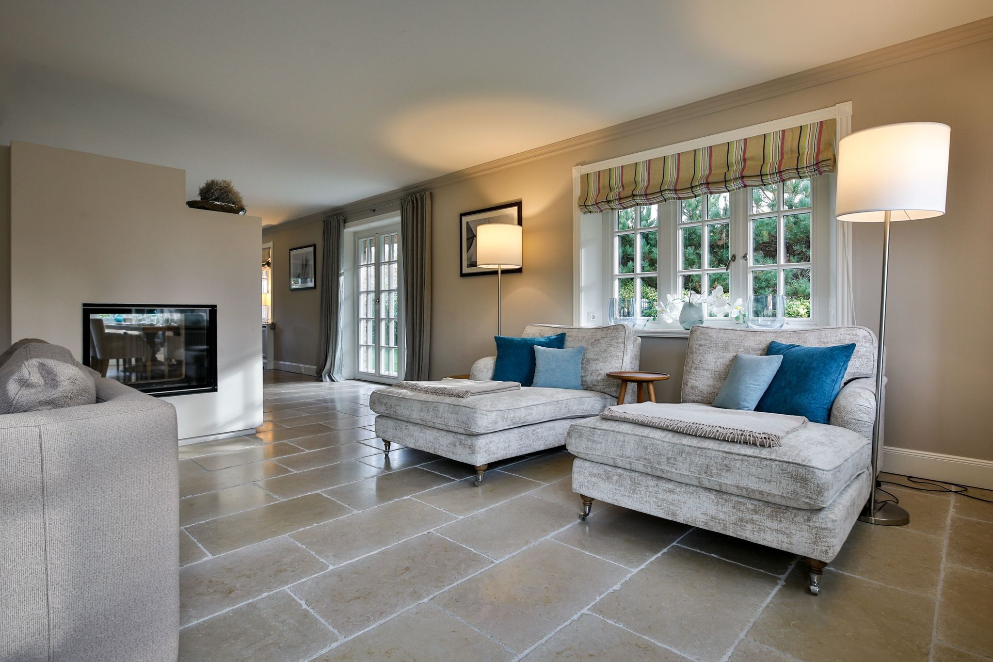 Wohn-/Essbereich: Essbereich mit großem Tisch mit 8 Stühlen für die ganze Familie, geräumiger Wohnbereich mit großer Eckcouch und zwei Sesseln, sowie zwei Recamiere, doppelseitigen dekorativer Kamin