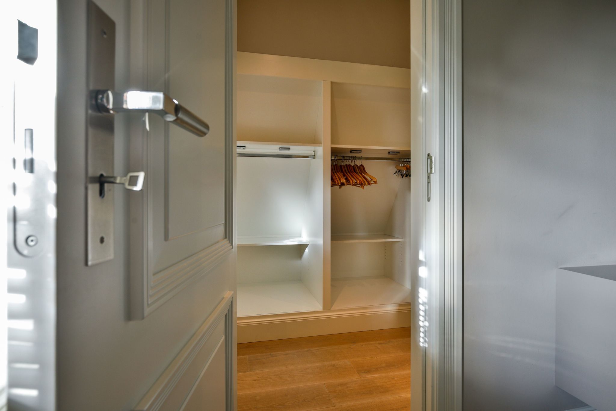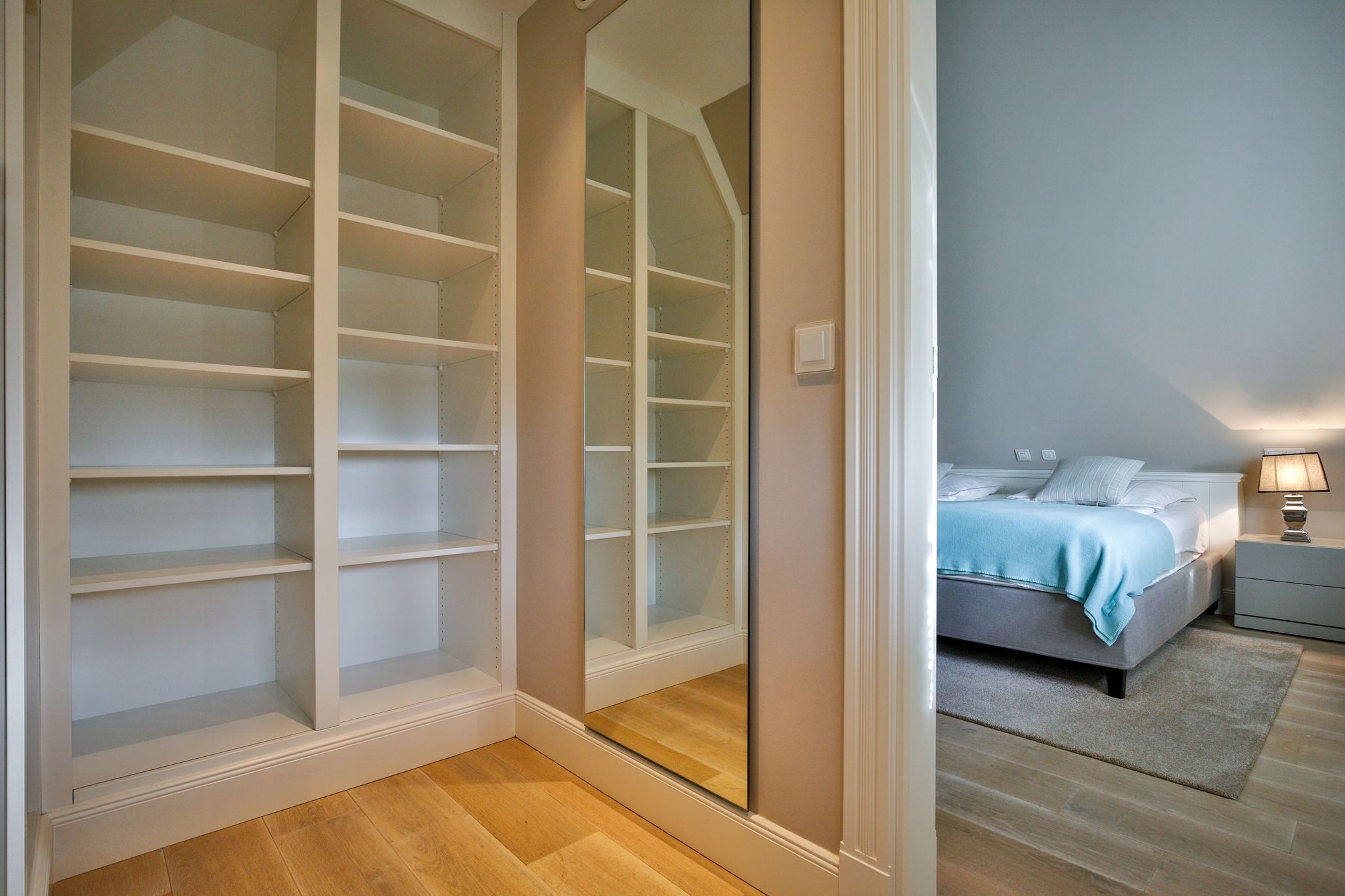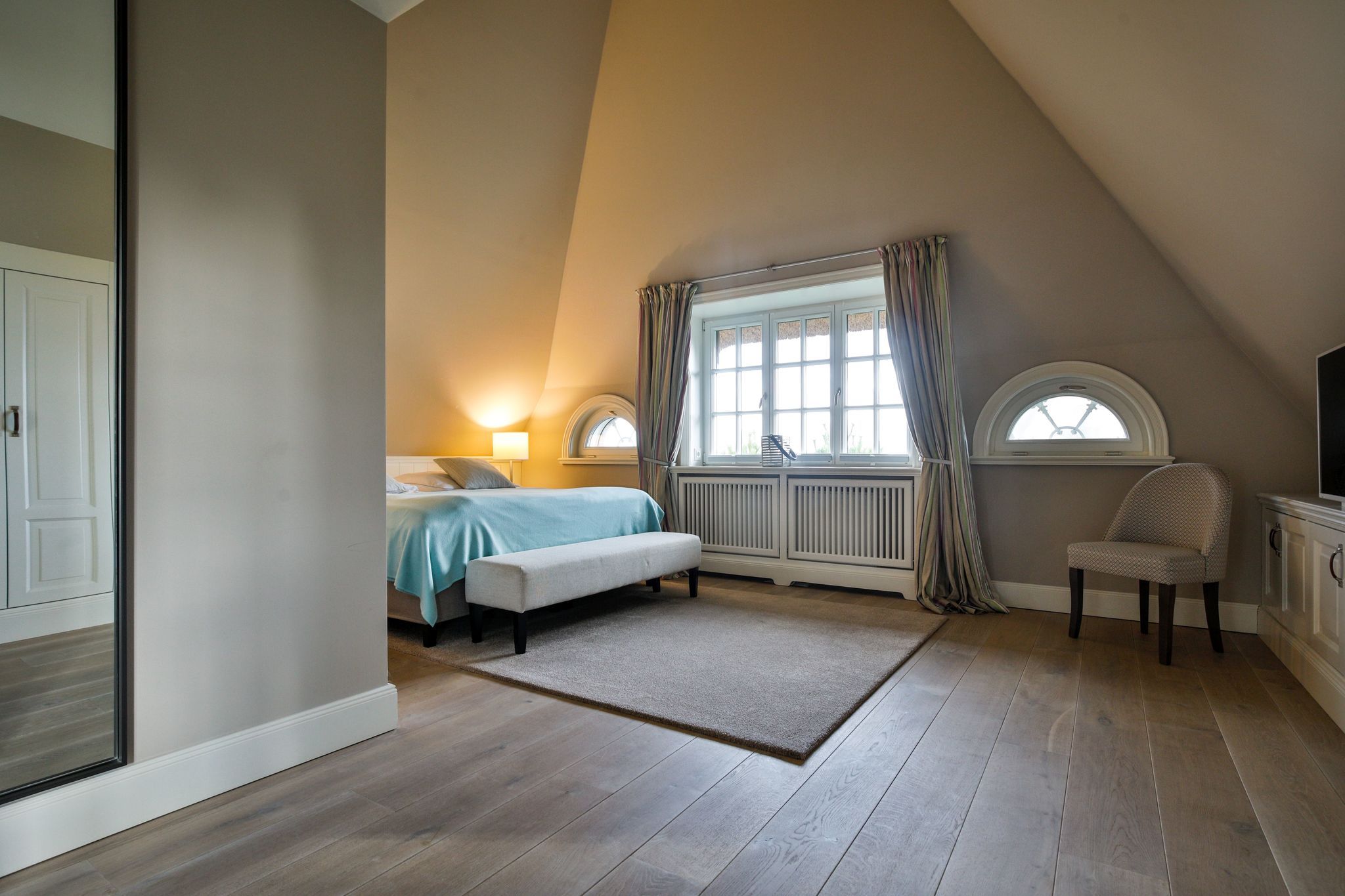 Schlafen 2: geräumiger Schlafraum mit Doppelbett, TV, kleines Ankleidezimmer mit Spiegel, nach oben offenem Giebel