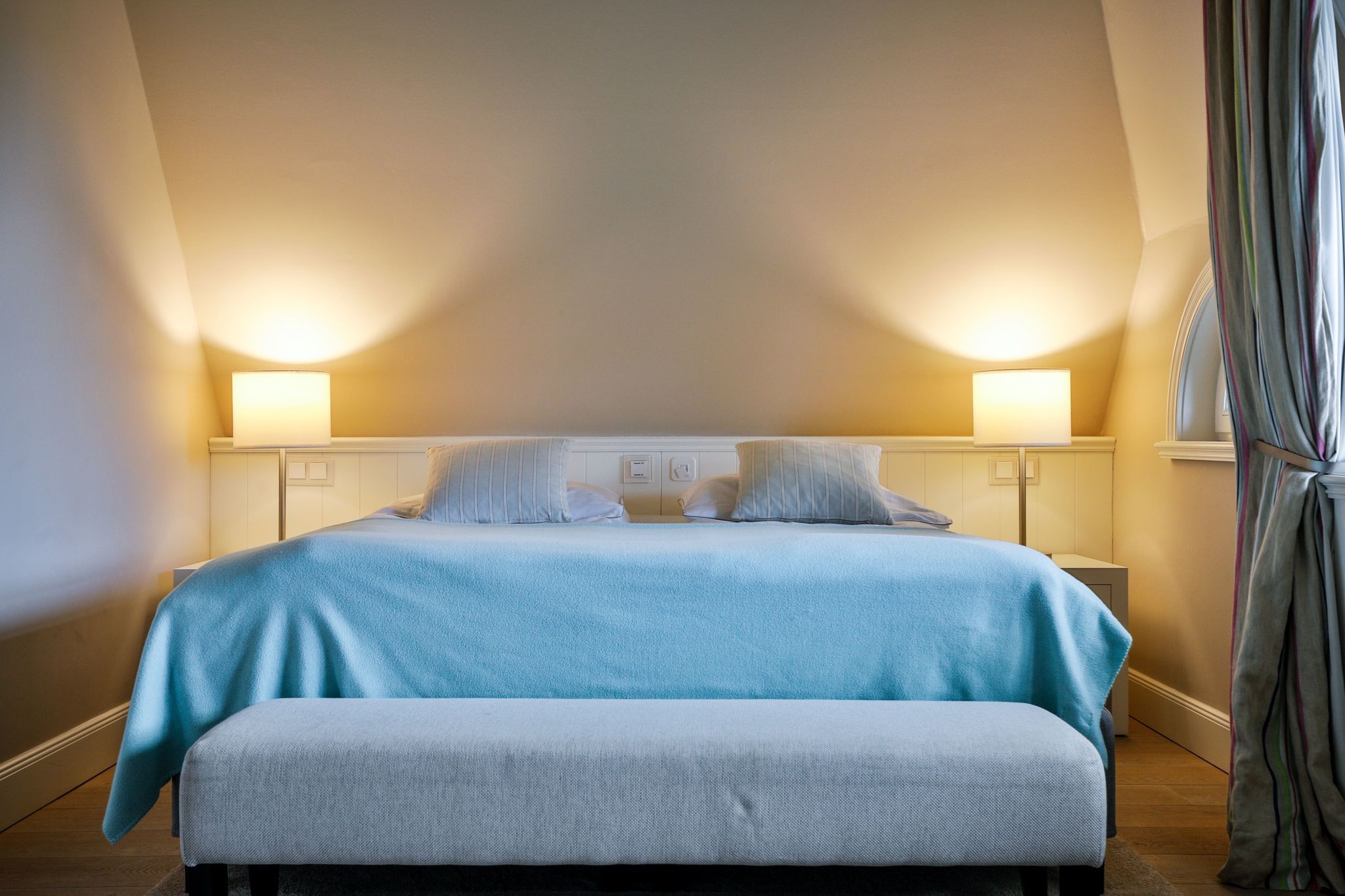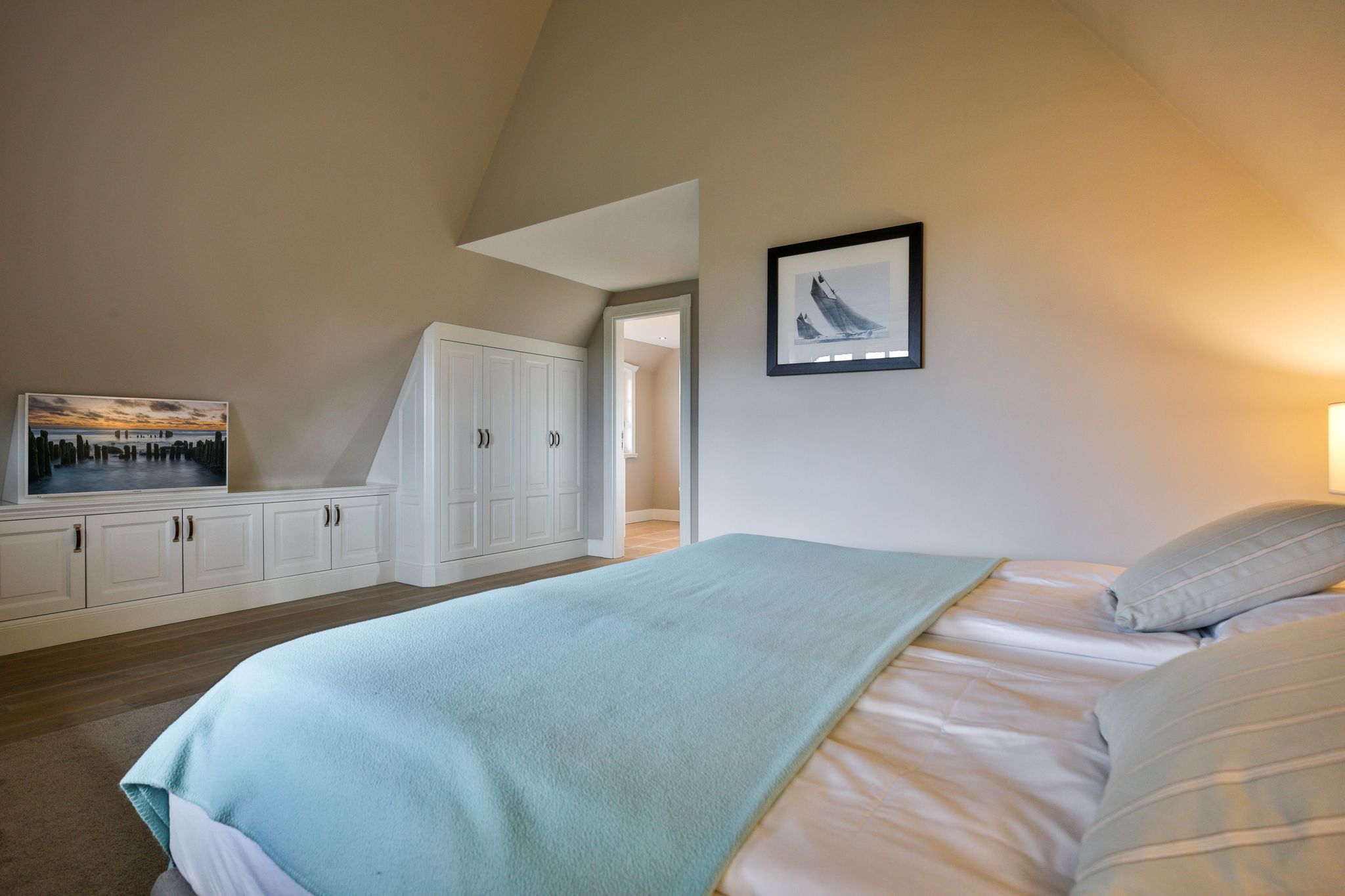 Schlafen 1: geräumiger Schlafraum mit Doppelbett, Einbauschrank, TV, nach oben offenem Giebel