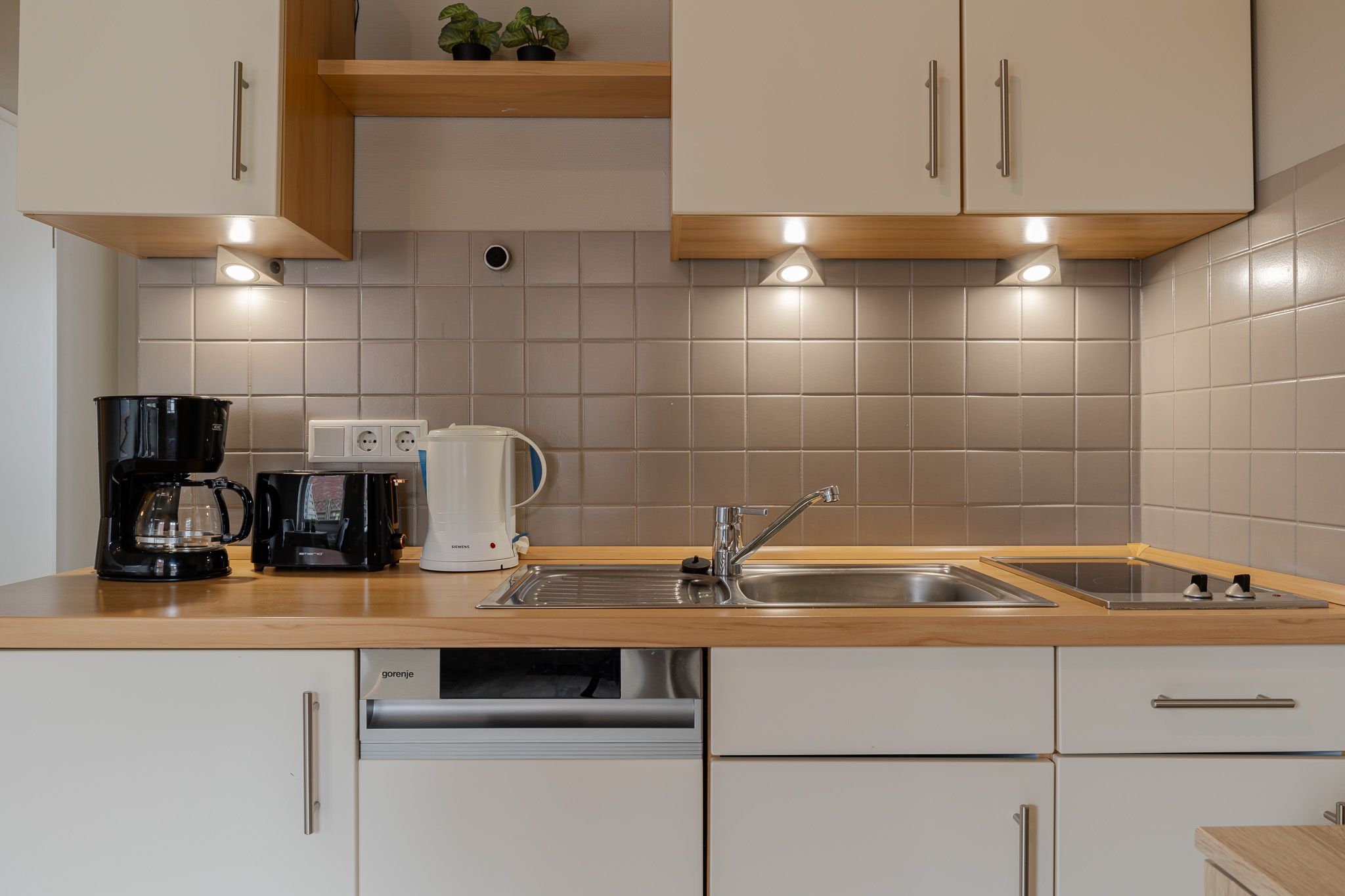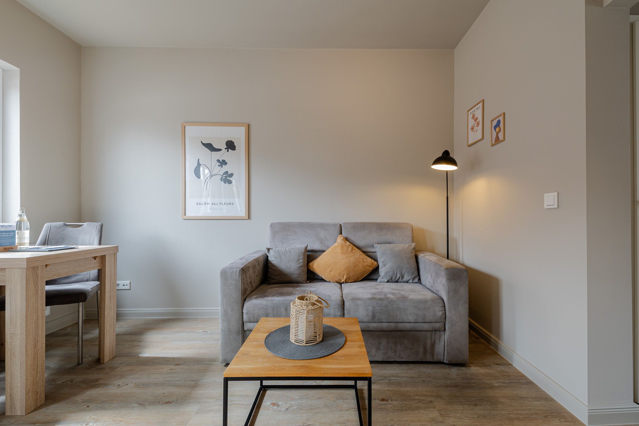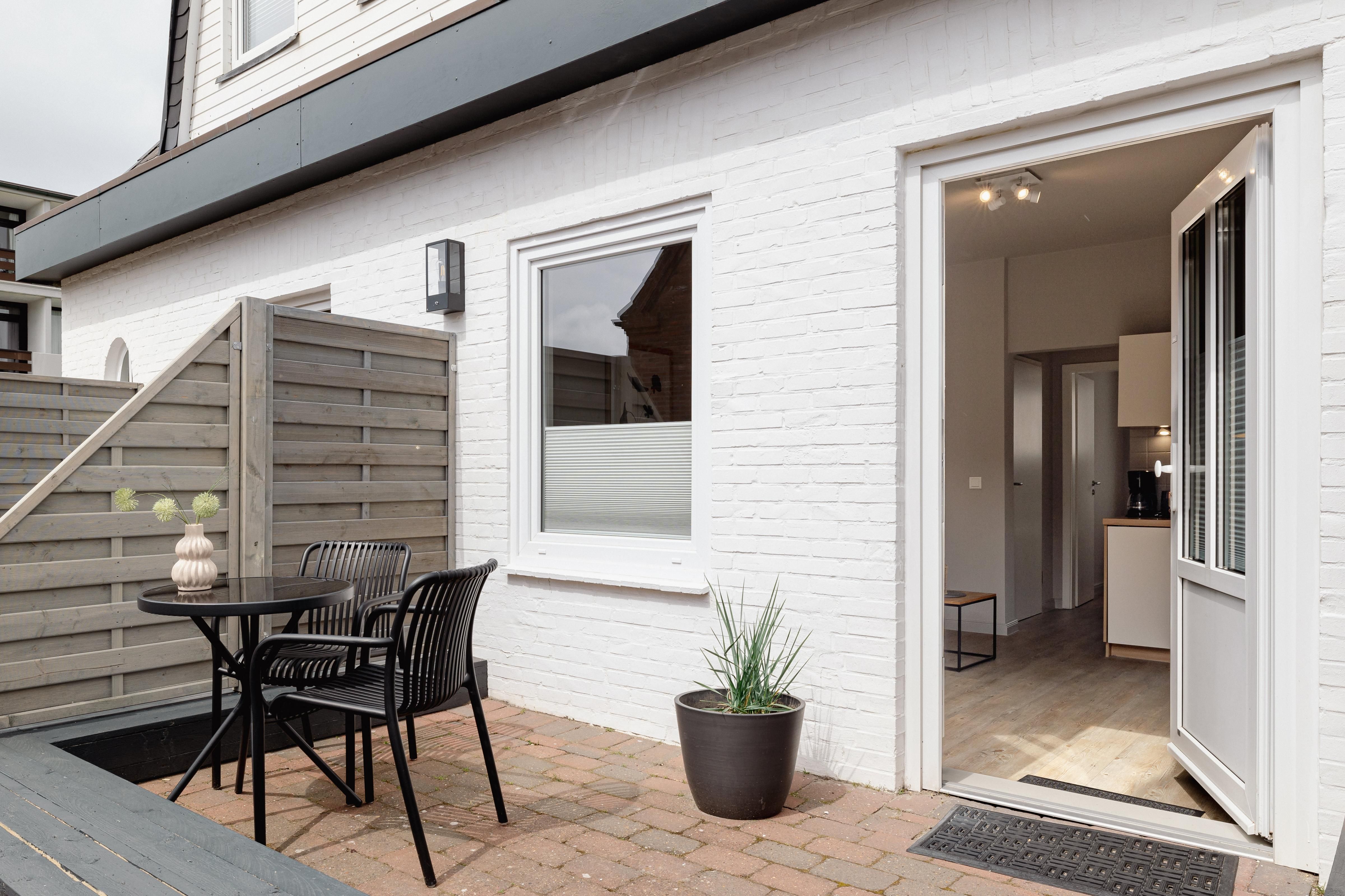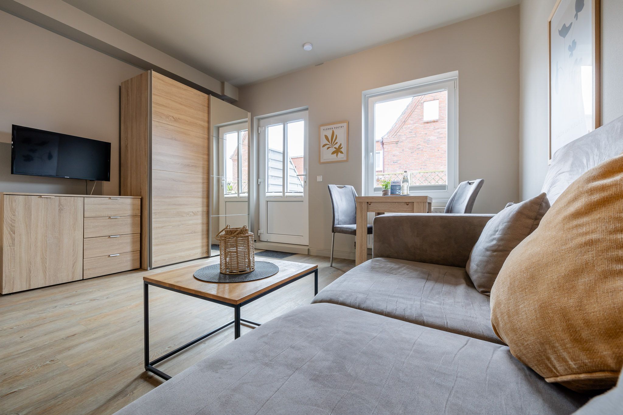 Die kleine Terrasse (Südlage) führt direkt in den gemütlichen und in hellen Farben gehaltenen Wohnbereich mit Couch, Essecke und gut ausgestatteter Küchenzeile. Das kleine Schlafzimmer verfügt über ein bequemes Boxspringbett. Ein helles Duschbad macht das Appartement Krabbe komplett. Ein kleines, feines Urlaubsdomizil für eine ein paar schöne Tage auf Sylt!