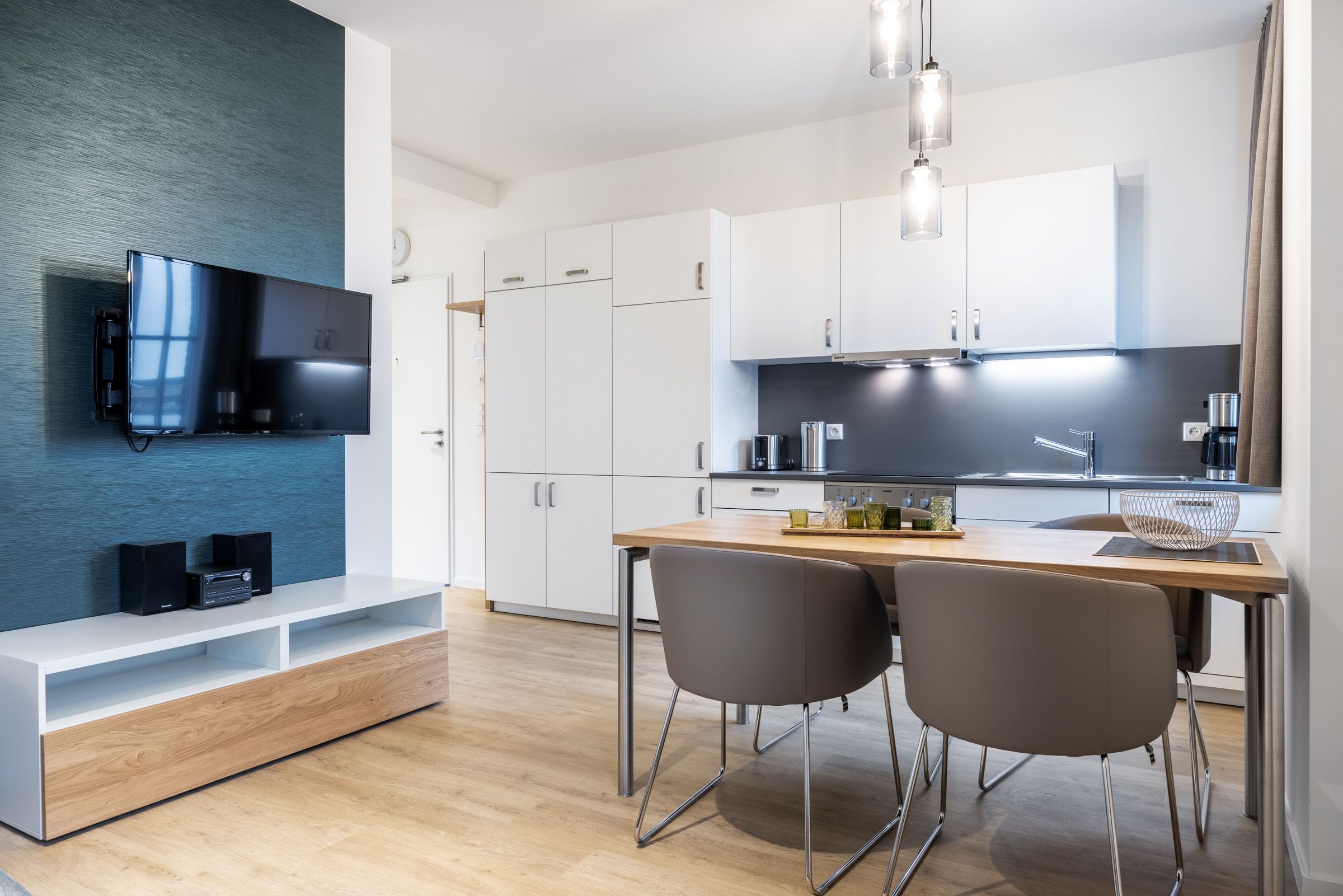 Das helle Apartment verfügt über bodentiefe Fenster im Schlafzimmer, Fußbodenheizung, kostenfreies WLAN und eine voll ausgestattete offene Küche mit Geschirrspüler, Kühlschrank mit Tiefkühlfach, Herd mit 4 Glaskeramikkochfeldern und Backofen, Kaffeemaschine, Toaster, Wasserkocher und Mixstab. Im kombinierten Wohn-Essbereich befinden sich eine Doppelschlafcouch (1,40 x 2,00 m), ein Flatscreen-TV (42 Zoll), eine HiFi-Anlage sowie Gesellschaftsspiele. Genießt schöne Stunden auf dem Balkon mit Blick zum Hafen. Das Schlafzimmer beinhaltet ein komfortables Boxspring-Doppelbett (1,80 x 2,00 m) und einen Flatscreen-TV (42 Zoll). Im geschmackvollen Badezimmer stehen euch eine ebenerdige Regendusche, ein Waschtisch, WC, ein Handtuchwärmer sowie ein Föhn zur Verfügung. Das Apartment verfügt über einen Safe für eine Laptopgröße bis ca. 17 Zoll. Haustiere sind in diesem Apartment herzlich willkommen.