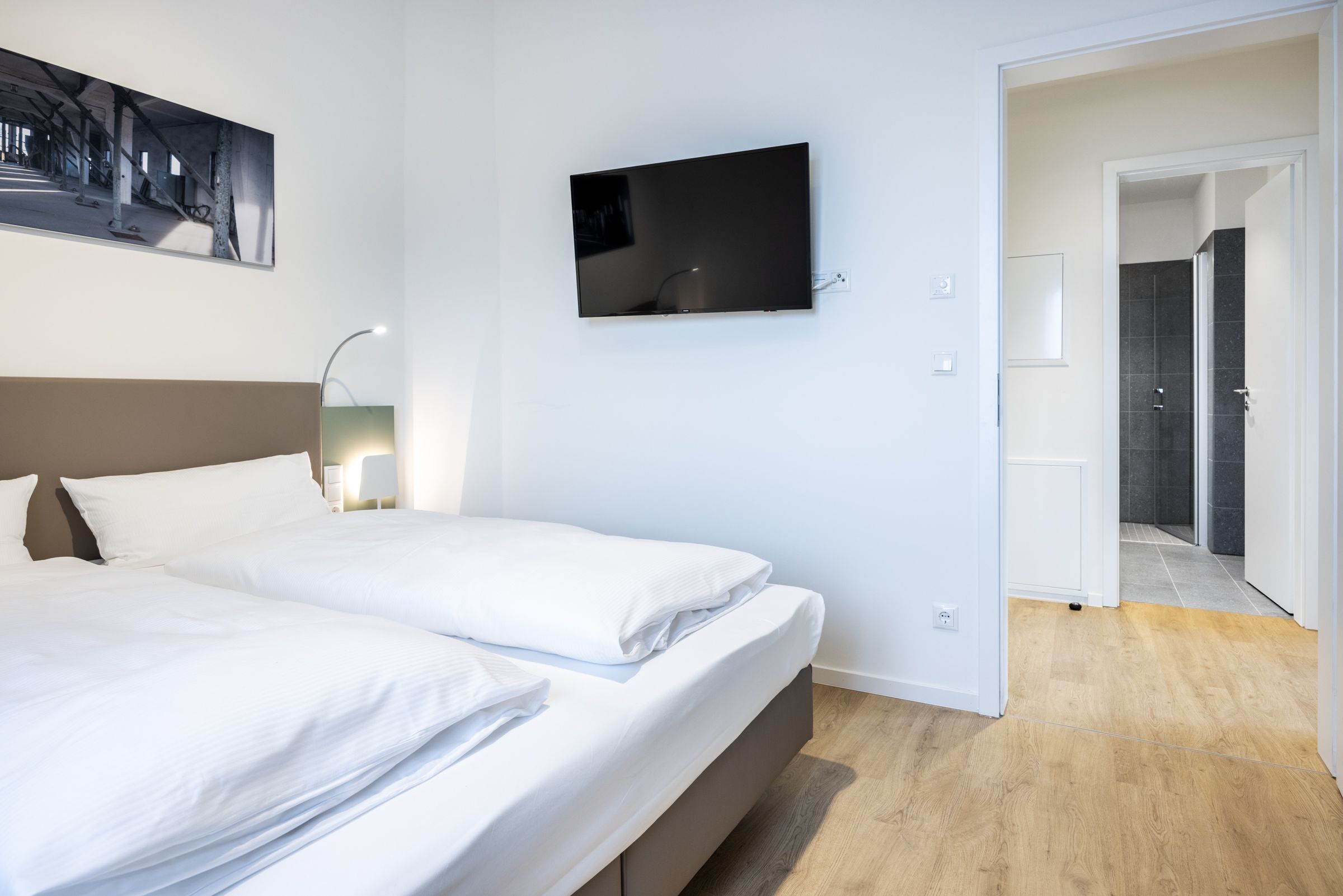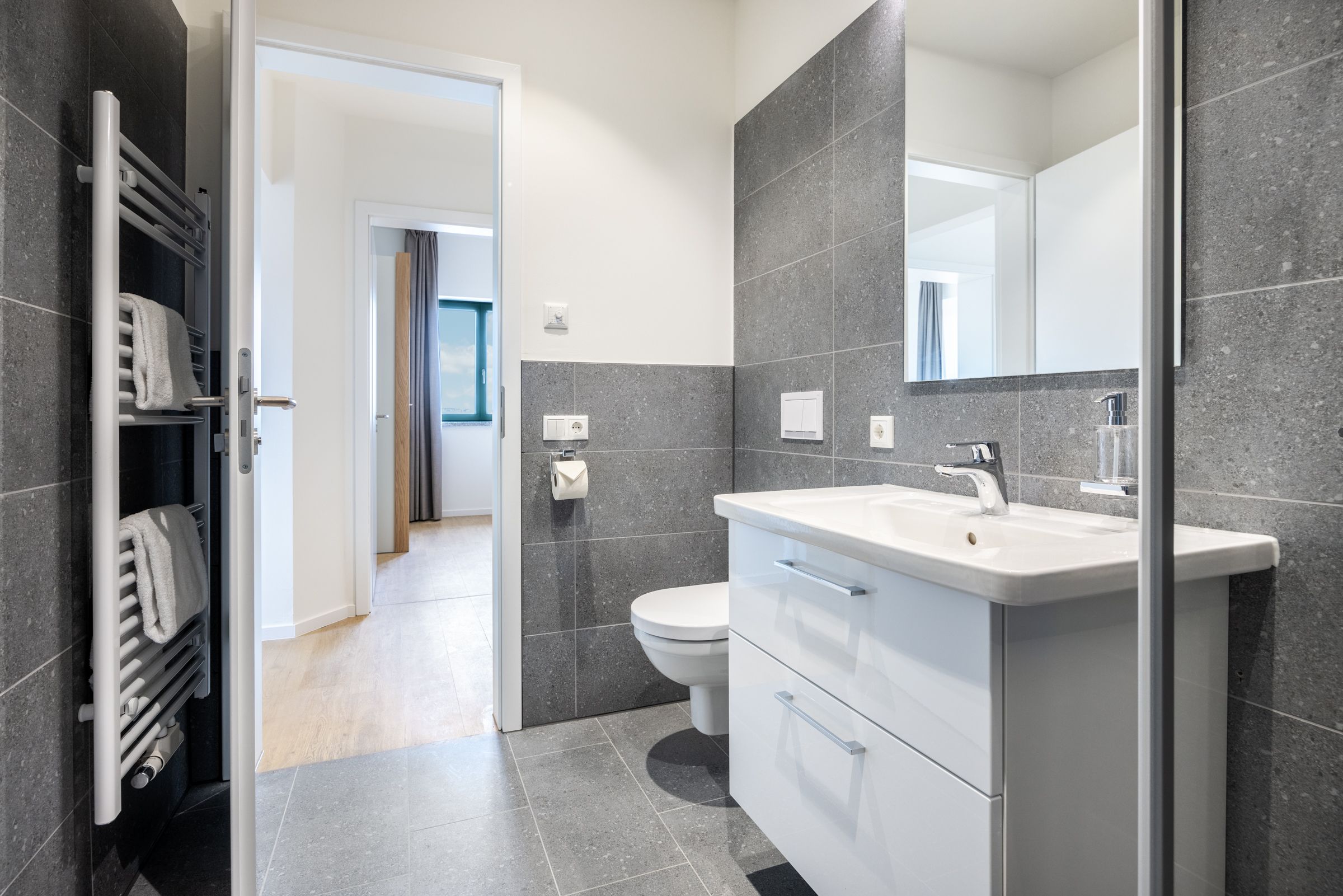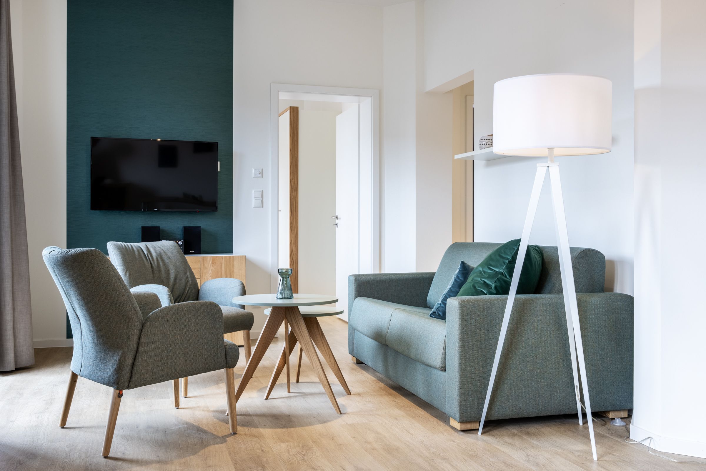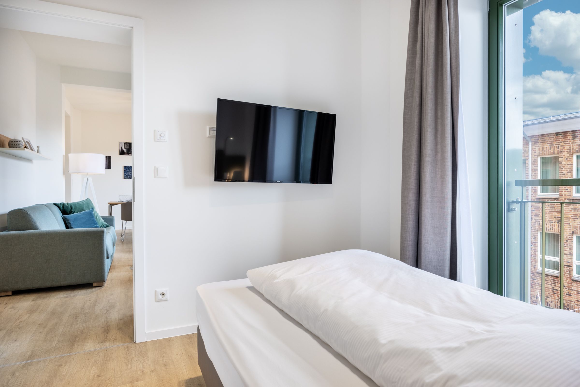 Das helle Apartment verfügt über bodentiefe Fenster, Fußbodenheizung, kostenfreies WLAN und eine voll ausgestattete offene Küche mit Geschirrspüler, Kühlschrank mit Tiefkühlfach, Herd mit 4 Glaskeramikkochfeldern und Backofen, Kaffeemaschine, Toaster, Wasserkocher und Mixstab. Im kombinierten Wohn-Essbereich befinden sich eine Doppelschlafcouch (1,40 x 2,00 m), ein Flatscreen-TV (42 Zoll), eine HiFi-Anlage sowie Gesellschaftsspiele. Beide Schlafzimmer beinhalten einen Flatscreen-TV (42 Zoll) sowie ein komfortables Boxspring-Doppelbett (1,80 x 2,00 m) bzw. ein Boxspring-Einzelbett (0,90 x 2,00 m). Im geschmackvollen Badezimmer stehen euch eine ebenerdige Regendusche, ein Waschtisch, WC, ein Handtuchwärmer sowie ein Föhn zur Verfügung. Das Apartment verfügt über einen Safe für eine Laptopgröße bis ca. 17 Zoll. Ein Kinderbett kann gegen Entgelt im Schlafzimmer aufgestellt werden. Haustiere sind in diesem Apartment herzlich willkommen.
