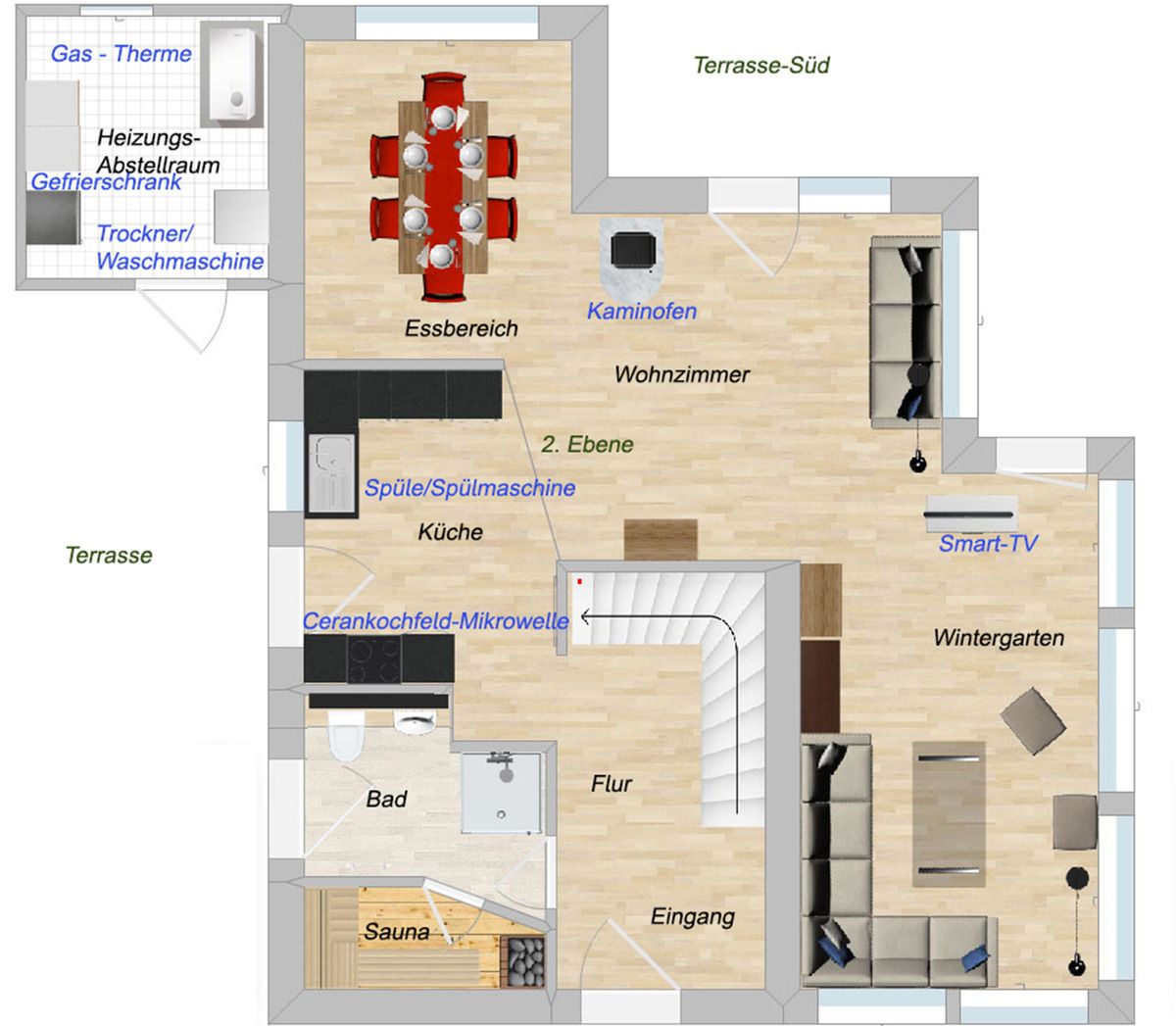 Strom (inkl. Sauna) wird vor Ort nach Verbrauch abgerechnet: 0,50 € pro kWh