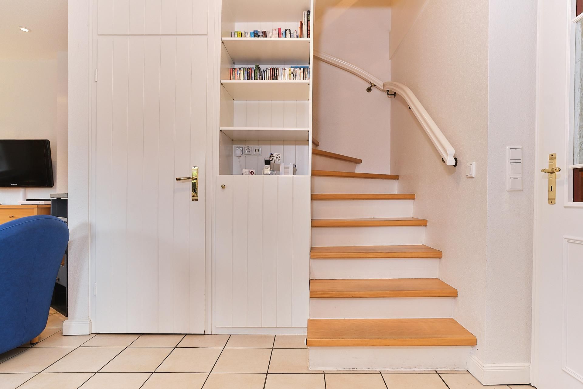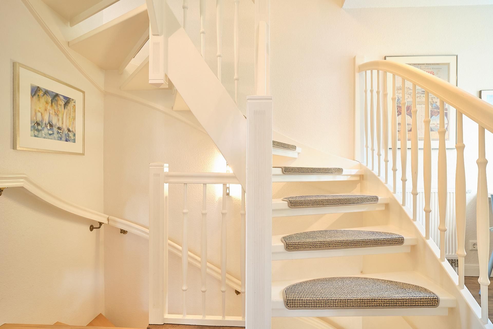 1 geschlossene Holztreppe ins OG, 1 offene Holztreppe mit Teppichbelag ins DG
