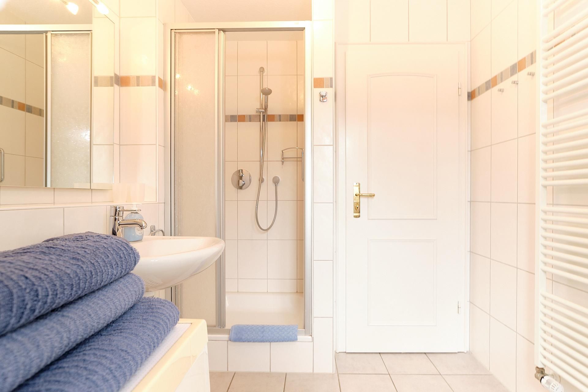 2 Bäder: 1 Duschbad mit WC und Fußbodenheizung im EG, 1 Duschbad mit WC im OG (Fußböden: Fliesen)