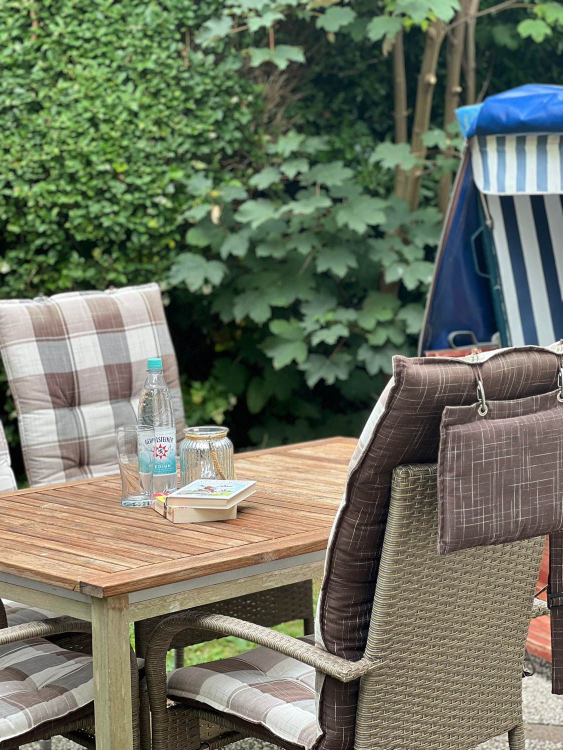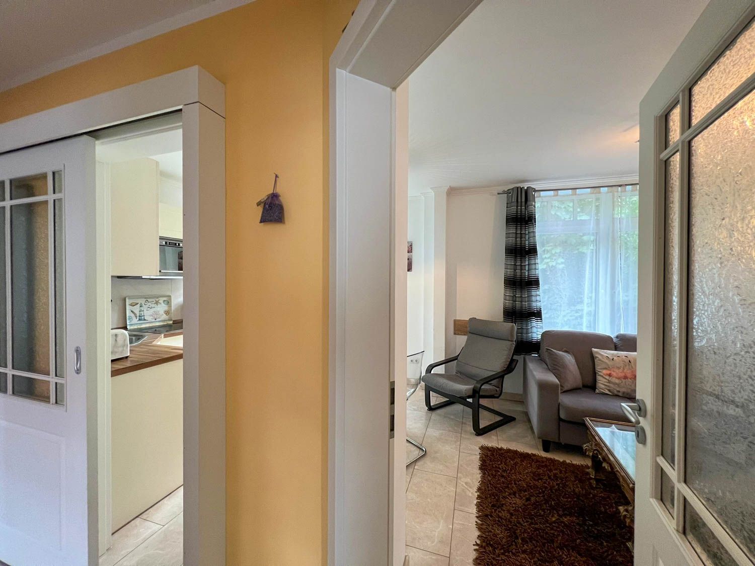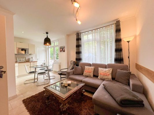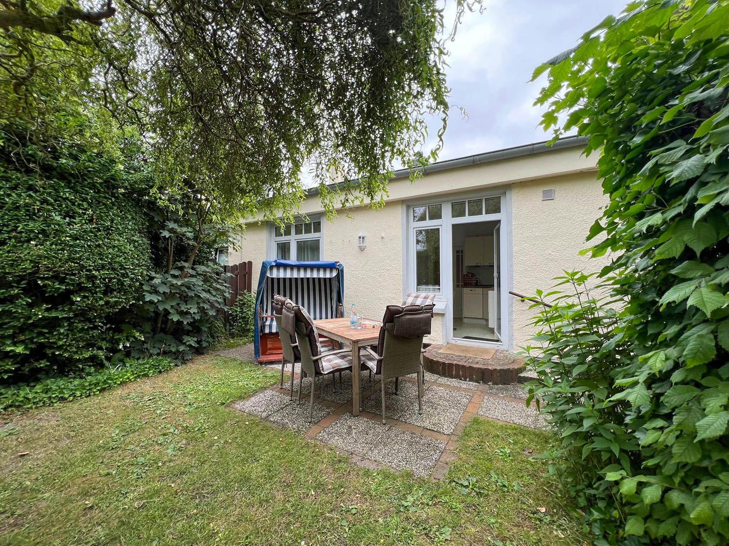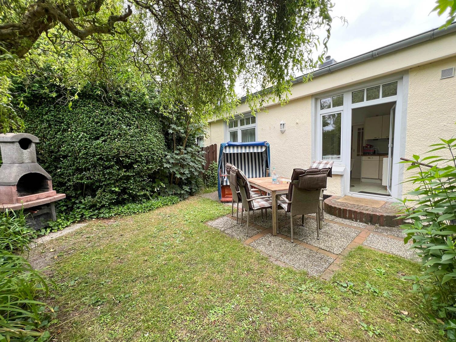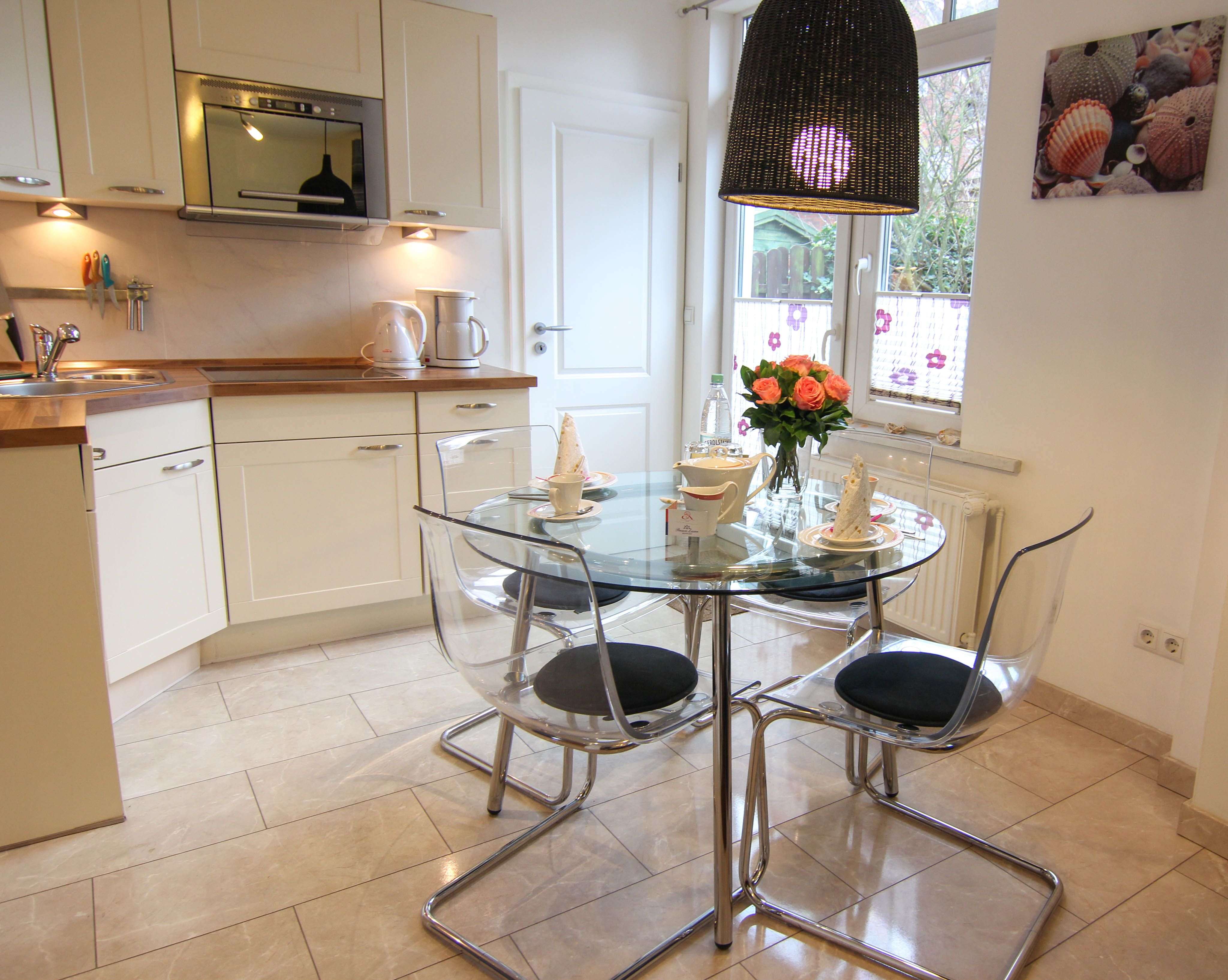 Bockelmann`s Hof mitten in Westerland. Sie hat eine eigene Süd-Terrasse mit Strandkorb, zwei vollwertige Schlafzimmer, ist soeben komplett renoviert worden und legte sich dabei sehr viel Charme zu. Clou und ein echter Hingucker ist die zartgelbe offene Küche, mit Terrassentür nach draußen und Extra-Esstisch, die sich geschickt zu einem Halbrund formiert."Lena" hat außerdem eine eigene Süd-Terrasse mit Strandkorb, die sogar kinder- und hundefest eingezäunt ist, also sehr umsichtig "weglaufsicher" gemacht wurde. Die Wohnung nimmt alle Vorteile mit, die diese Lage mit sich bringt (kurze Wege überall hin: zum Einkauf, zum Strand, zum Bus, zur Bahn, zu Restaurants und Kneipen) in der Nähe des Bahnhofs und ist doch relativ abgeschieden. Sie liegt, wie der Sylter so sagt, "hinten rum", also quasi im Innenhof versteckt.