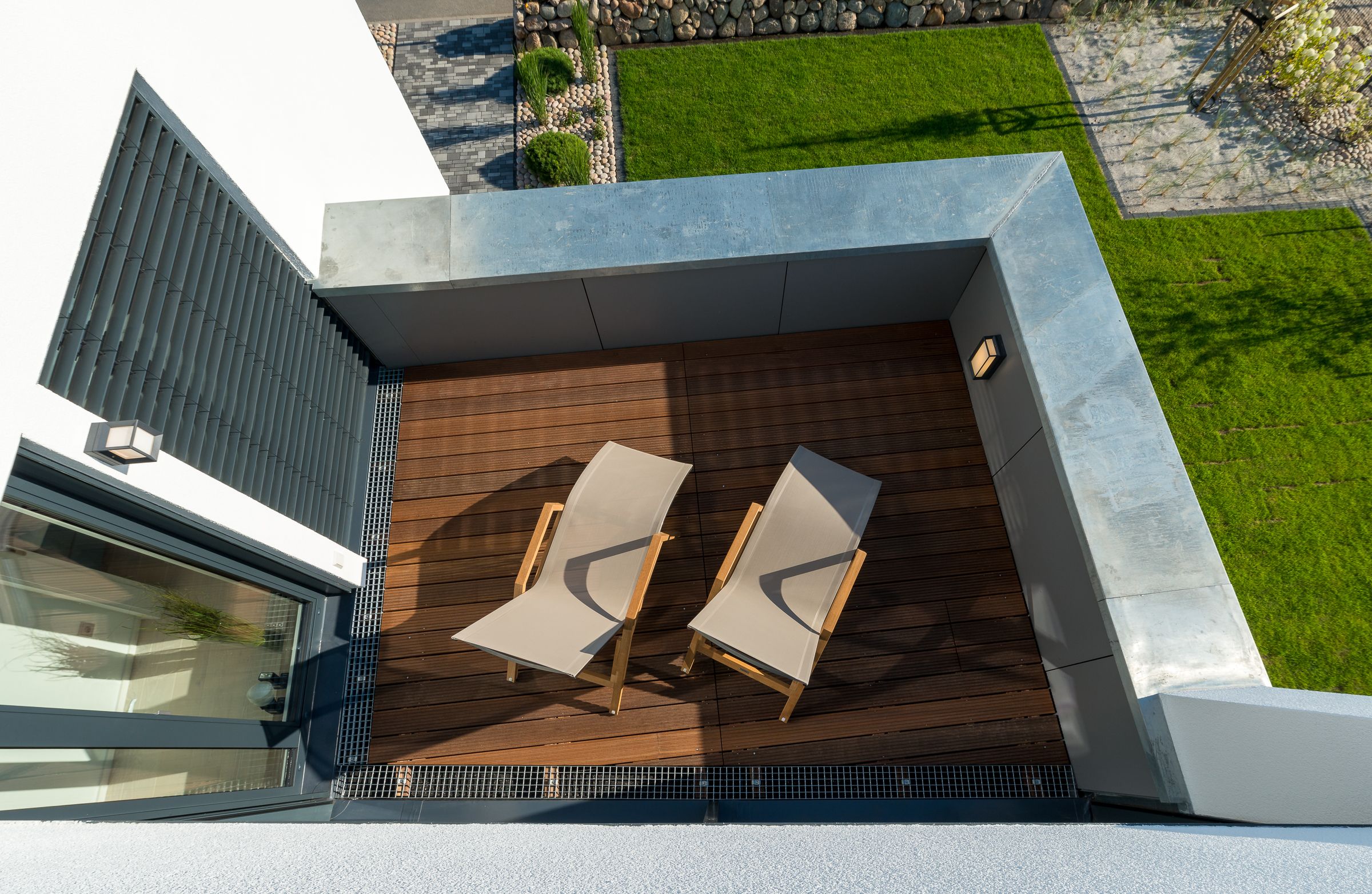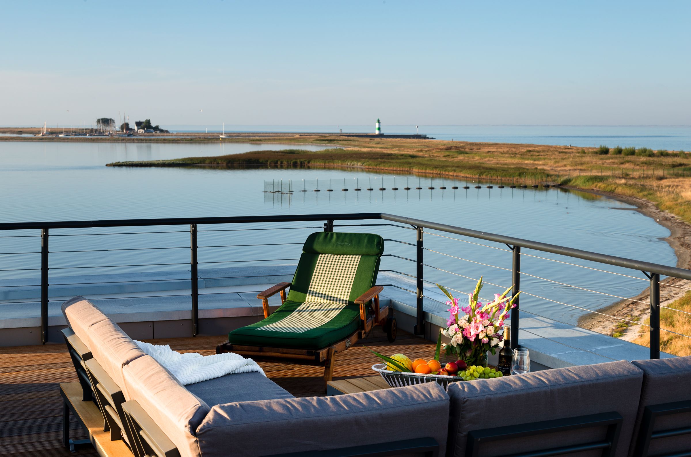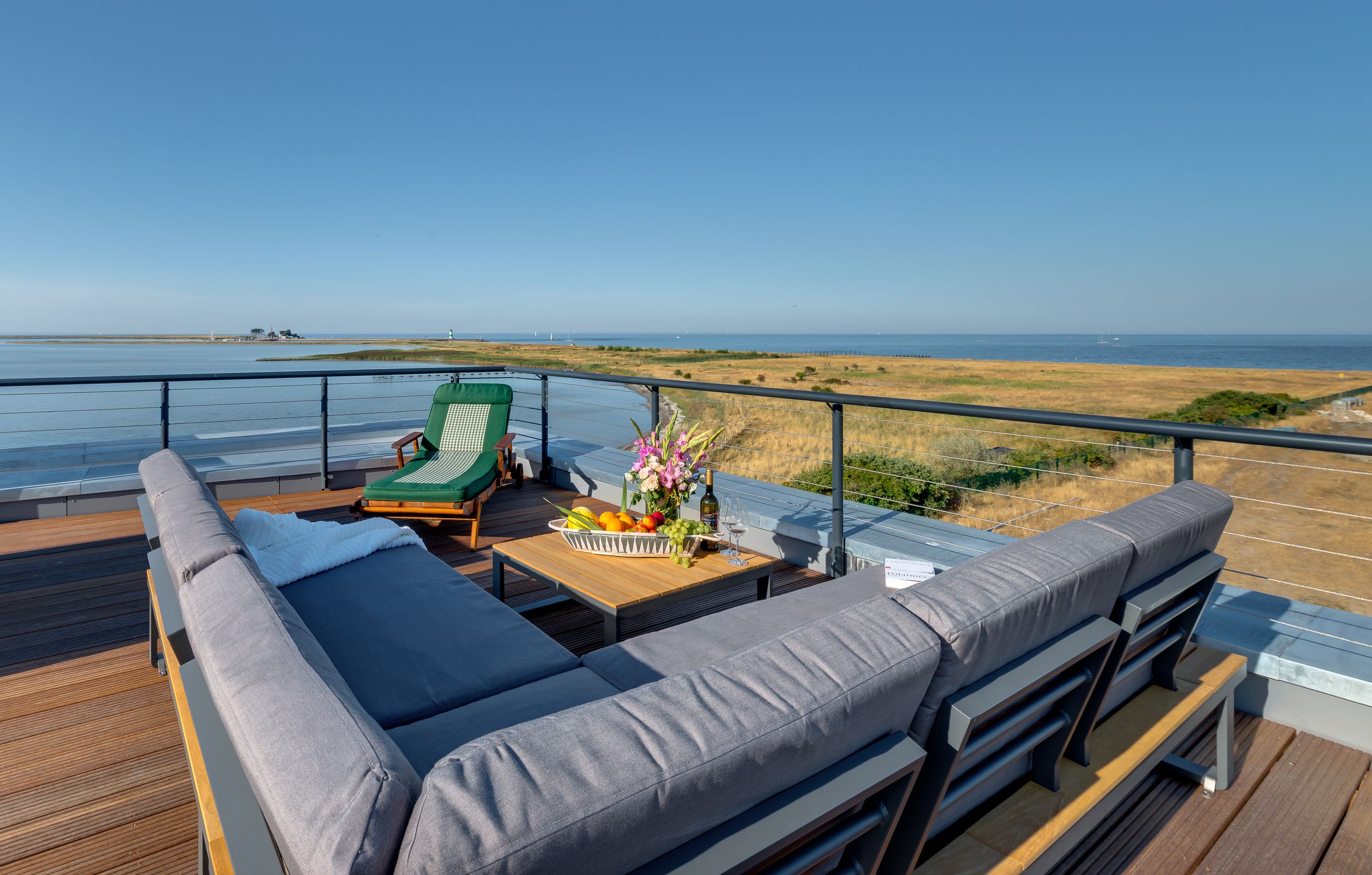 Vom Flur im ersten Obergeschoss geht es dann hinauf auf die große Dachterrasse. Ein elektrisches Fenster fährt auf und ermöglicht über eine Treppe den Zugang. Auf der Dachterrasse befinden sich eine gemütliche Loungegruppe und eine weitere Sonnenliege. Von hier aus haben unsere Gäste einen 360 Grad Blick auf die Ostsee, die Schlei und den Hafen des Ostseeresort Olpenitz. Der Sonnenuntergang über Maasholm lässt sich hier ebenso mit einem Sundowner genießen, wie der Sonnenaufgang mit einer Tasse frisch gebrühten Kaffee.