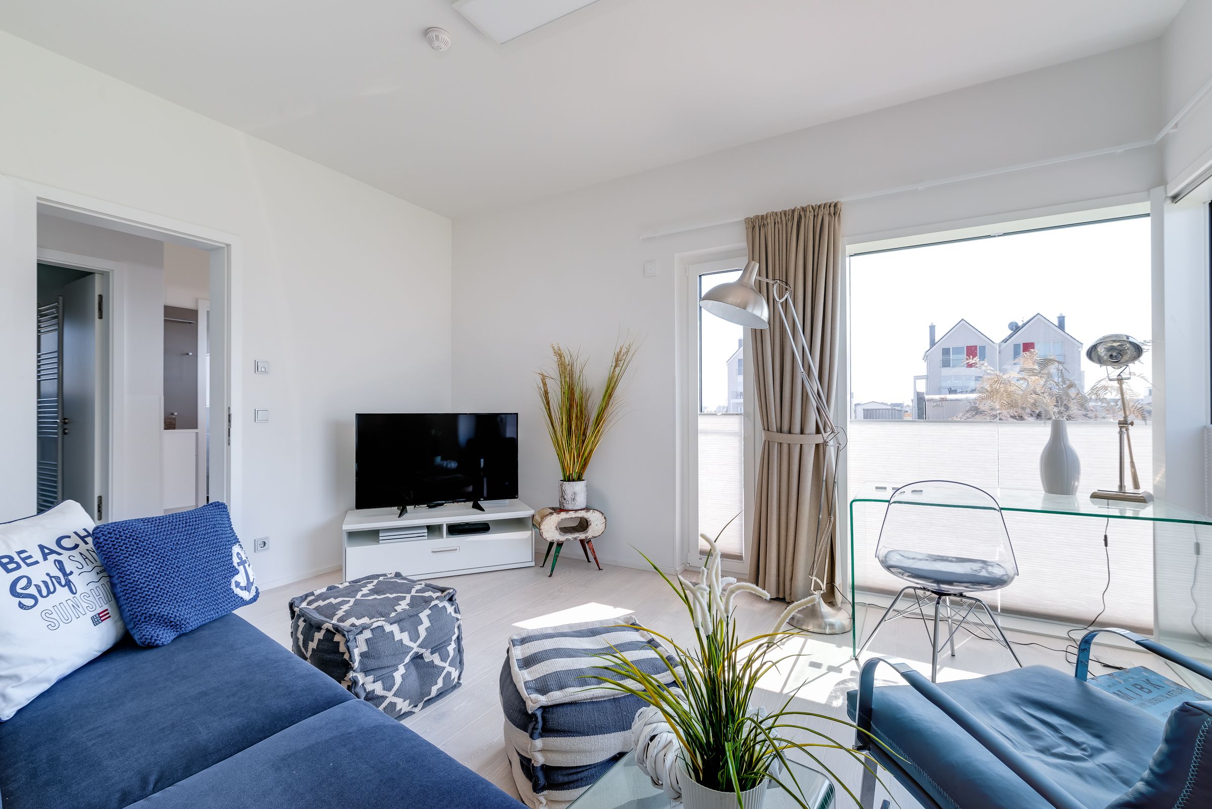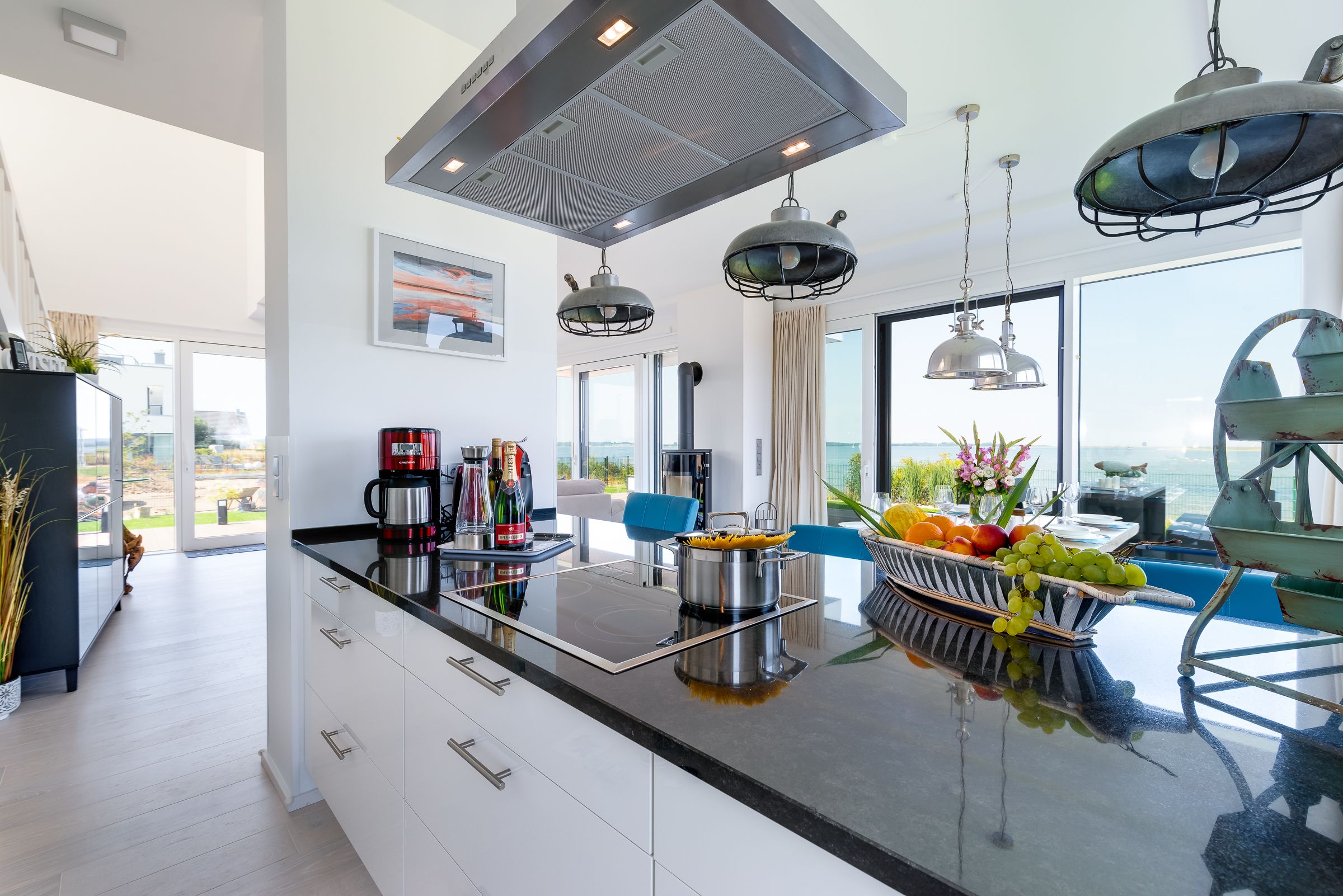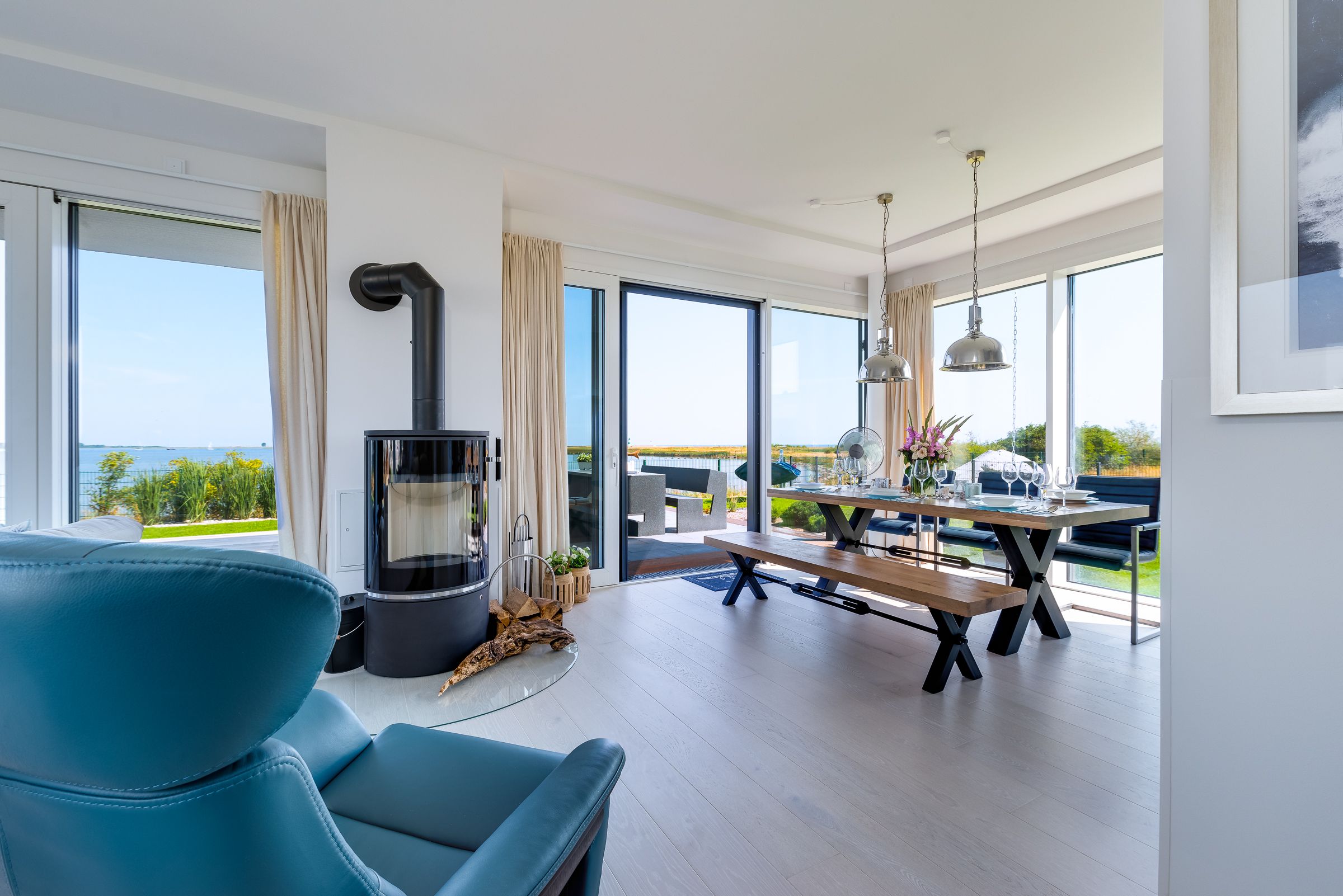 Der 43 qm große Wohnbereich schließt sich dem Eingangsbereich an. Hier warten eine gemütliche Sofalandschaft, ein Kaminofen, eine bequeme Essgruppe und eine offene Küche auf unsere Gäste. Die Küche bietet eine umfangreiche Ausstattung, die keine Wünsche offen lässt. Das Kochfeld ist auf die große Panoramafensterfront ausgerichtet, sodass der Blick auf den Garten und die Schleimündung auch beim Kochen genossen werden kann. Eine Stereoanlage, ein Internetradio, eine Spielesammlung für Groß und Klein und ein großer Smart-TV runden das Bild ab. Vom Wohnbereich geht’s es dann auf die große Sonnenterrasse, die neben viel Platz auch einen Strandkorb, eine Sitzgruppe und eine Hängematte bietet.