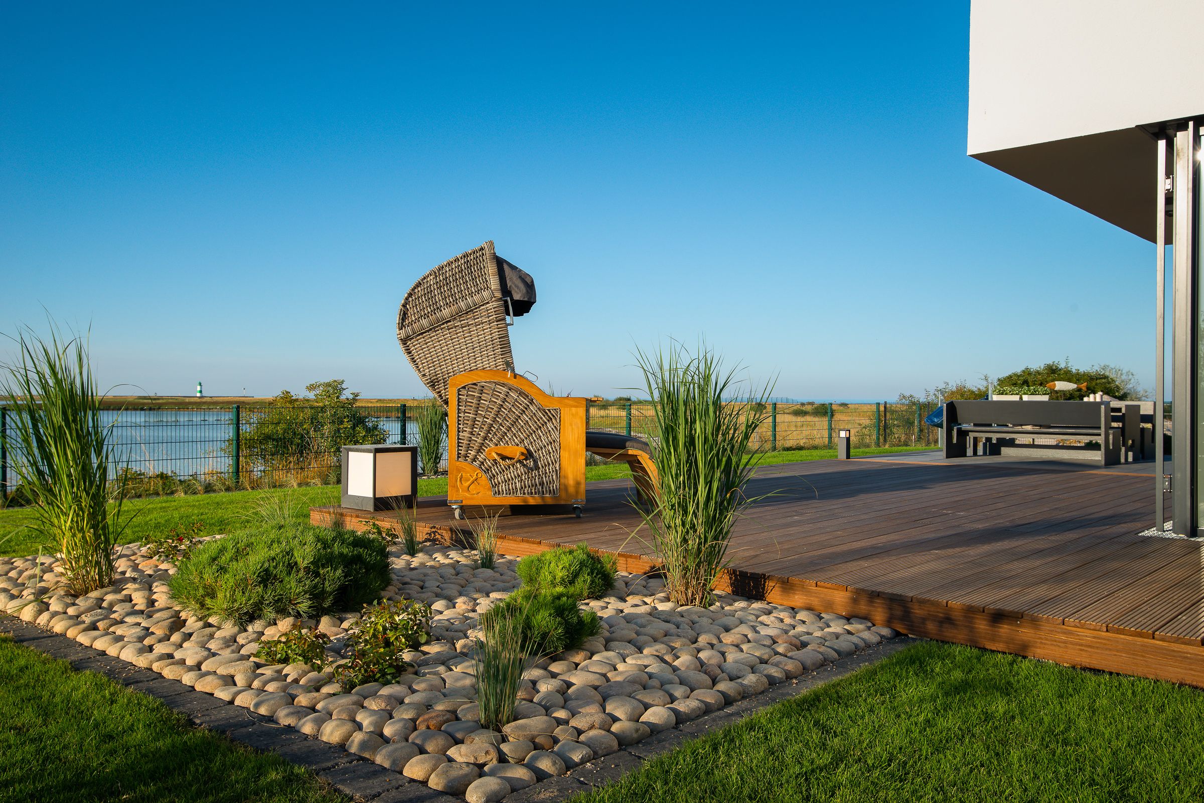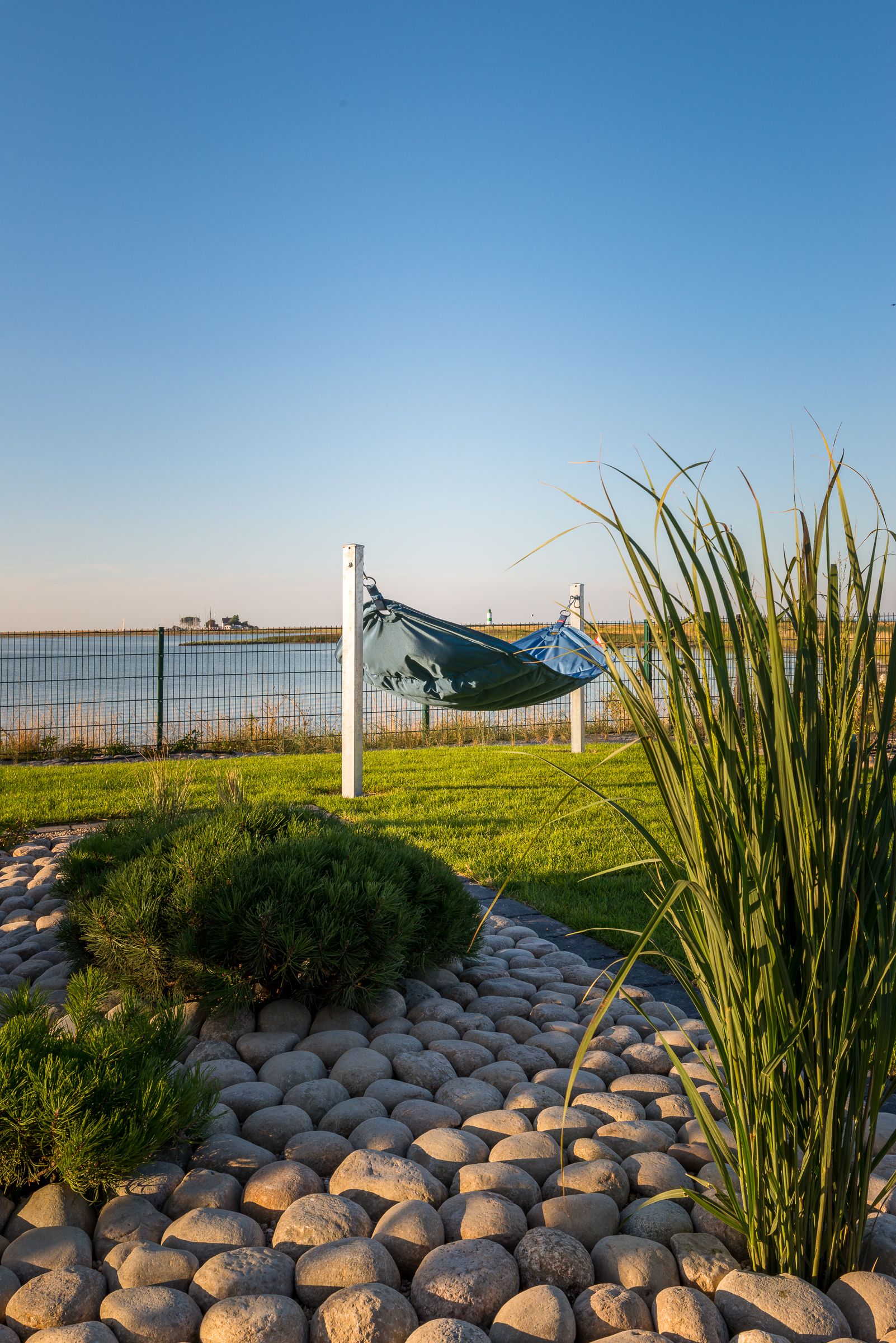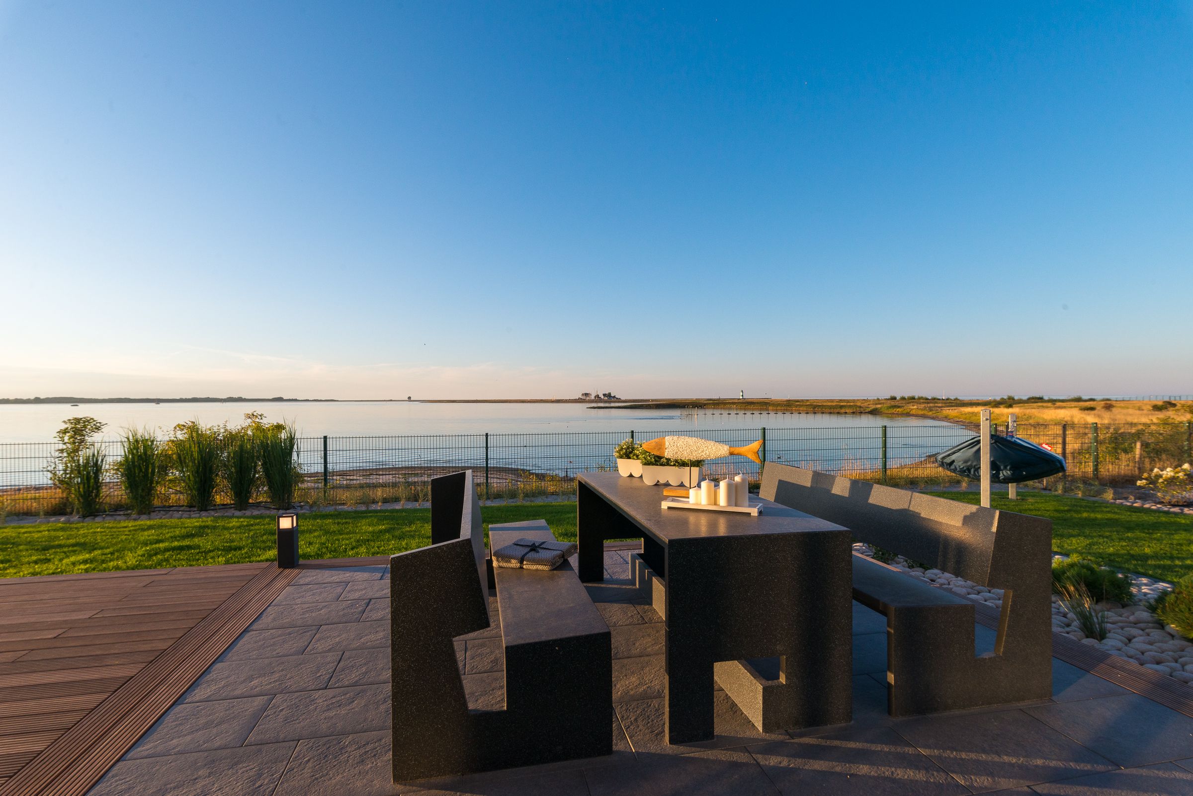 Ein großer Garten direkt am Wasser mit schöner Bepflanzung grenzt einerseits an die große Sonnenterrasse und andererseits an das Wasser. Hier warten eine Hängematte, ein großer Esstisch, Sonnenliegen und ein Strandkorb auf unsere Gäste. Die Panoramaverglasung im gesamten Haus bietet einen wunderschönen Blick auf das Meer und den Garten.