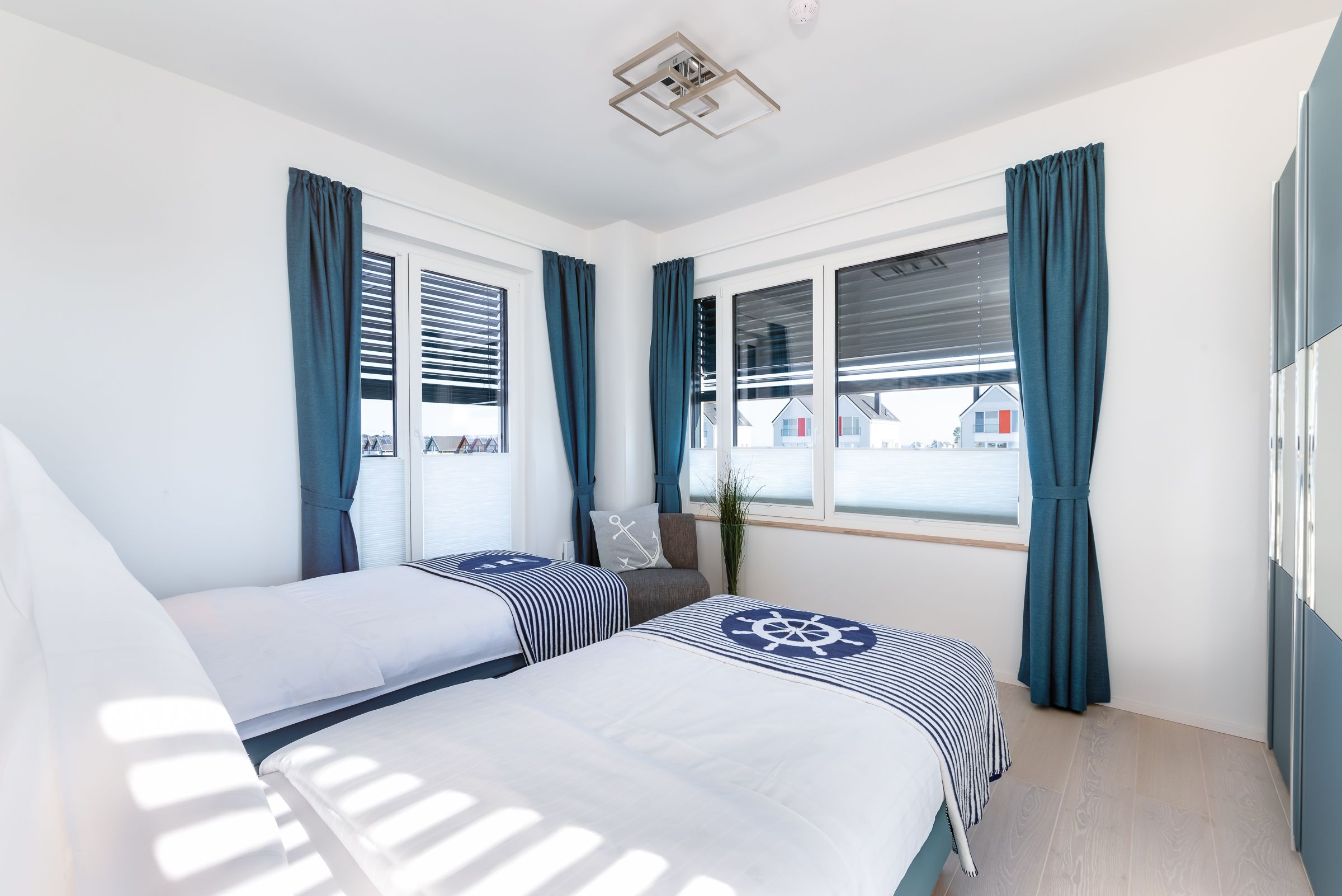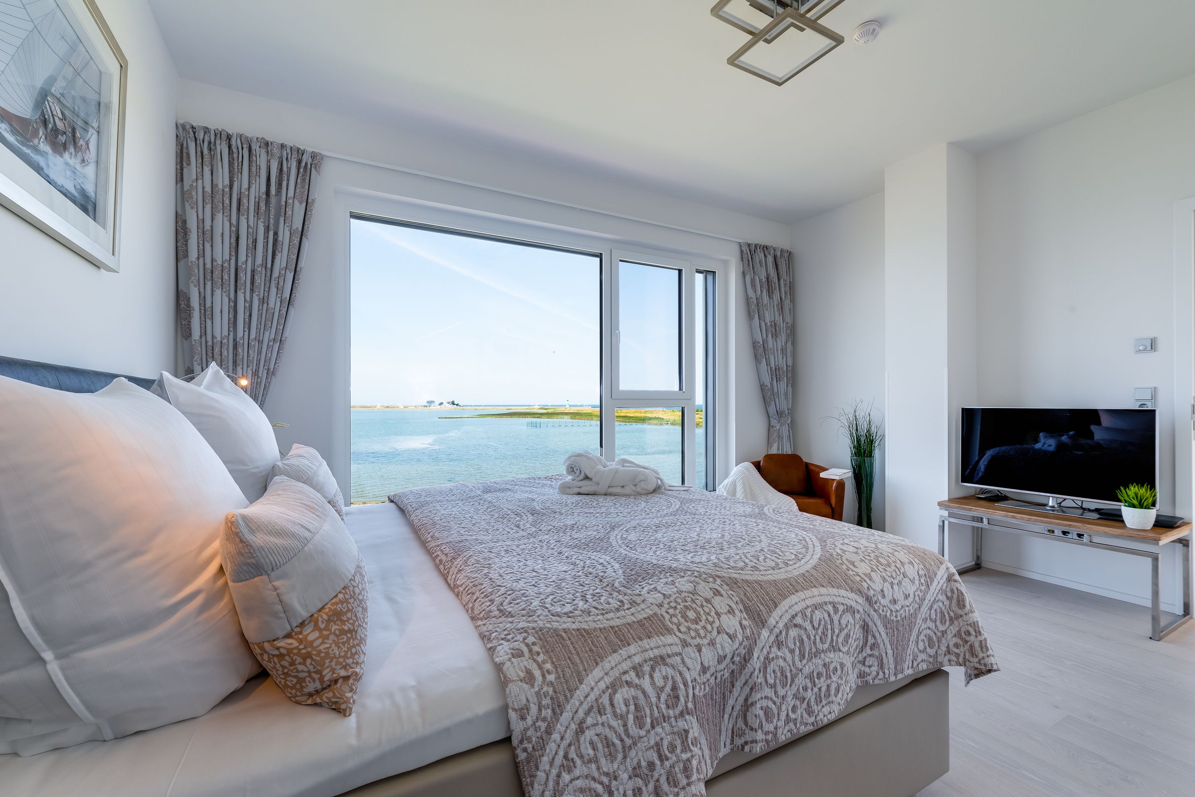 Der Masterbedroom befindet sich ebenfalls auf dieser Ebene. Ein großes Boxspringbett direkt vor der Panoramaverglasung mit Meerblick lässt schon beim Aufwachen den Traum vom Urlaub am Meer wahr werden. Ein Sessel, Smart-TV und ein Kleiderschrank sind ebenfalls vorhanden.