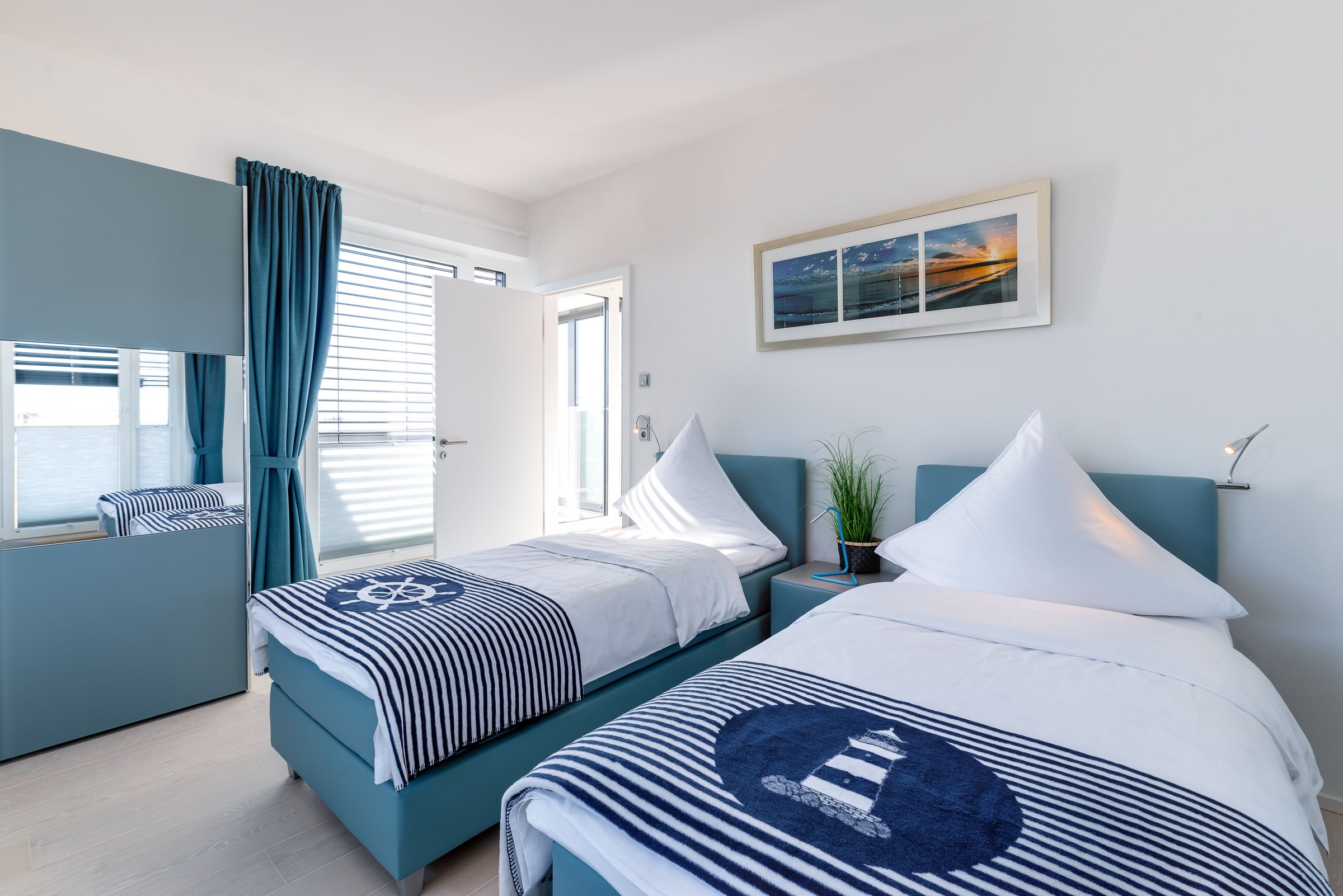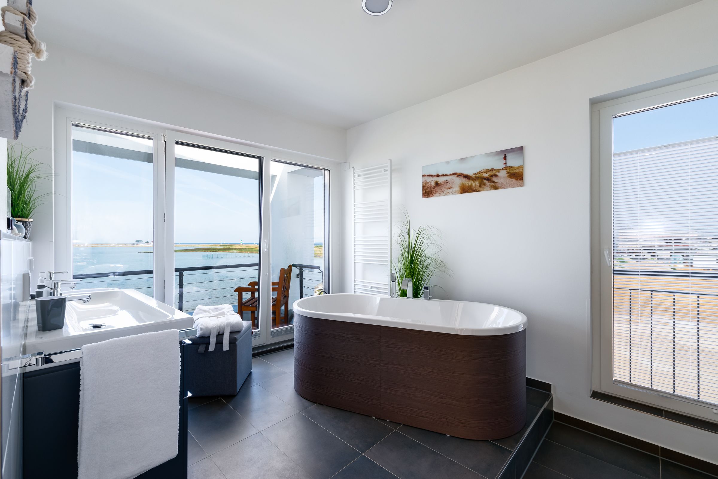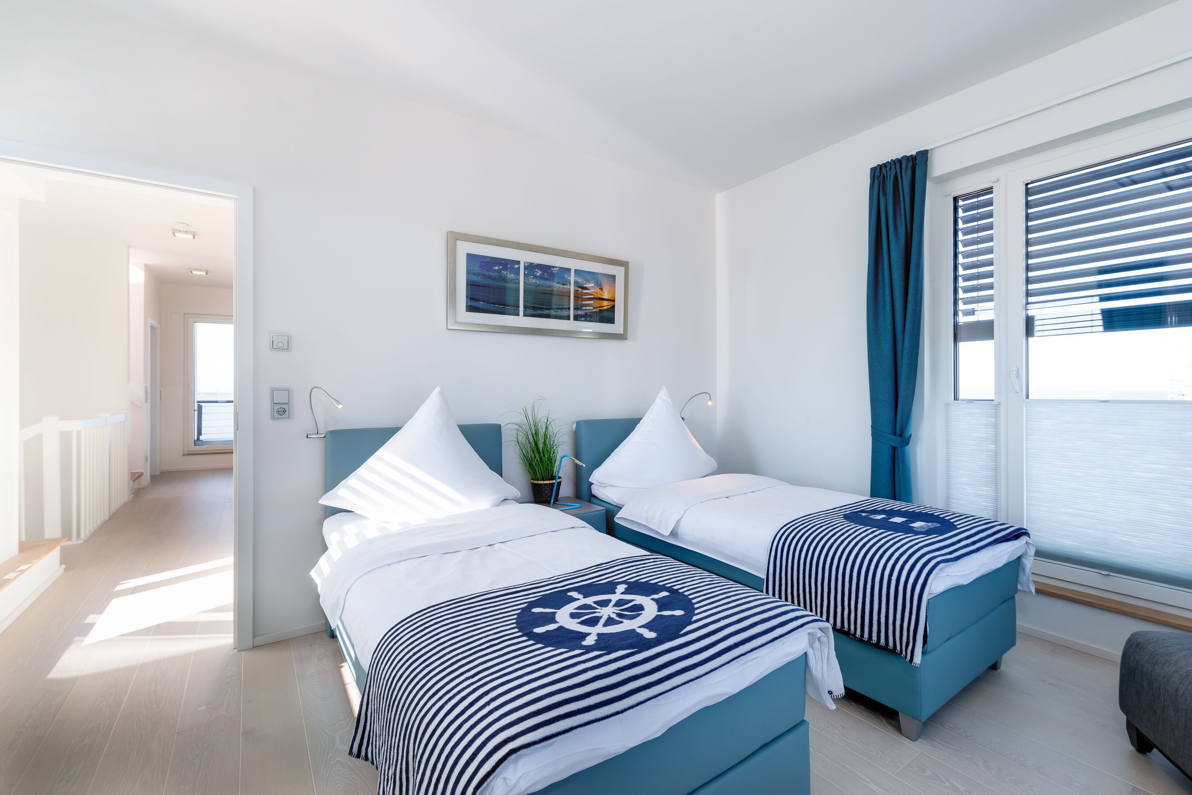 In den Wohnbereich integriert ist eine Treppe, die in das erste Obergeschoss führt. Von hier aus führt eine große Glastür auf die nach Süden ausgerichtete Terrasse, die mit zwei bequemen Sonnenliegen ausgestattet ist. Ein großes Schlafzimmer mit zwei Einzelbetten (zusammen schiebbar) und Kleiderschrank befindet sich neben dem großen Badezimmer, welches über eine frei stehende Badewanne mit Meerblick, eine große ebenerdige Dusche, einen Doppelwaschtisch, WC und eine große finnische Sauna verfügt. Auch vom Badezimmer aus kann ein kleiner Balkon betreten werden, der mit zwei Stühlen und einem kleinen Tisch ausgestattet ist und ebenfalls über Meerblick verfügt.