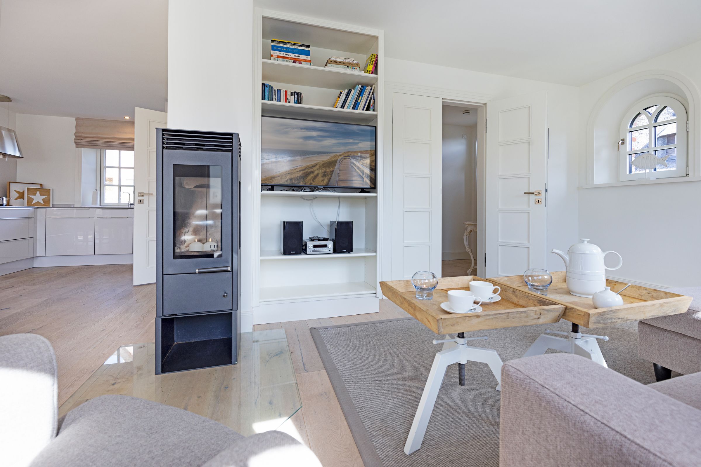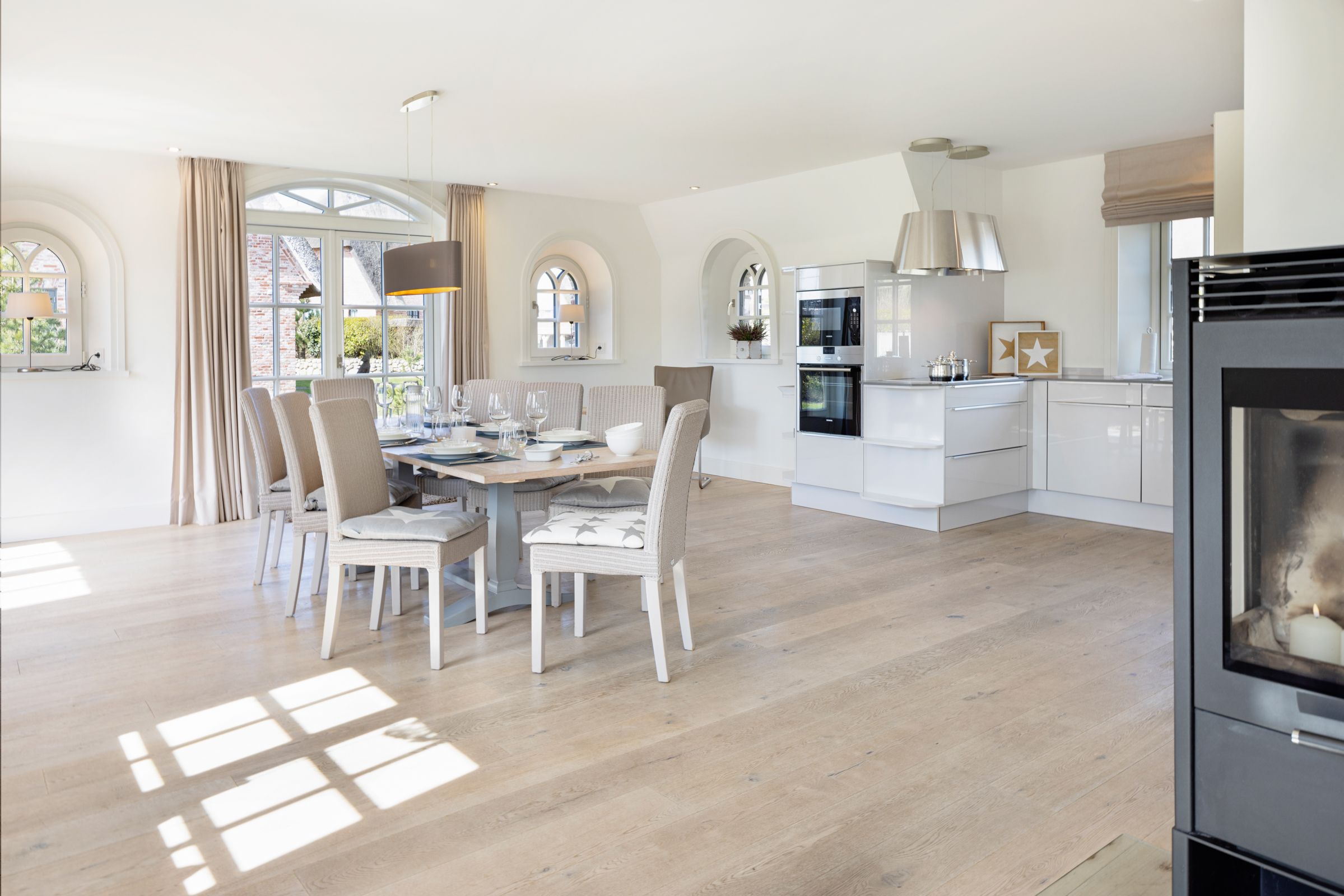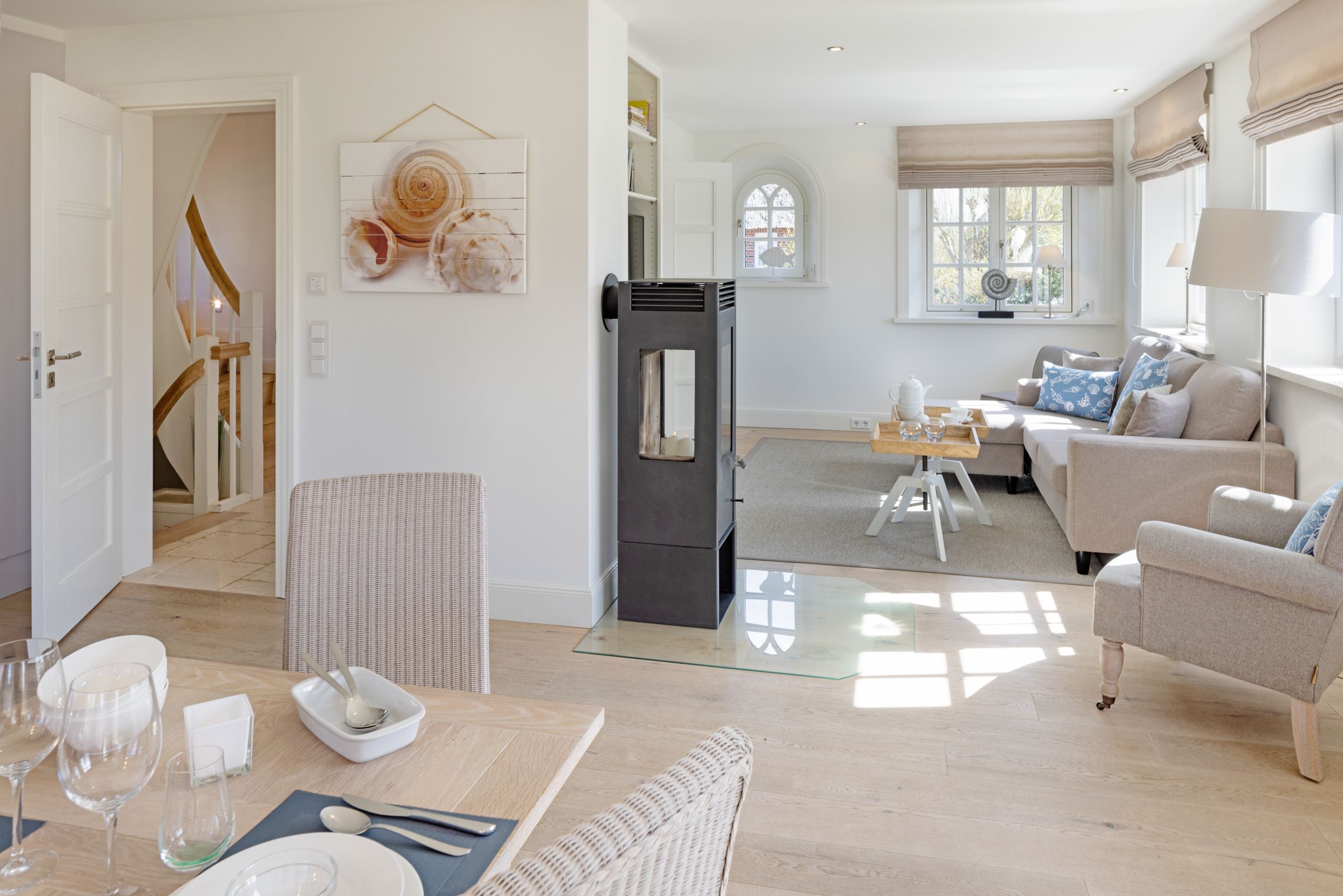 Im großzügigen Wohn-Esszimmerbereich, der zum Verweilen einlädt, lässt sich wunderbar am Kaminofen entspannen.