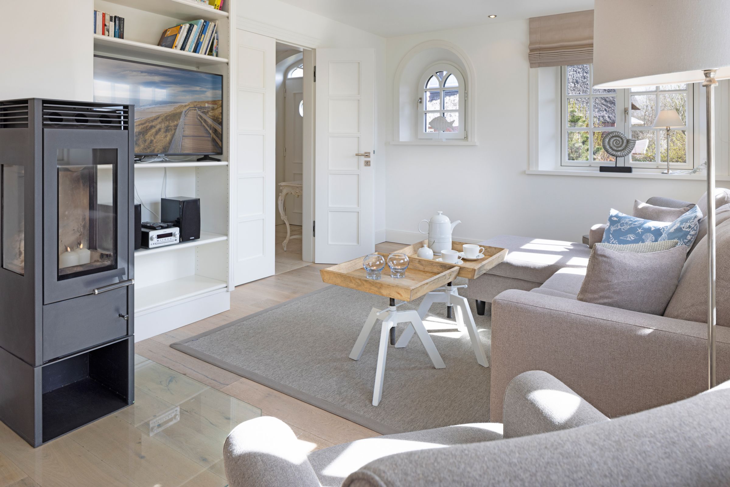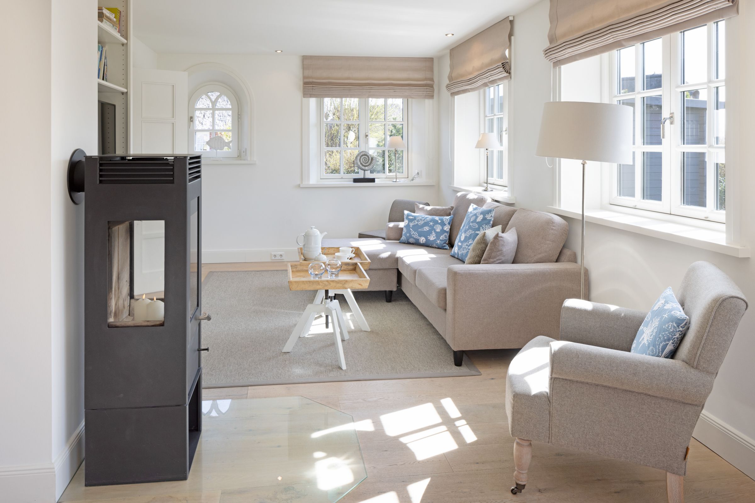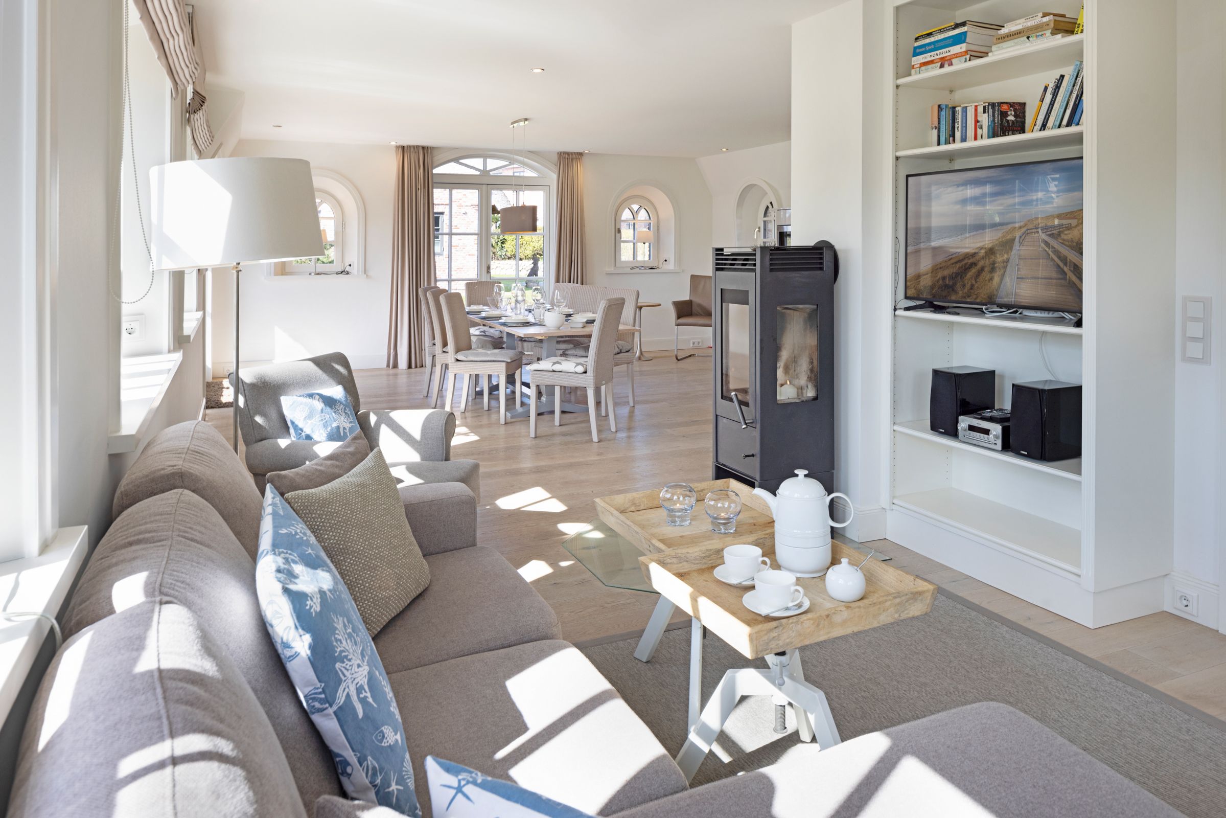 Im großzügigen Wohn-Esszimmerbereich, der zum Verweilen einlädt, lässt sich wunderbar am Kaminofen entspannen.