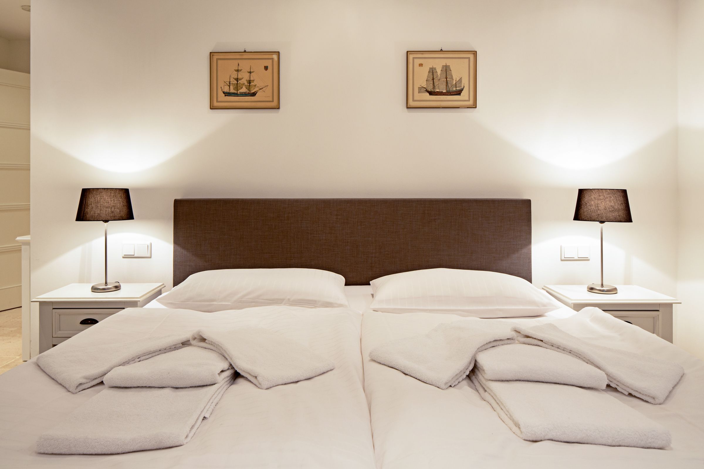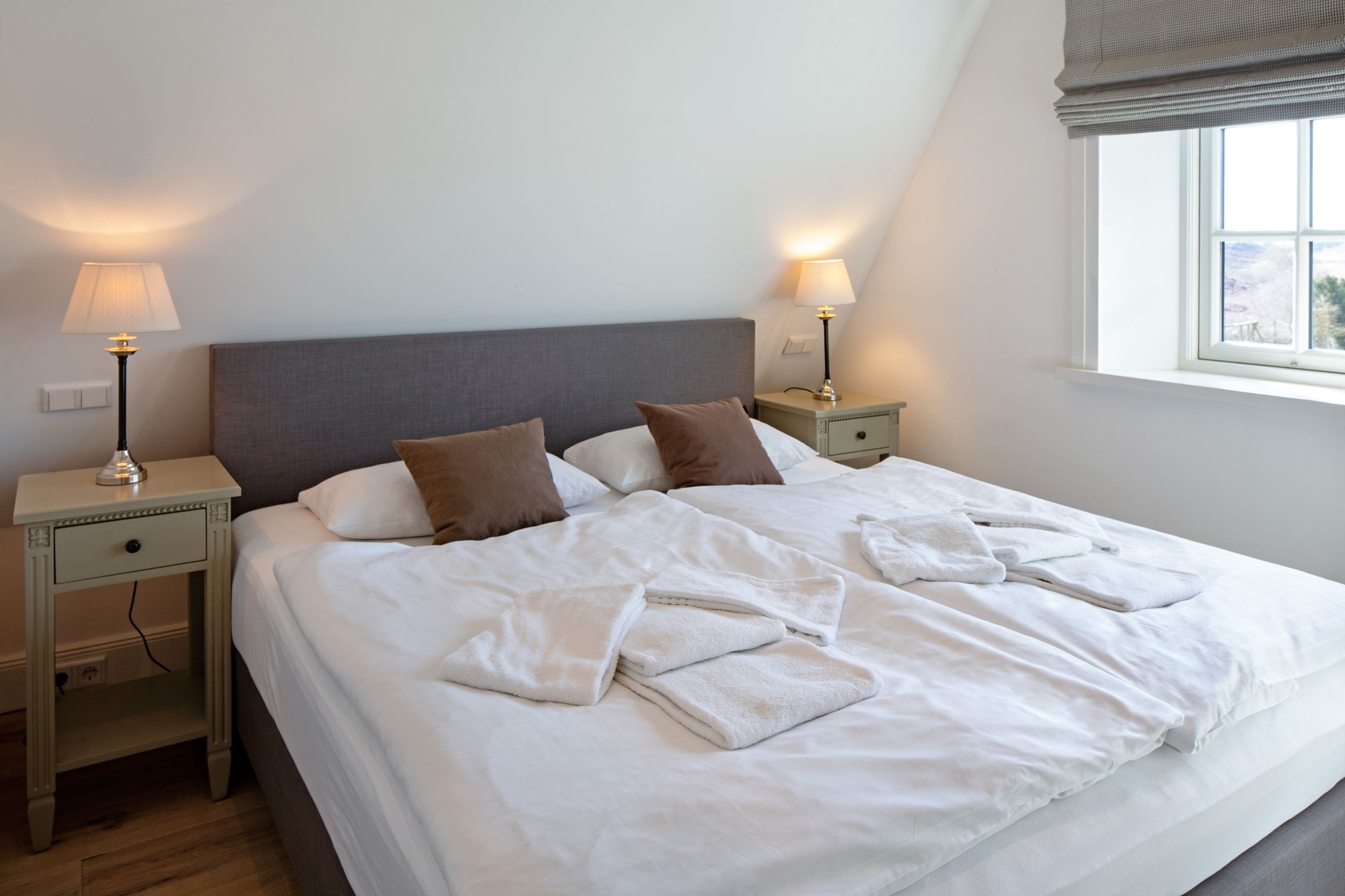 (Das Bett ist bezogen, 2 Handtücher, 2 Duschtücher, 1 Badvorleger, 1 Geschirrtuch )