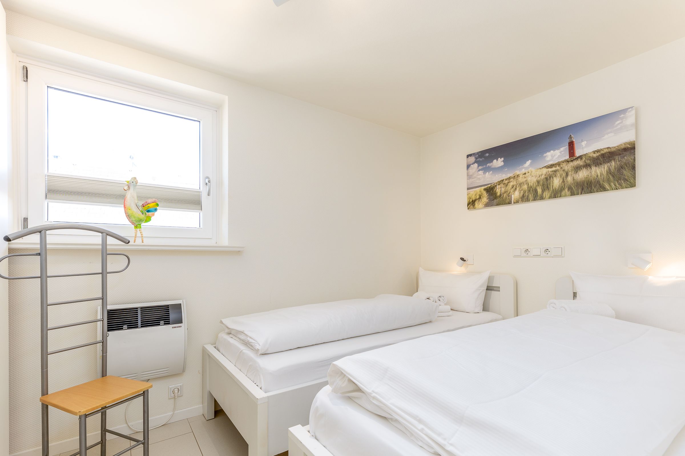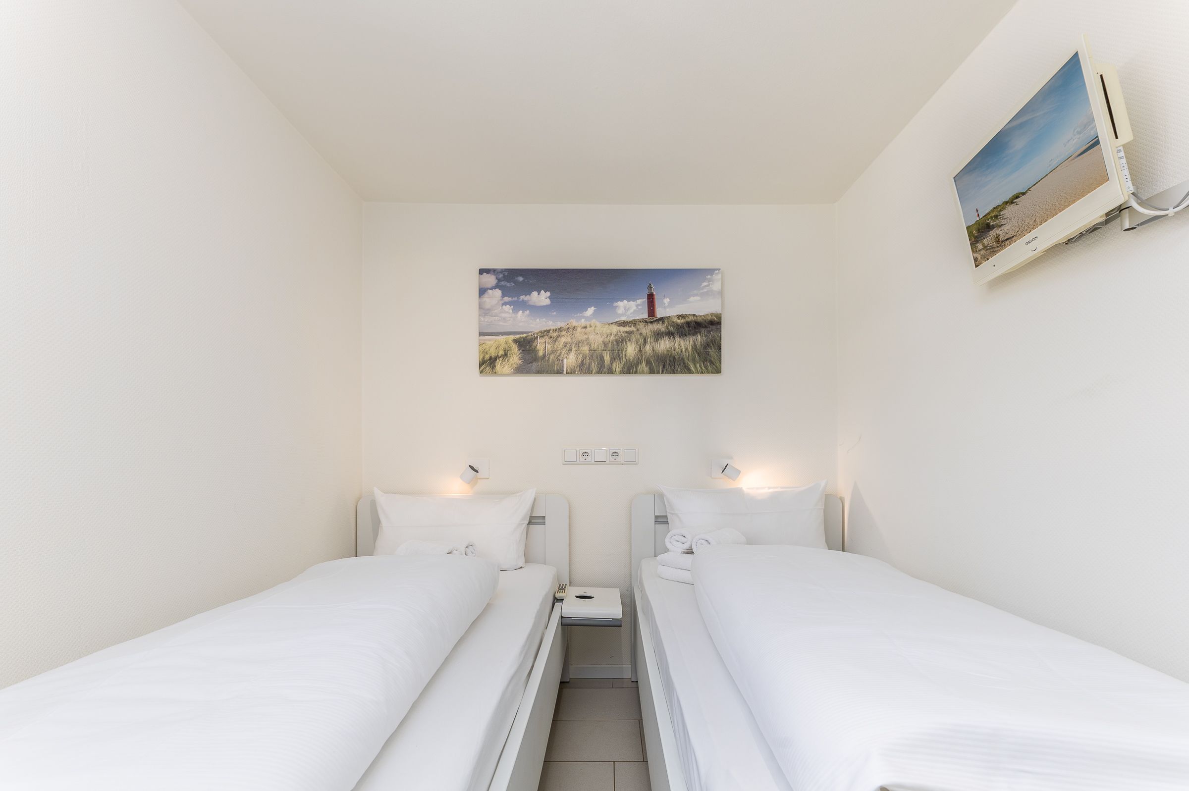 Im Schlafzimmer lassen sich die beiden bequemen Betten bei Bedarf zu einem vereinen. Ein Flat-TV sowie ausreichend Schrankplatz dürfen natürlich auch nicht fehlen. Das helle Duschbad verfügt über eine bodentiefe Dusche und einen geräumigen Waschtisch. Nicht zuletzt ist der Balkon Meerblick ein weiteres Highlight dieses schicken Studio-Appartements.