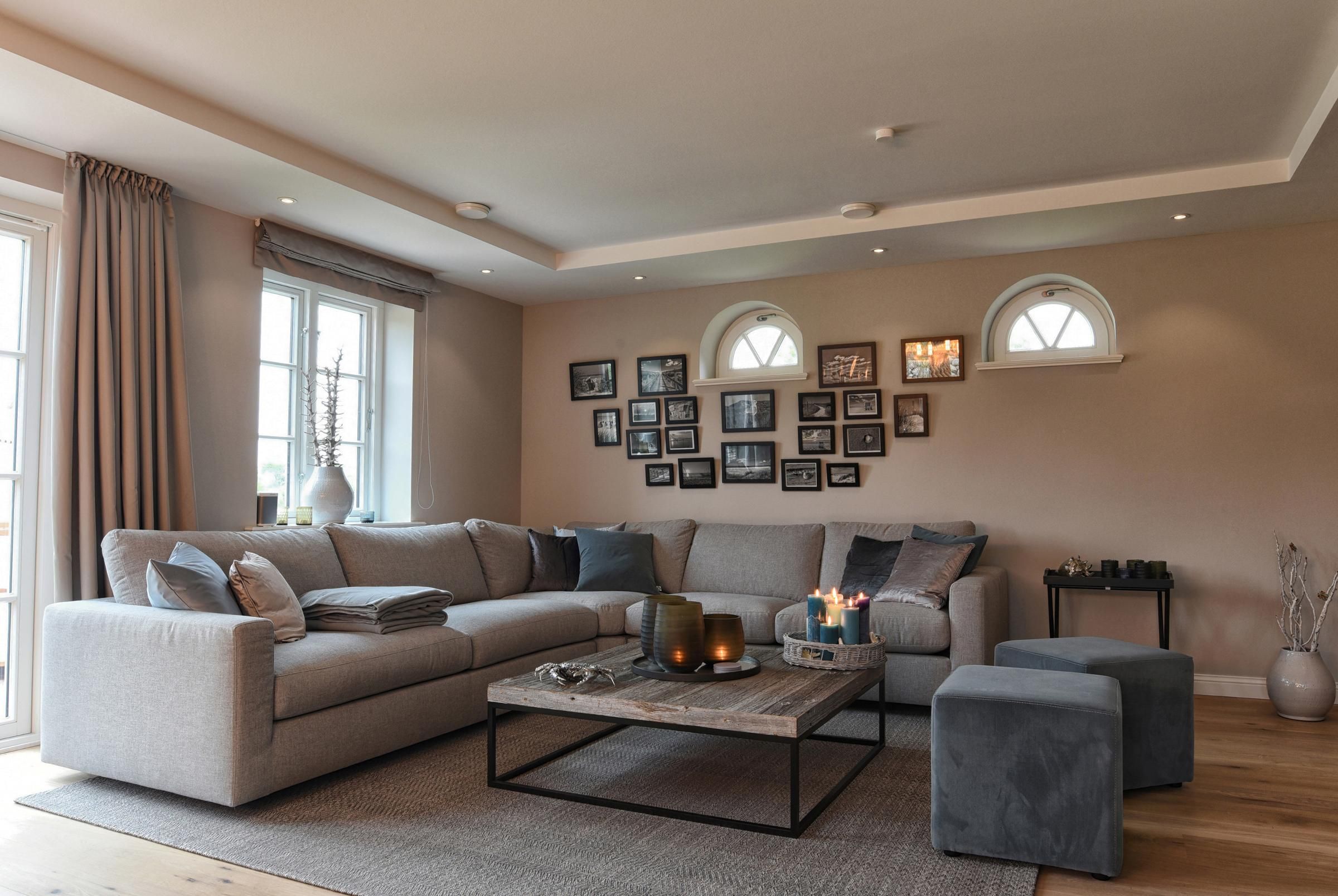 Im Erdgeschoss befindet sich das großzügige Wohn-/Esszimmer mit offener Küche und Kachelofen. In der voll ausgestatteten Küche sind ein Backofen und eine Mikrowelle vorhanden. Im Wohnbereich befindet sich eine große Eckcouch fürs gemütliche Miteinander. Für die richtige Stimmung in allen Räumen sorgt die Sonos-Musikanlage. Zudem befinden sich eines der drei Schlafzimmer mit Doppelbett und ein Badezimmer inklusive Sauna im Erdgeschoss und sind somit barrierefrei zugänglich. Im Obergeschoss gibt es 2 Schlafzimmer - jeweils mit einem Doppelbett ausgestattet. Zwei weitere Badezimmer sind ebenfalls im Obergeschoss zu finden, eines mit Badewanne und eines mit Dusche (en-suite Bad).