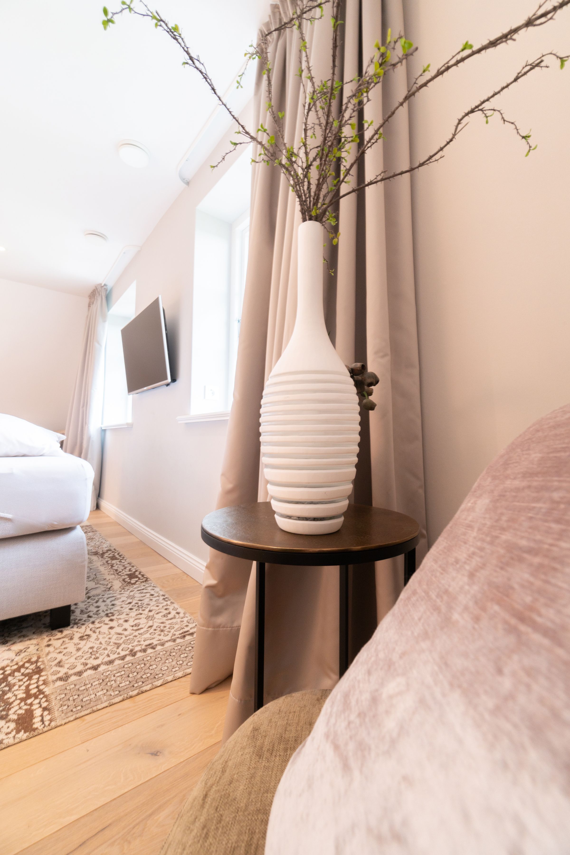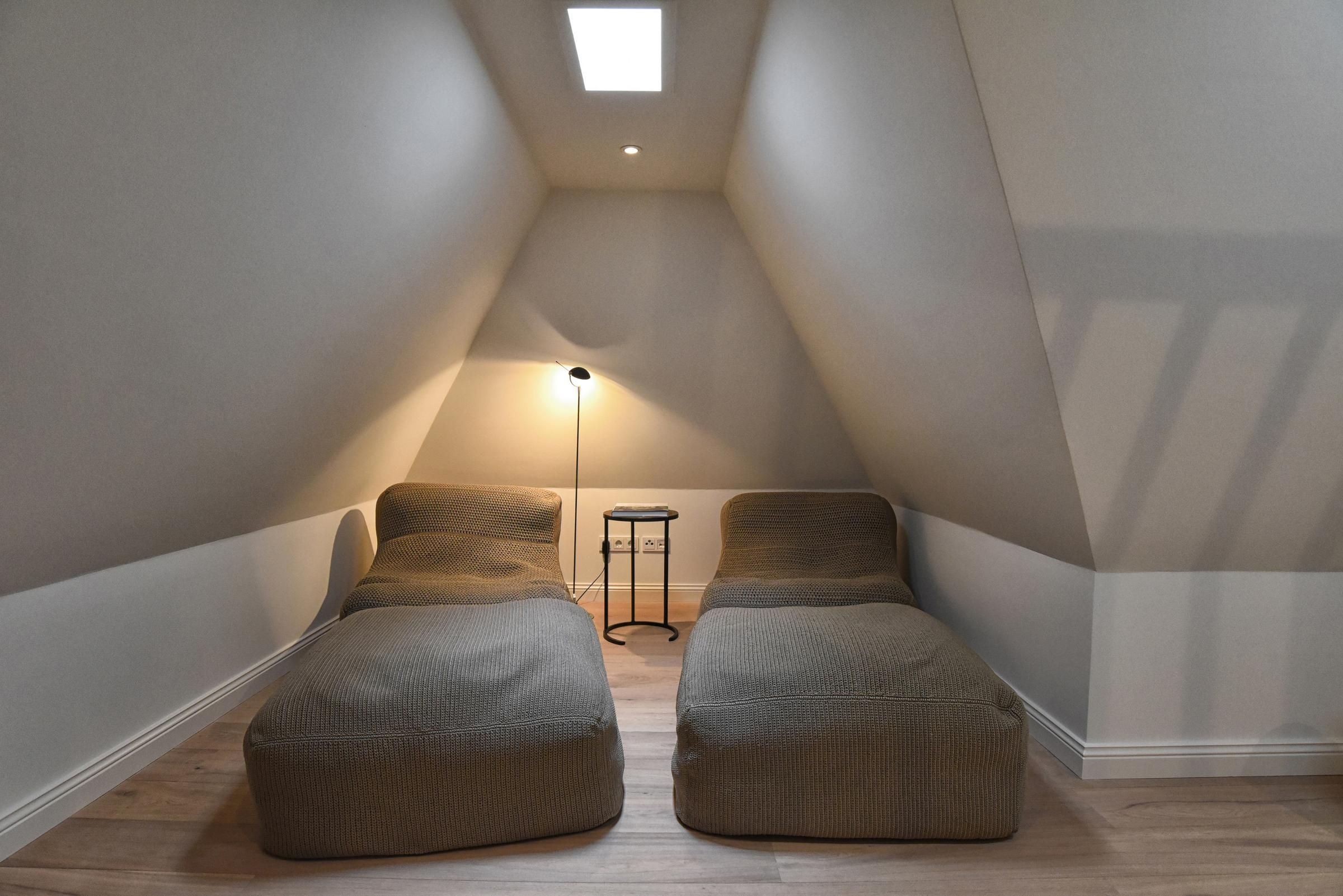 Das Dachgeschoss ist als Loungeraum mit Leseecke und Yogamatten ausgestattet.