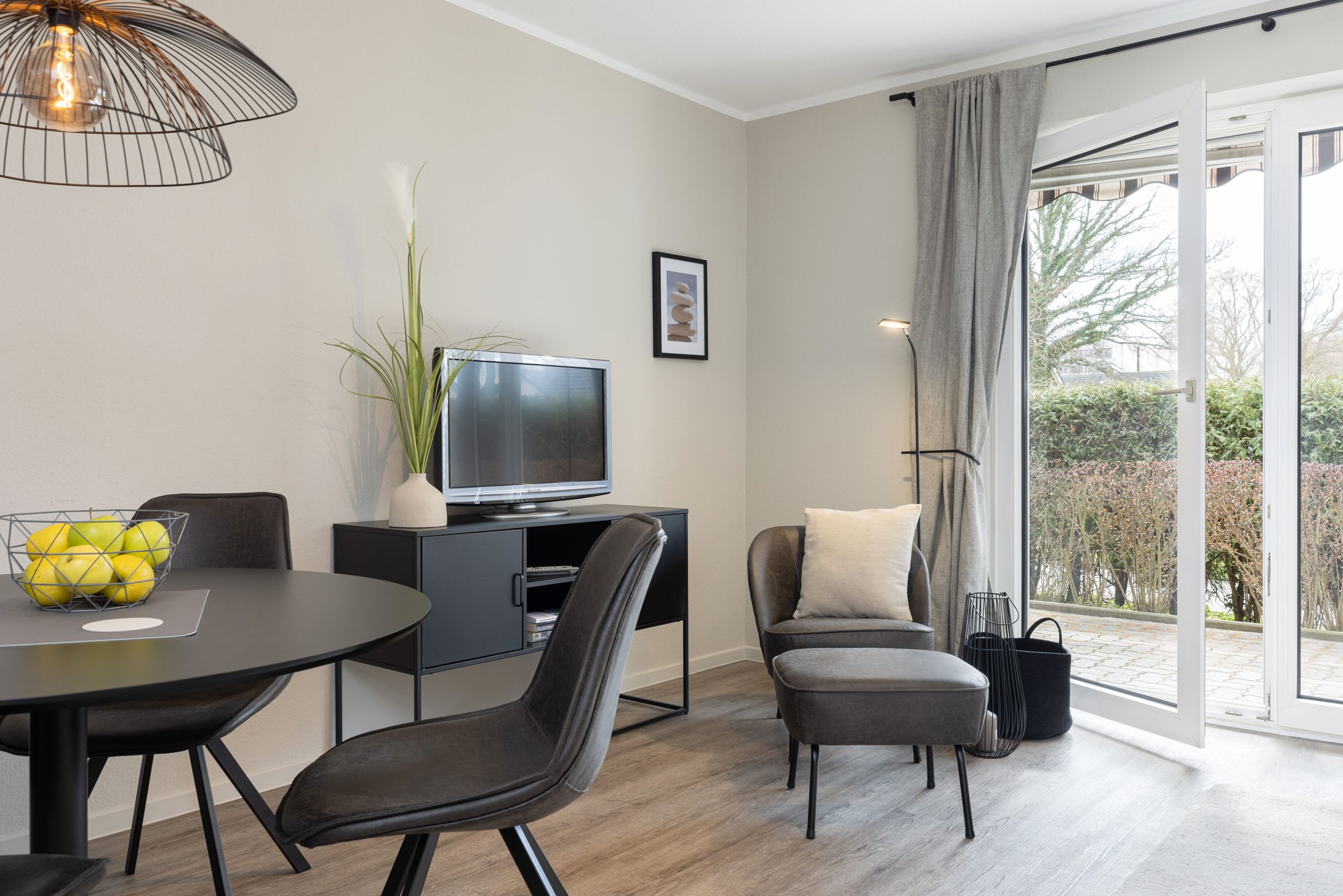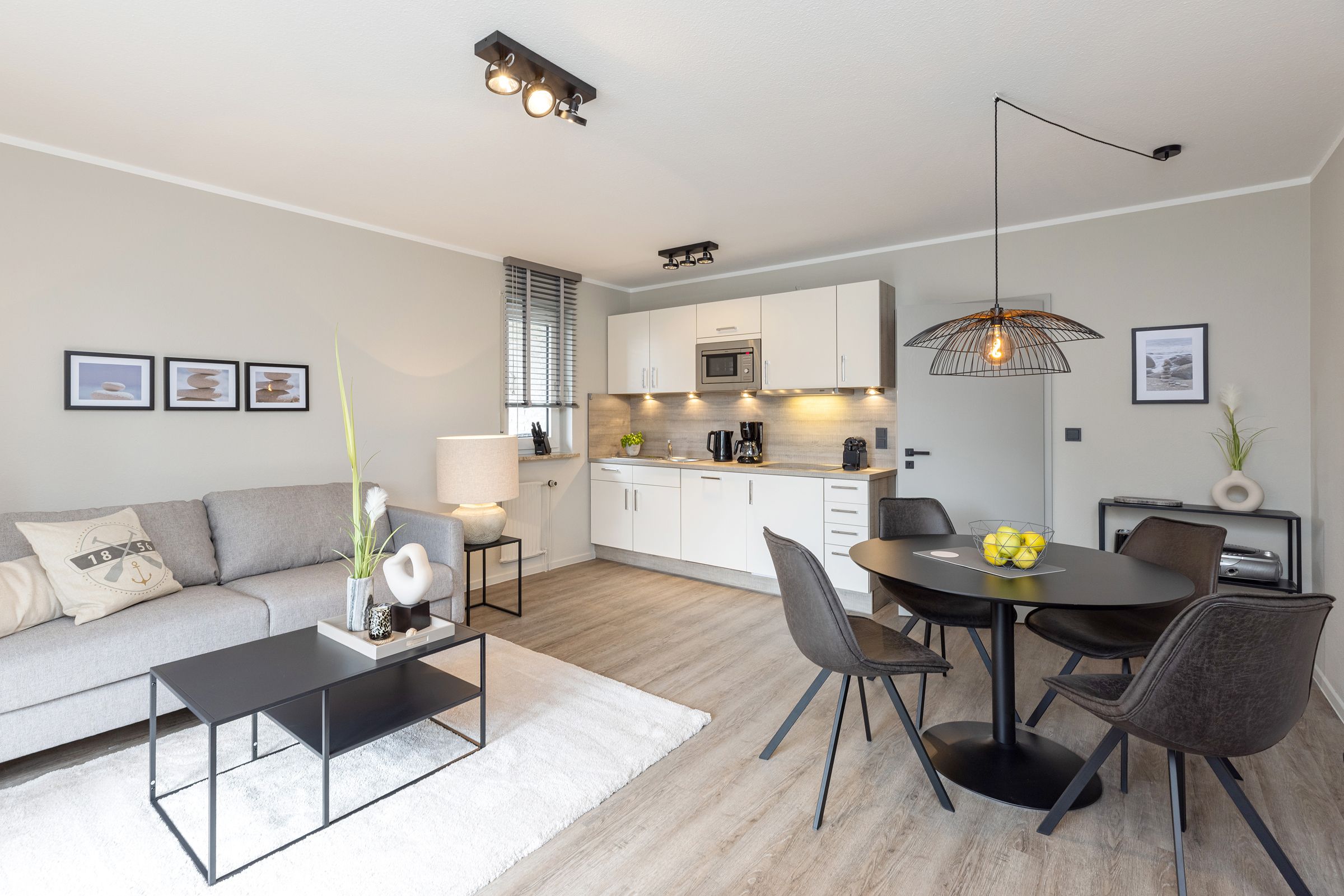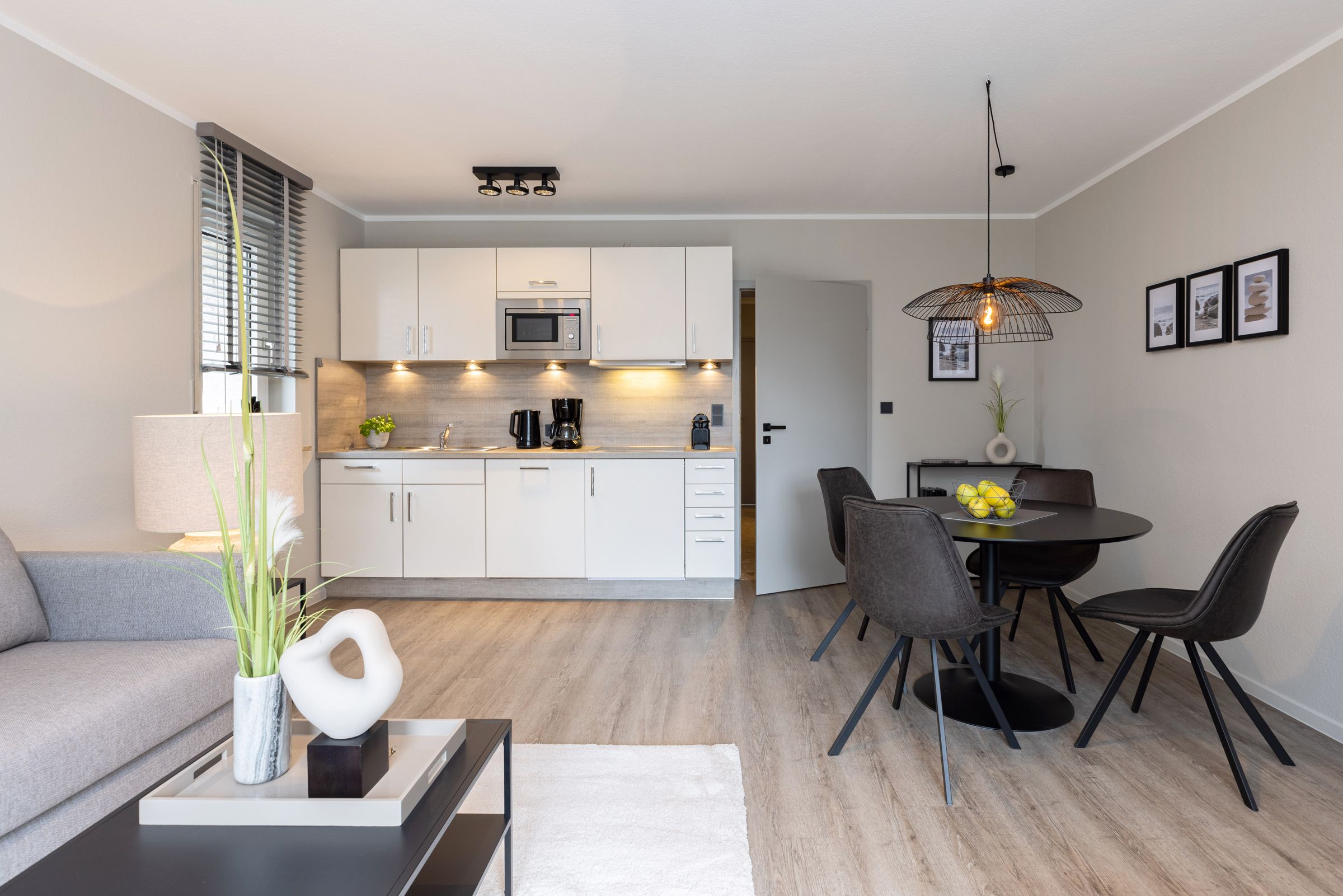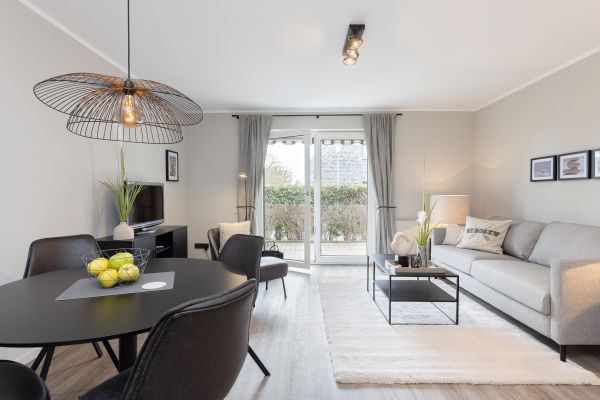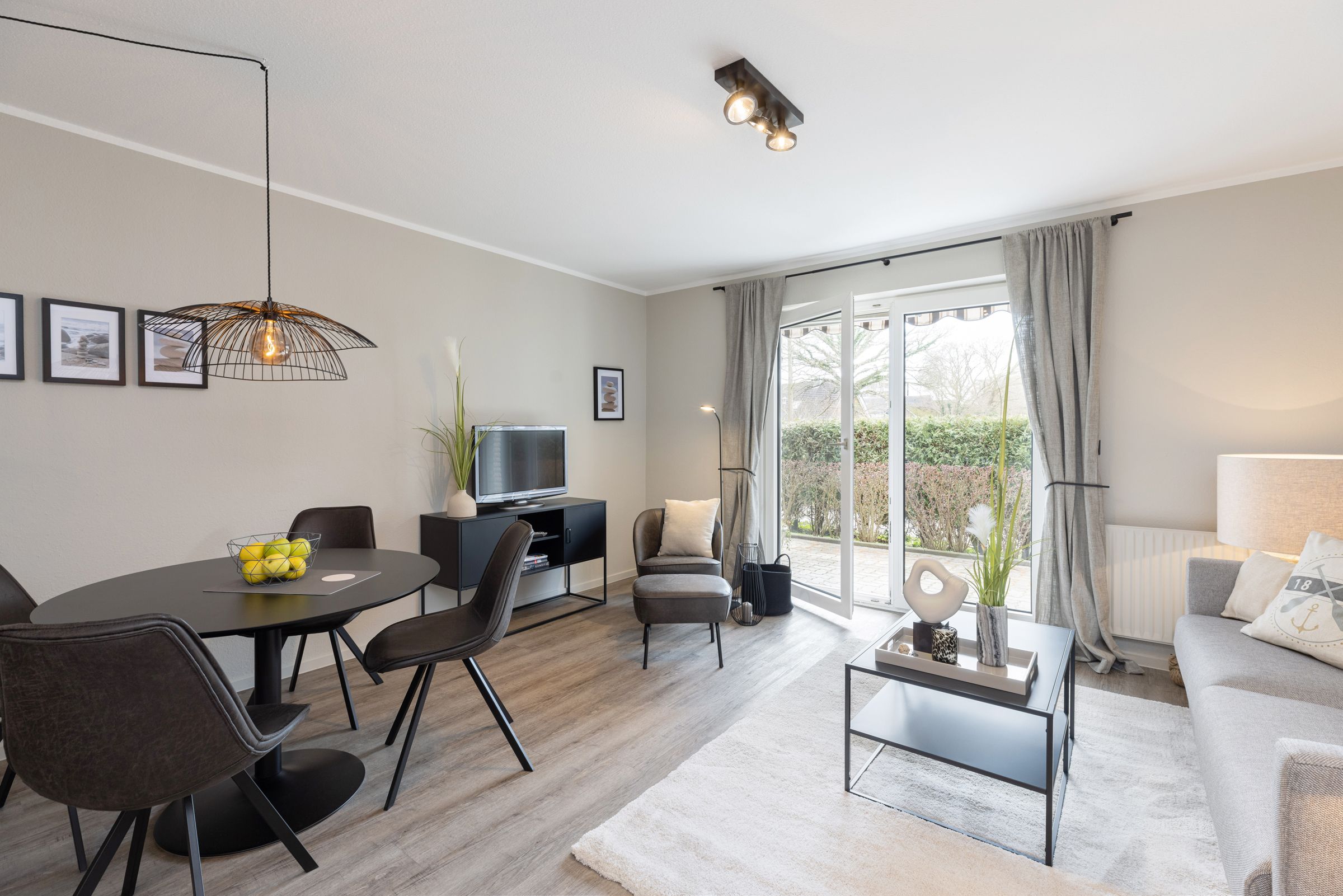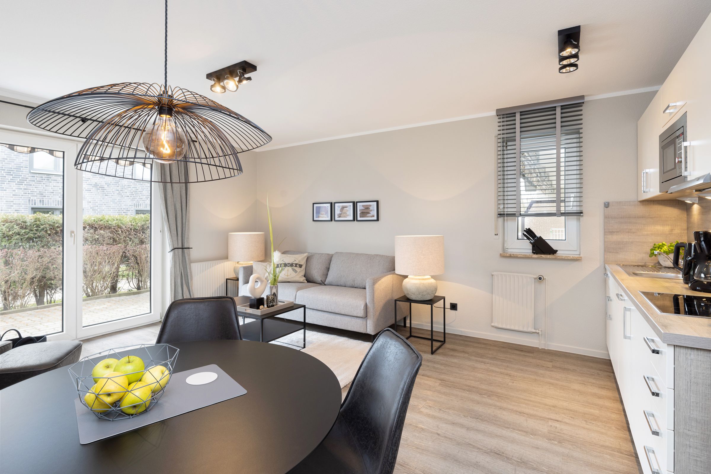 Die Wohnung 5 liegt im Erdgeschoss und ist ca. 45 qm groß. Der Wohnbereich ist offen und hell gestaltet durch eine schöne Fensterfront zum Garten. Integriert im Wohnbereich sind der Essbereich und die Küchenzeile mit Geschirrspülmaschine und Mikrowelle.