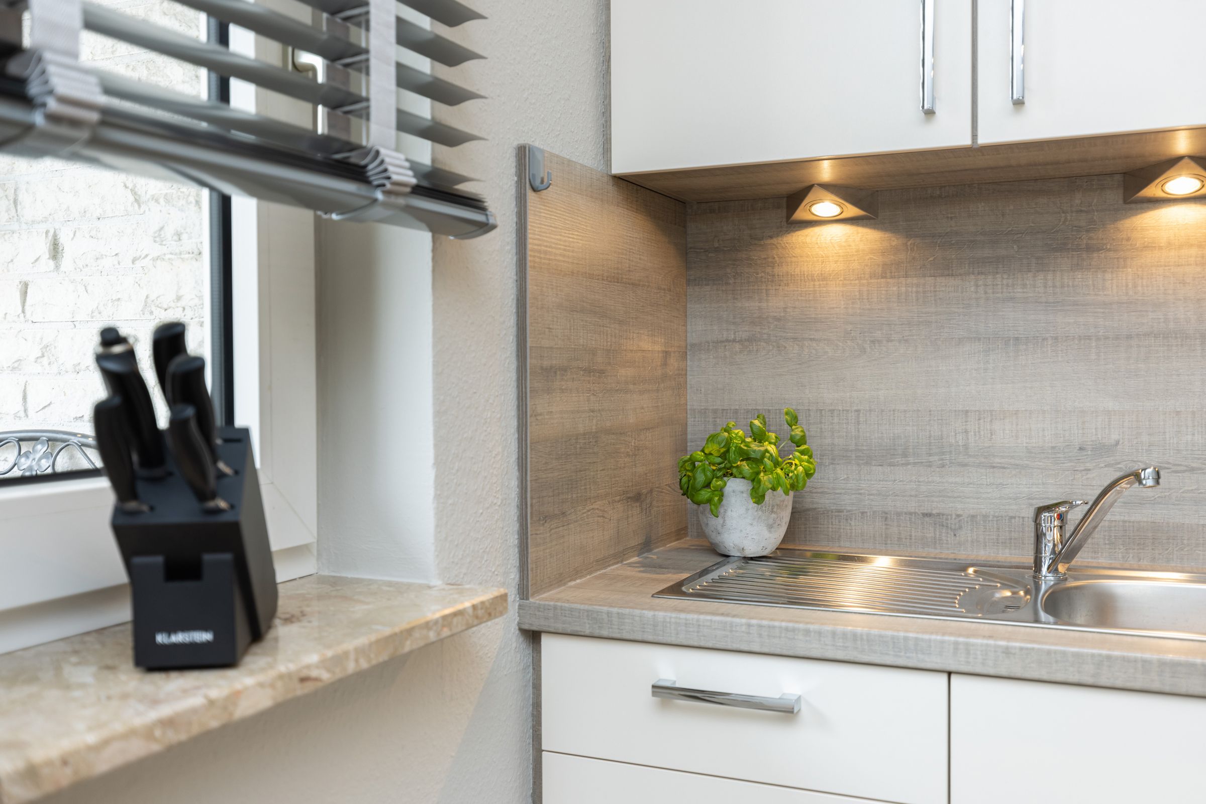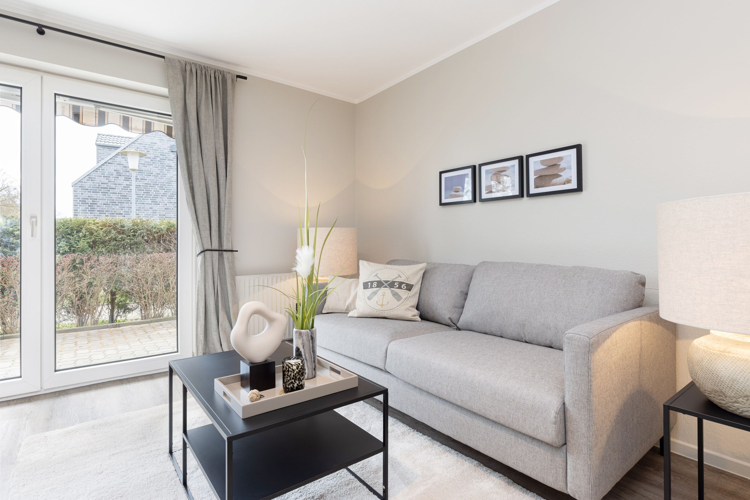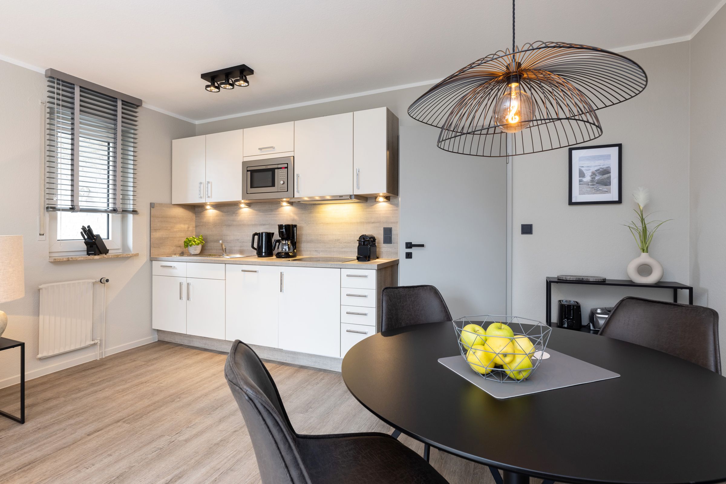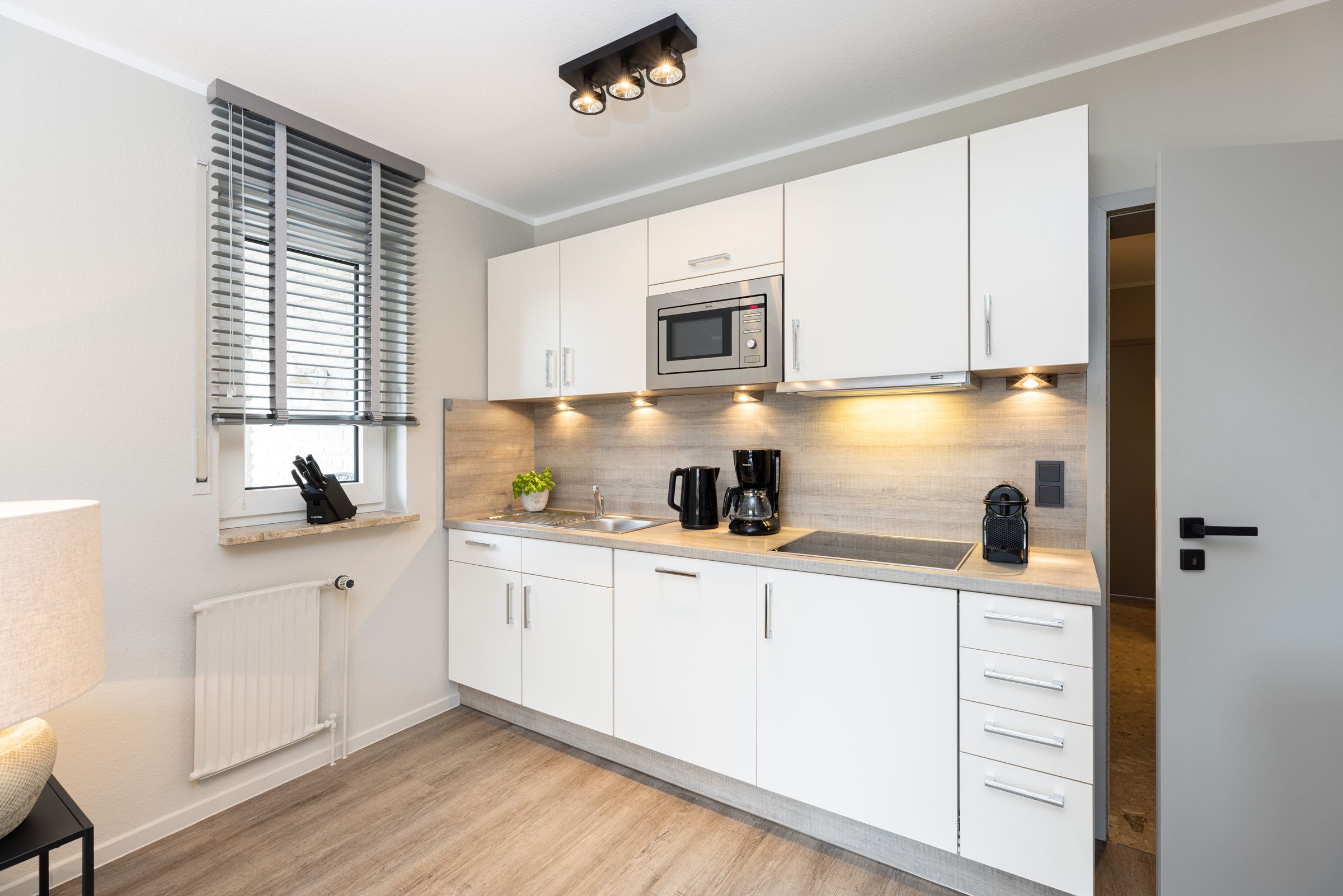Die Wohnung 5 liegt im Erdgeschoss und ist ca. 45 qm groß. Der Wohnbereich ist offen und hell gestaltet durch eine schöne Fensterfront zum Garten. Integriert im Wohnbereich sind der Essbereich und die Küchenzeile mit Geschirrspülmaschine und Mikrowelle.