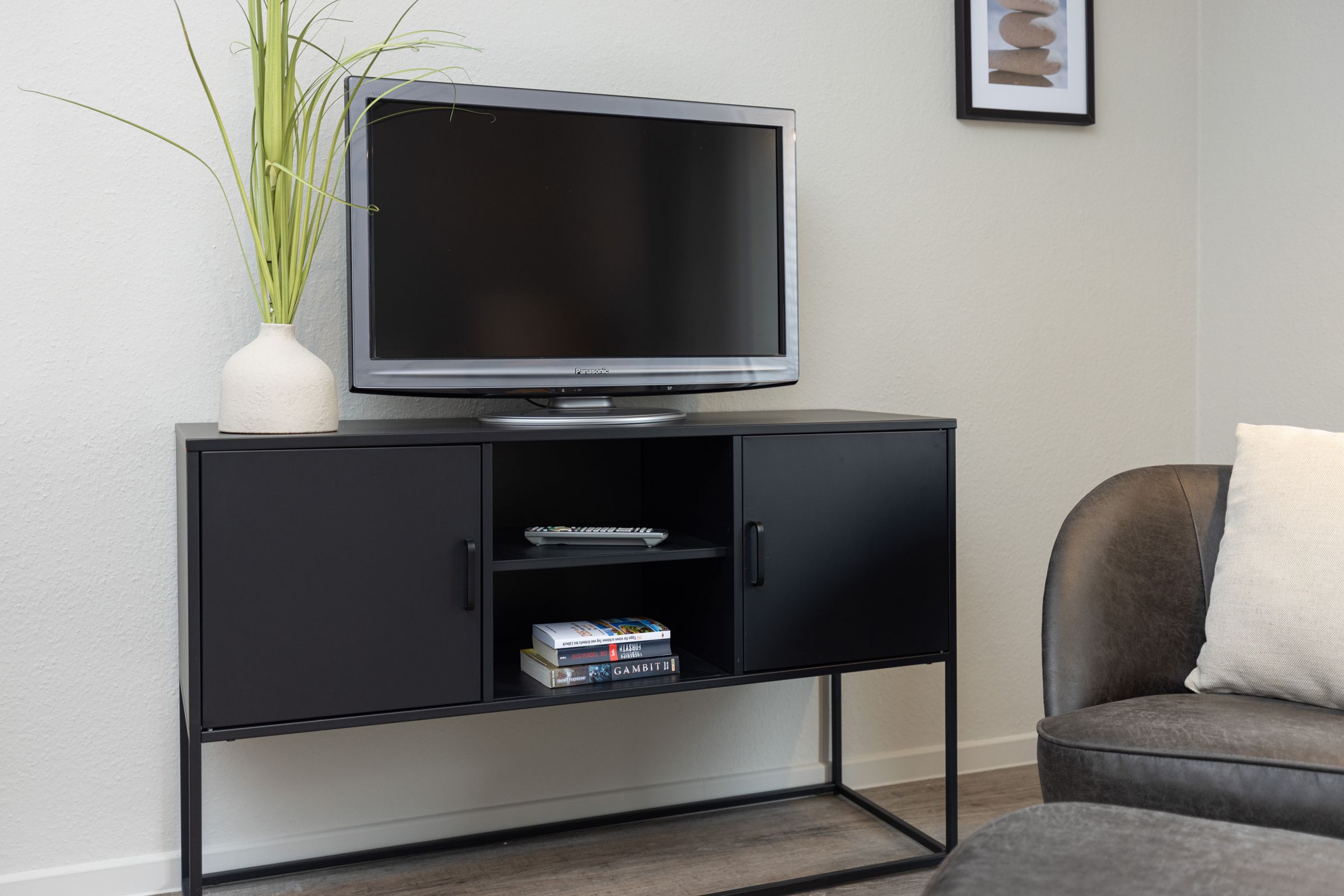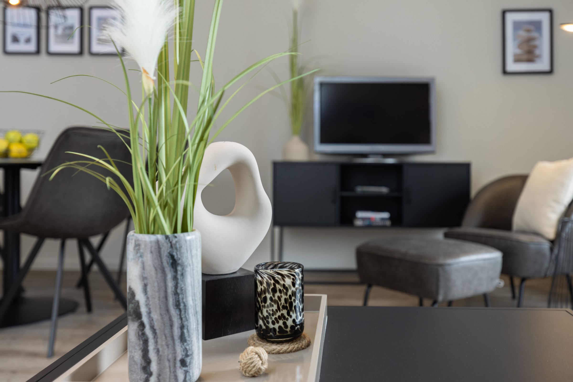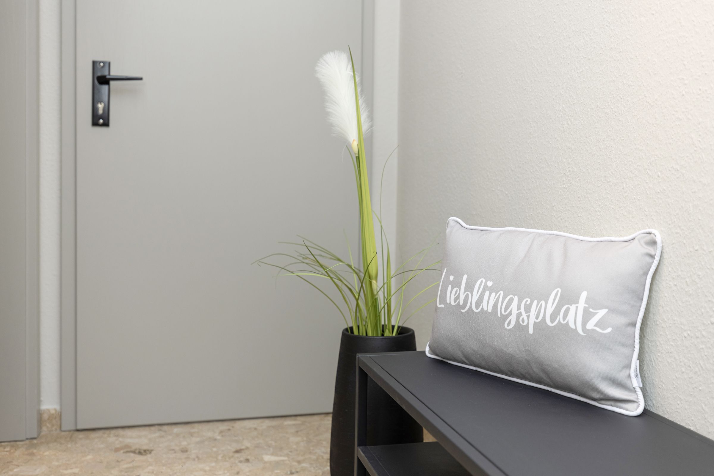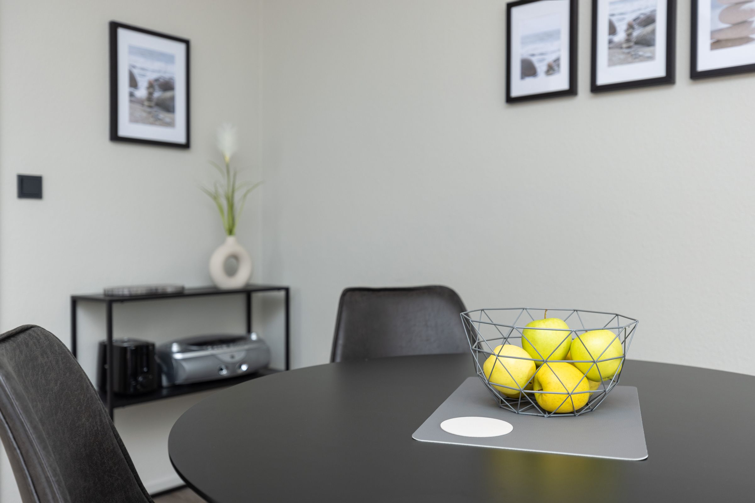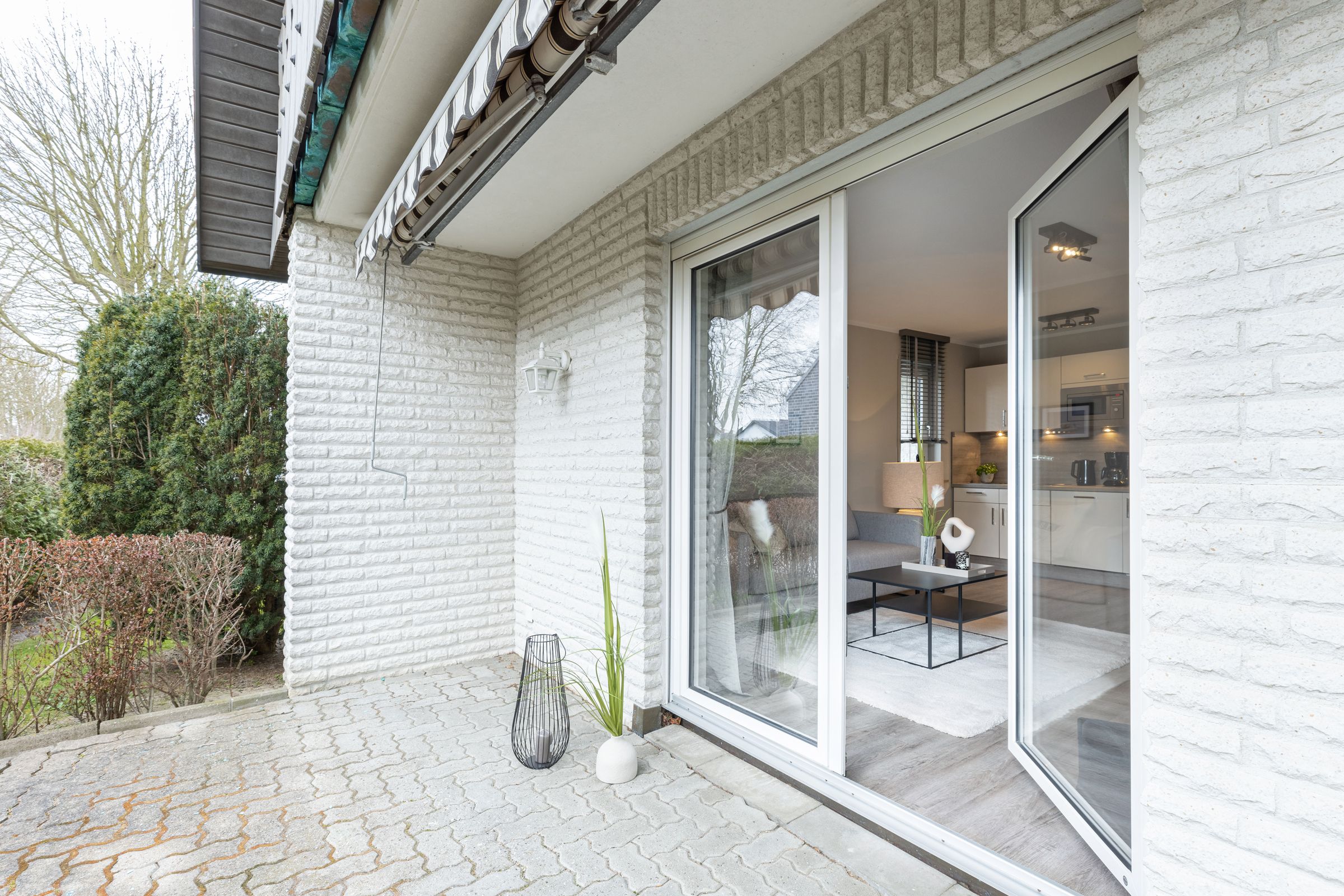 Die Wohnung 5 liegt im Erdgeschoss und ist ca. 45 qm groß. Der Wohnbereich ist offen und hell gestaltet durch eine schöne Fensterfront zum Garten. Integriert im Wohnbereich sind der Essbereich und die Küchenzeile mit Geschirrspülmaschine und Mikrowelle.