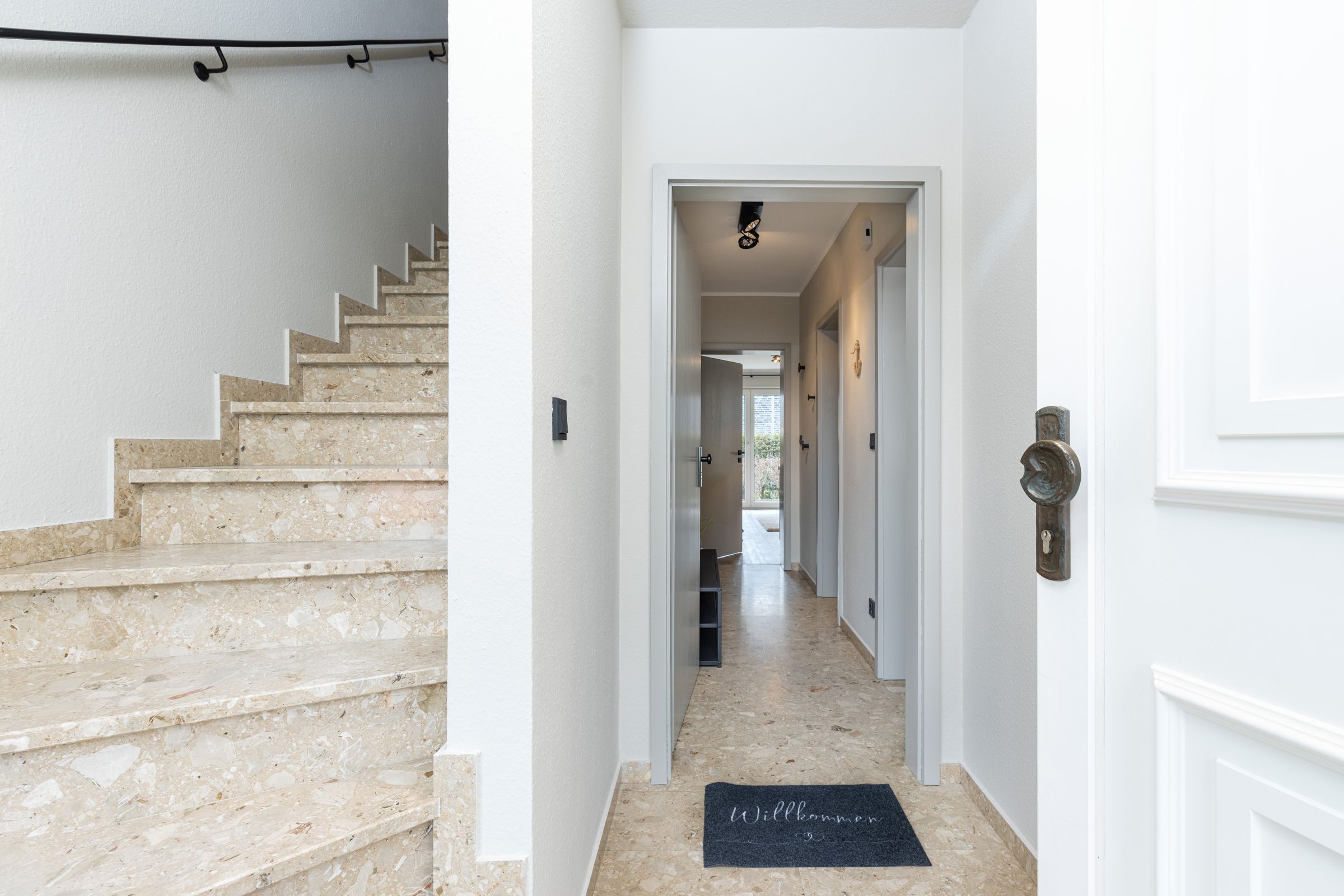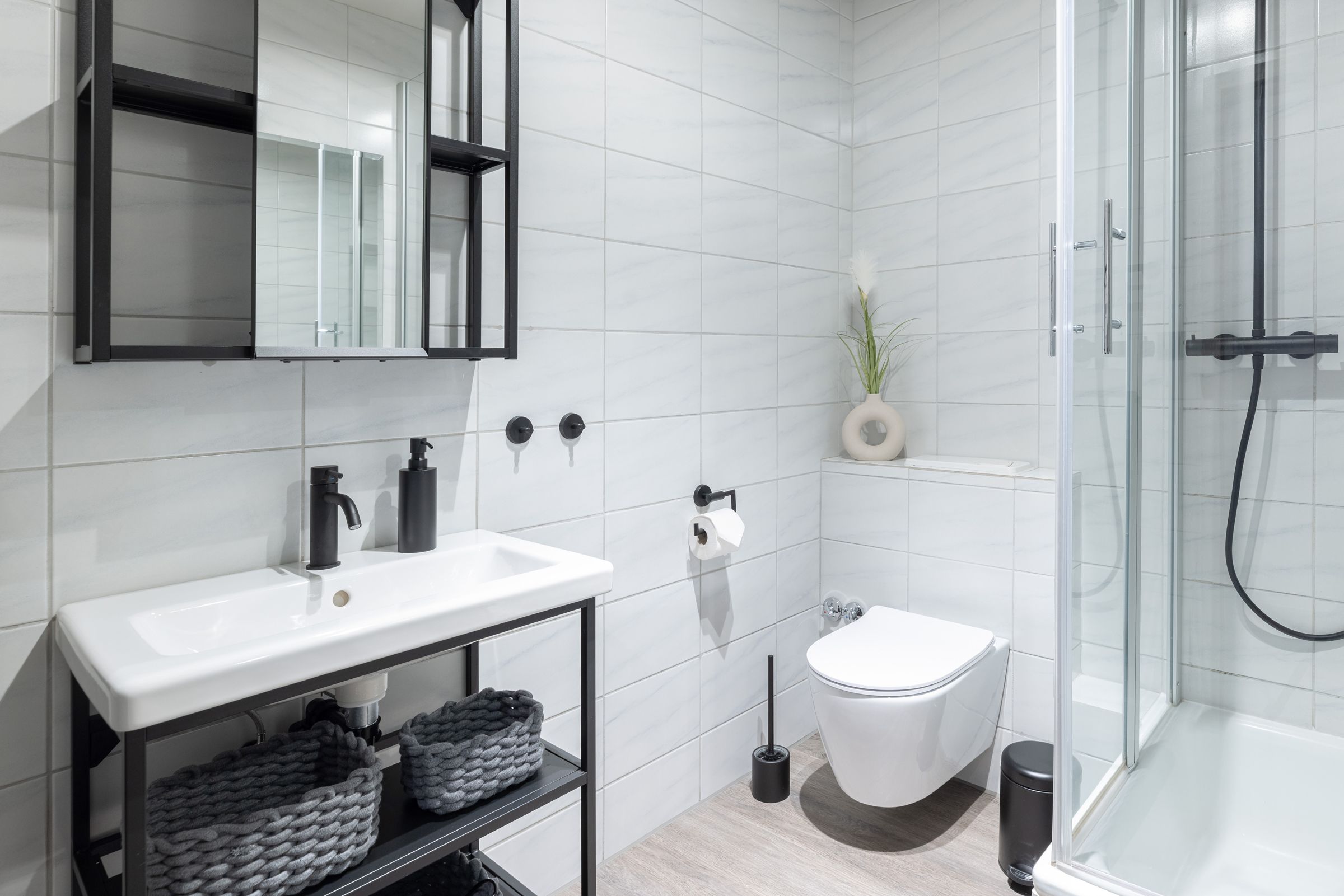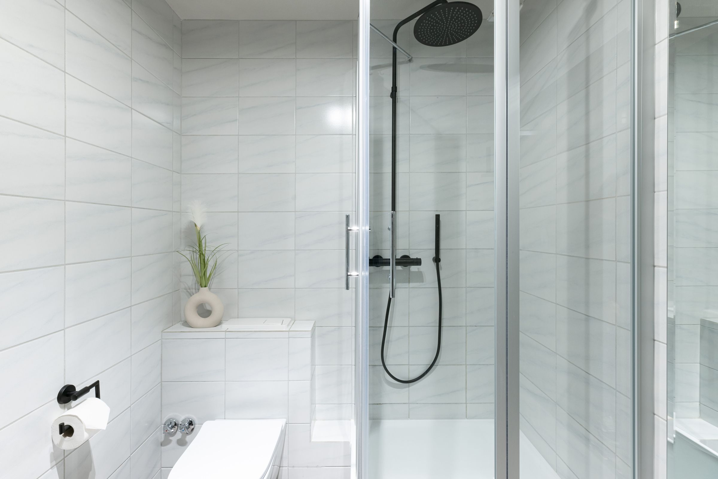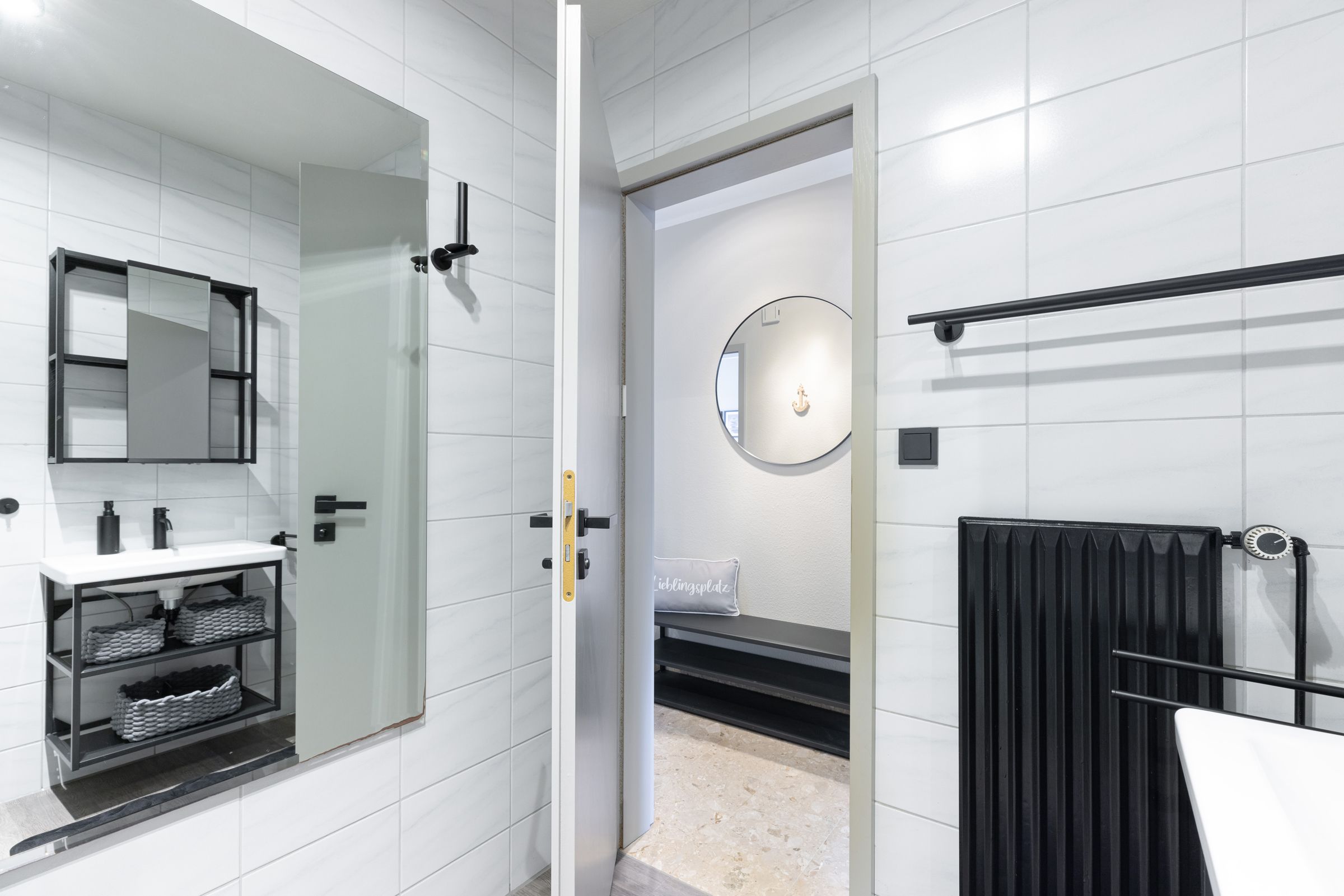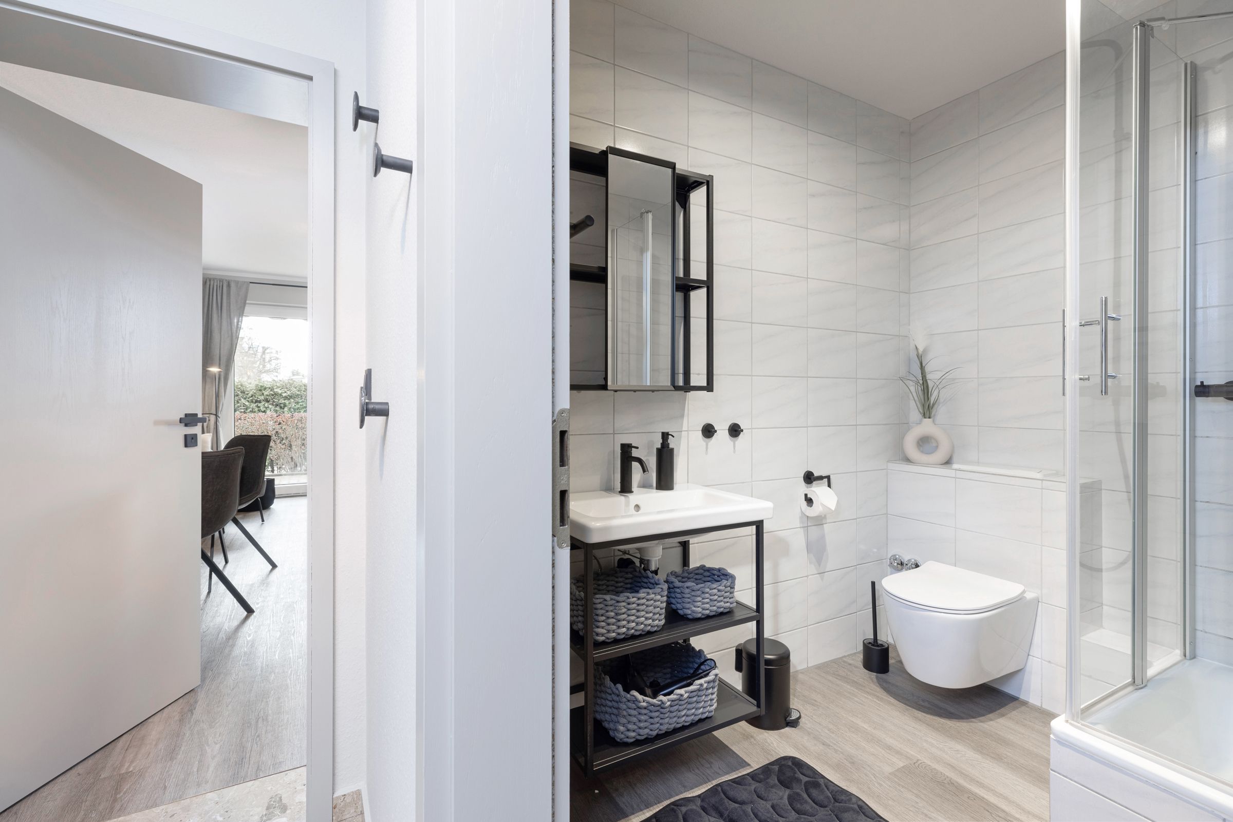 Das Badezimmer ist mit Duschkabine und hellen Fliesen gestaltet. Die sonnige Terrasse der Wohnung ist nach Süd-Westen ausgerichtet und zusätzlich ist der Garten gemeinschaftlich zu nutzen.