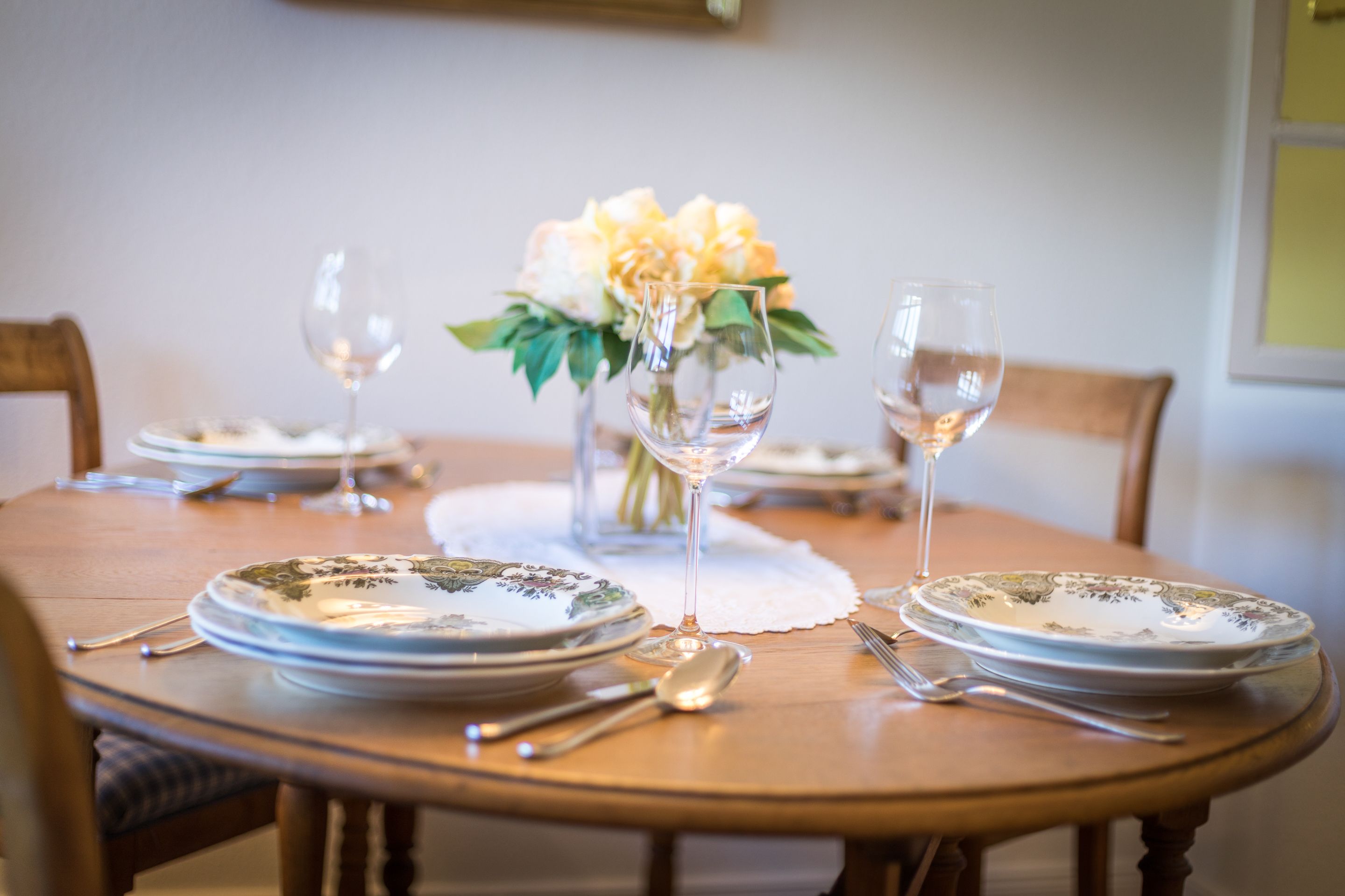 Essbereich: ovale Essgruppe mit vier Stühlen und Durchreiche zur Küche