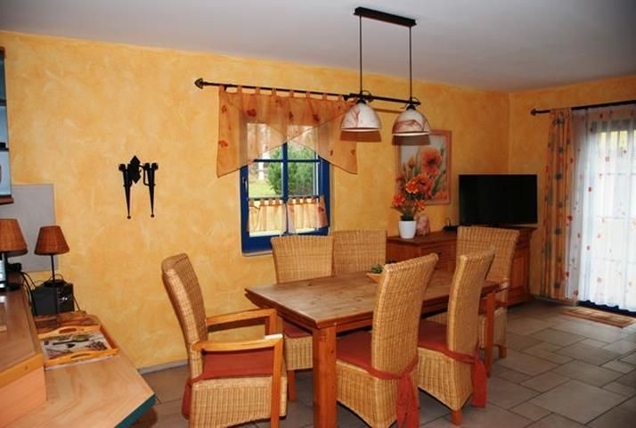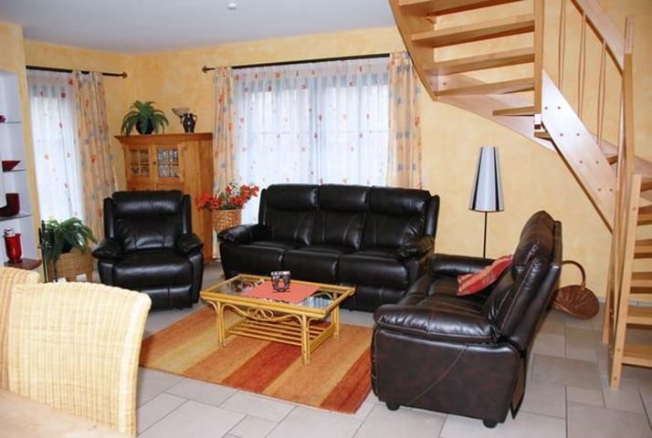 Eine sehr warme Gestaltung der Räume. Das Mobiliar ist etwas in die Jahre gekommen, das Sofa zb. sehr durchgesessen .
