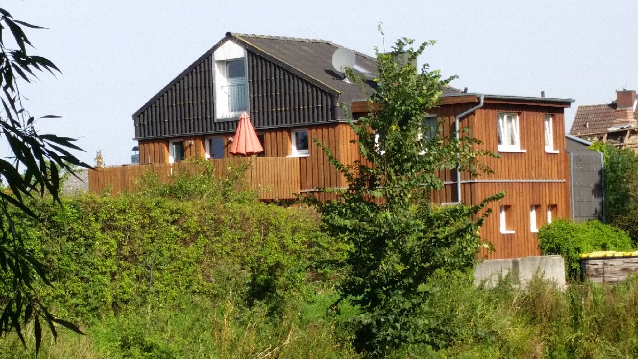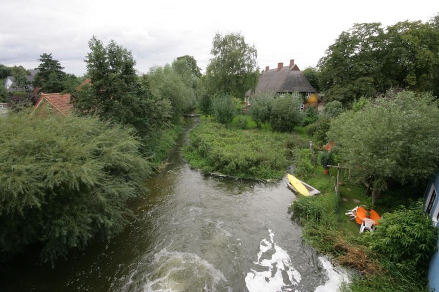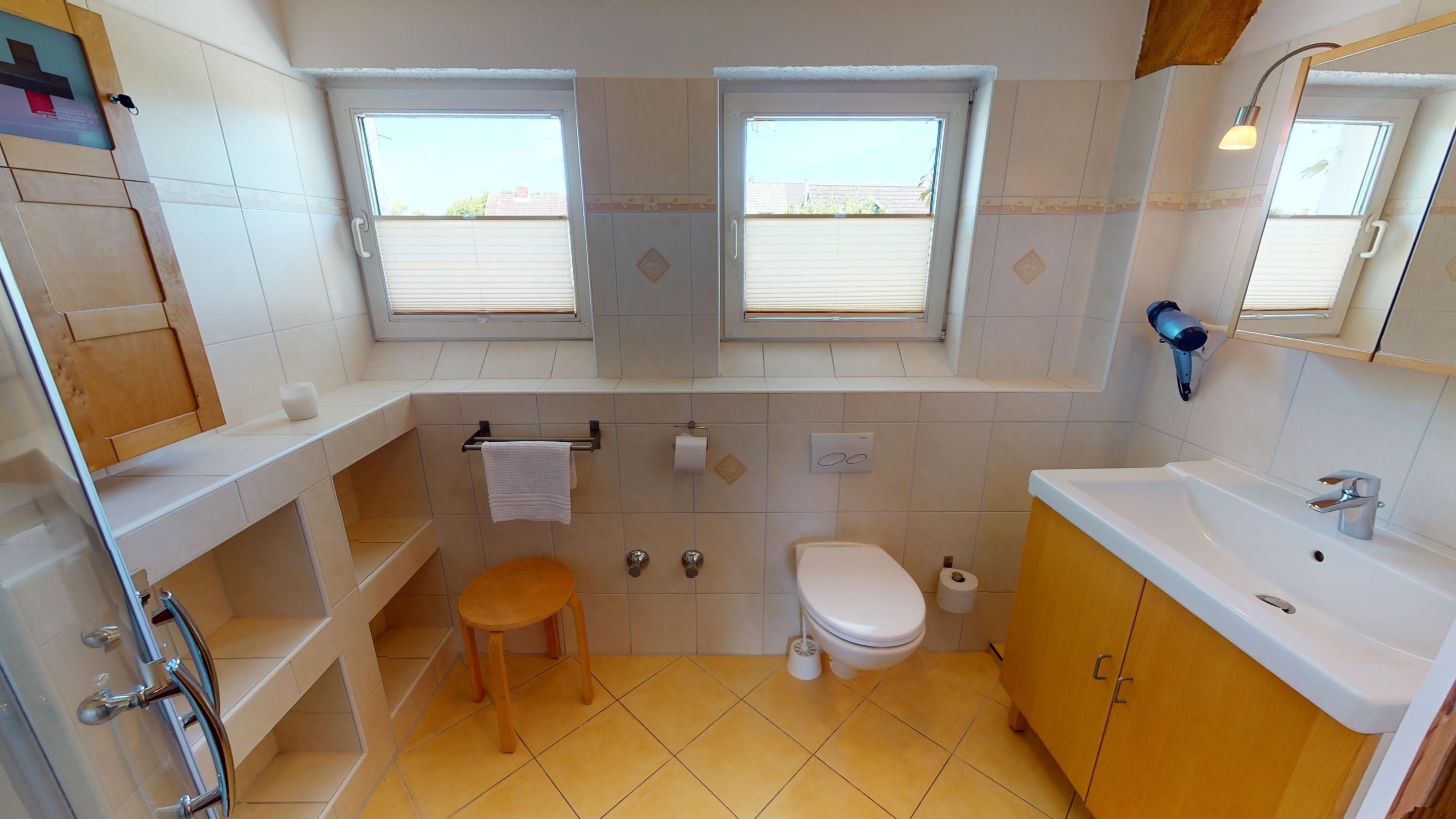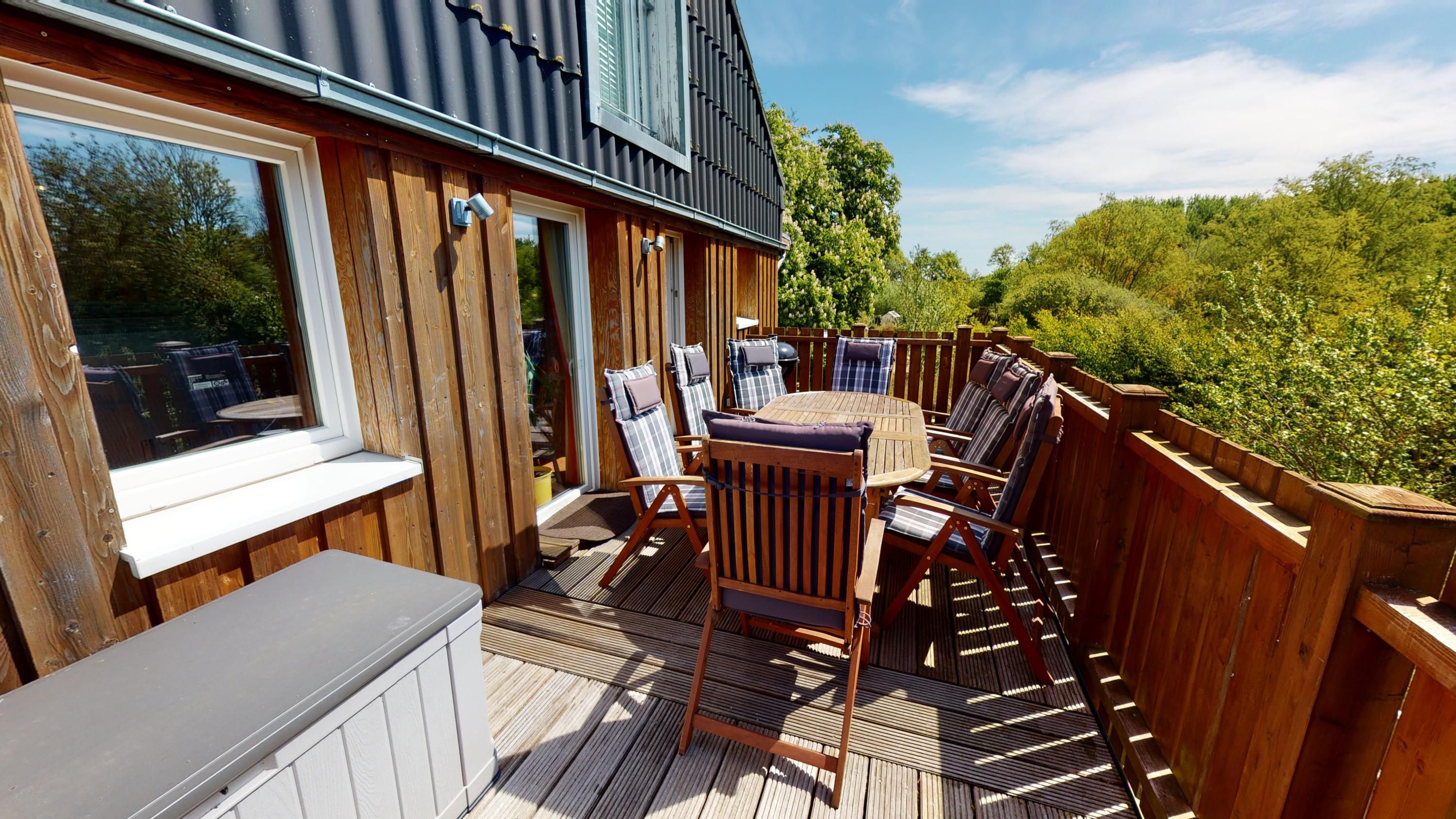 Im zweiten Obergeschoss beginnt der Tag mit Licht und Weite: Der offene Wohnbereich mit großer Couchecke, angeschlossener Küchenzeile und Essplatz führt direkt auf den Balkon – mit freiem Blick über die Hagener Au und den Mühlengraben. Hier kann man grillen, sitzen, reden oder einfach nur schauen. Zwei Schlafzimmer mit je einem Doppelbett sowie zwei Bäder mit Dusche und WC machen diese Etage auch für mehrere Gäste angenehm komfortabel.