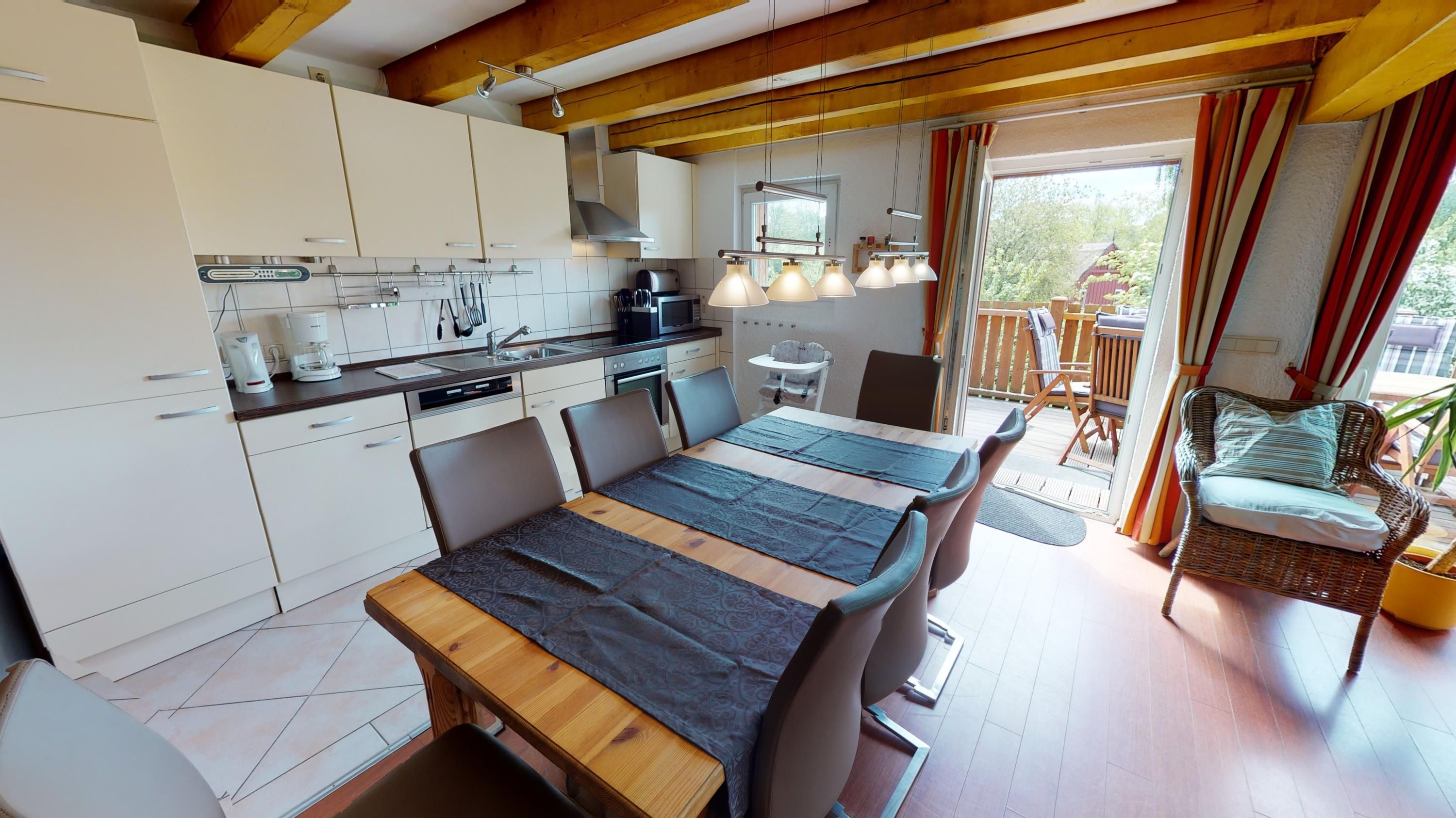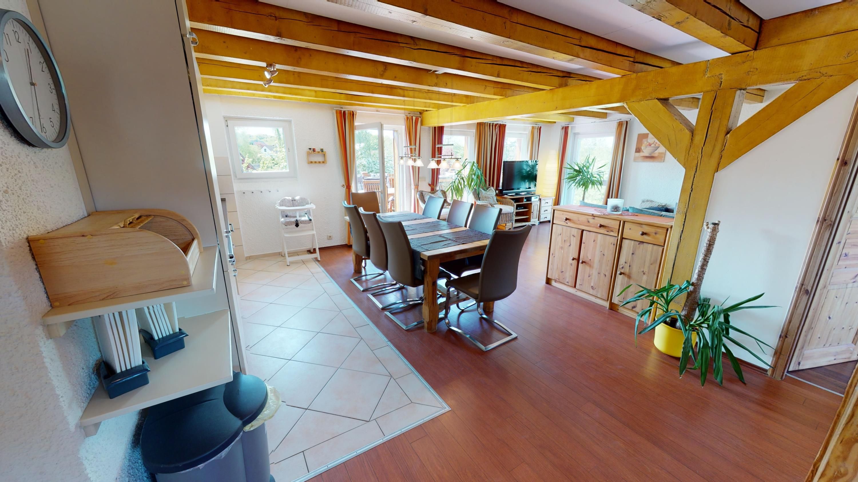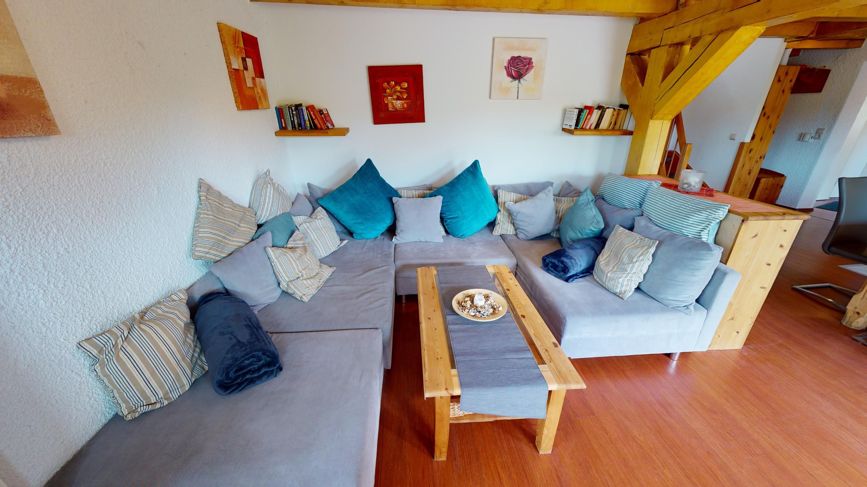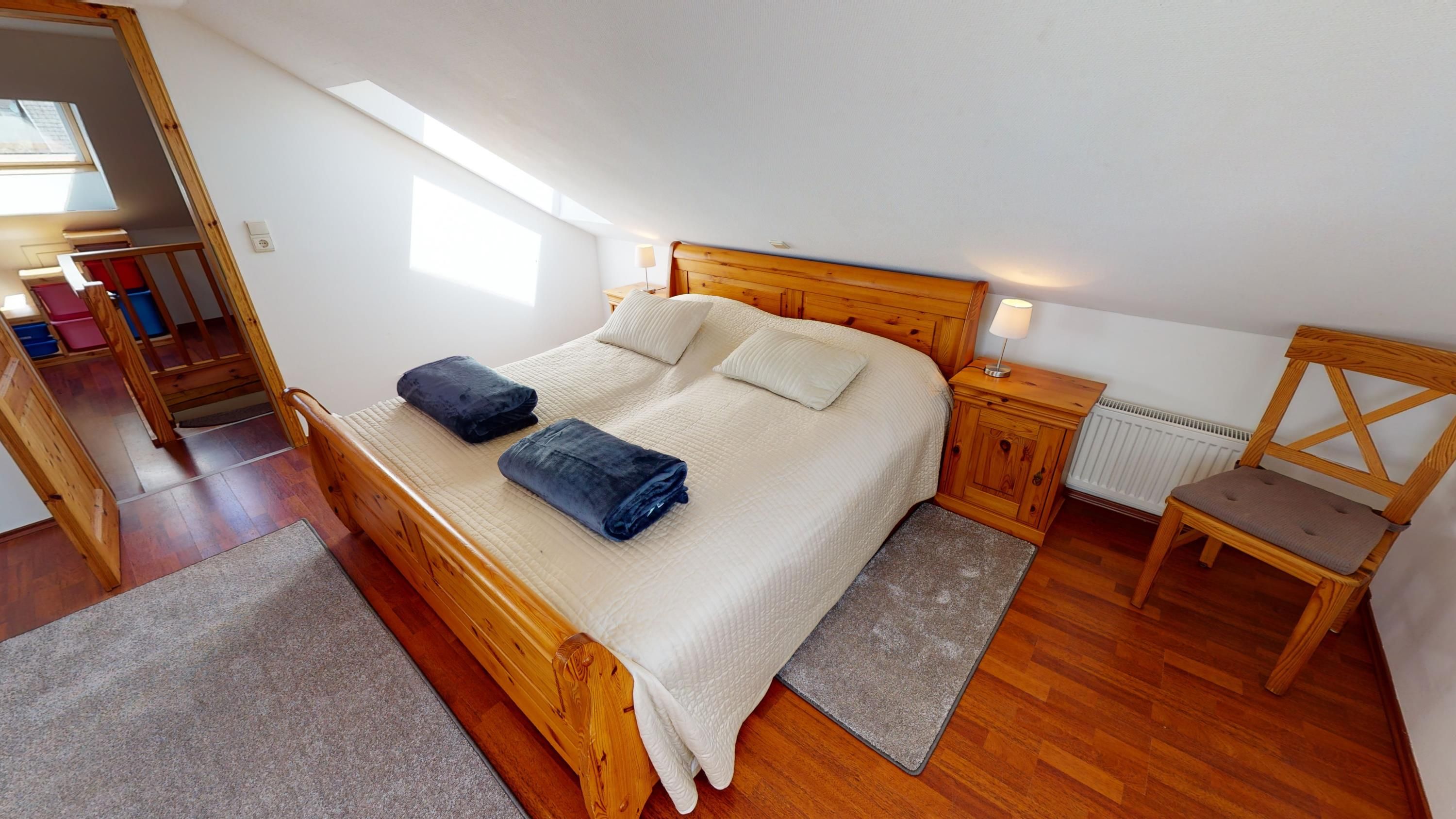 Die Ferienwohnung liegt im oberen Teil des historischen Gebäudes und erstreckt sich über zwei Etagen – das 2. Obergeschoss und das Dachgeschoss. Mit 120 m² Wohnfläche und insgesamt 3,5 Schlafzimmern bietet sie Platz für bis zu acht Personen, ideal für größere Familien oder Freunde, die zusammen reisen und trotzdem Raum für sich haben möchten.