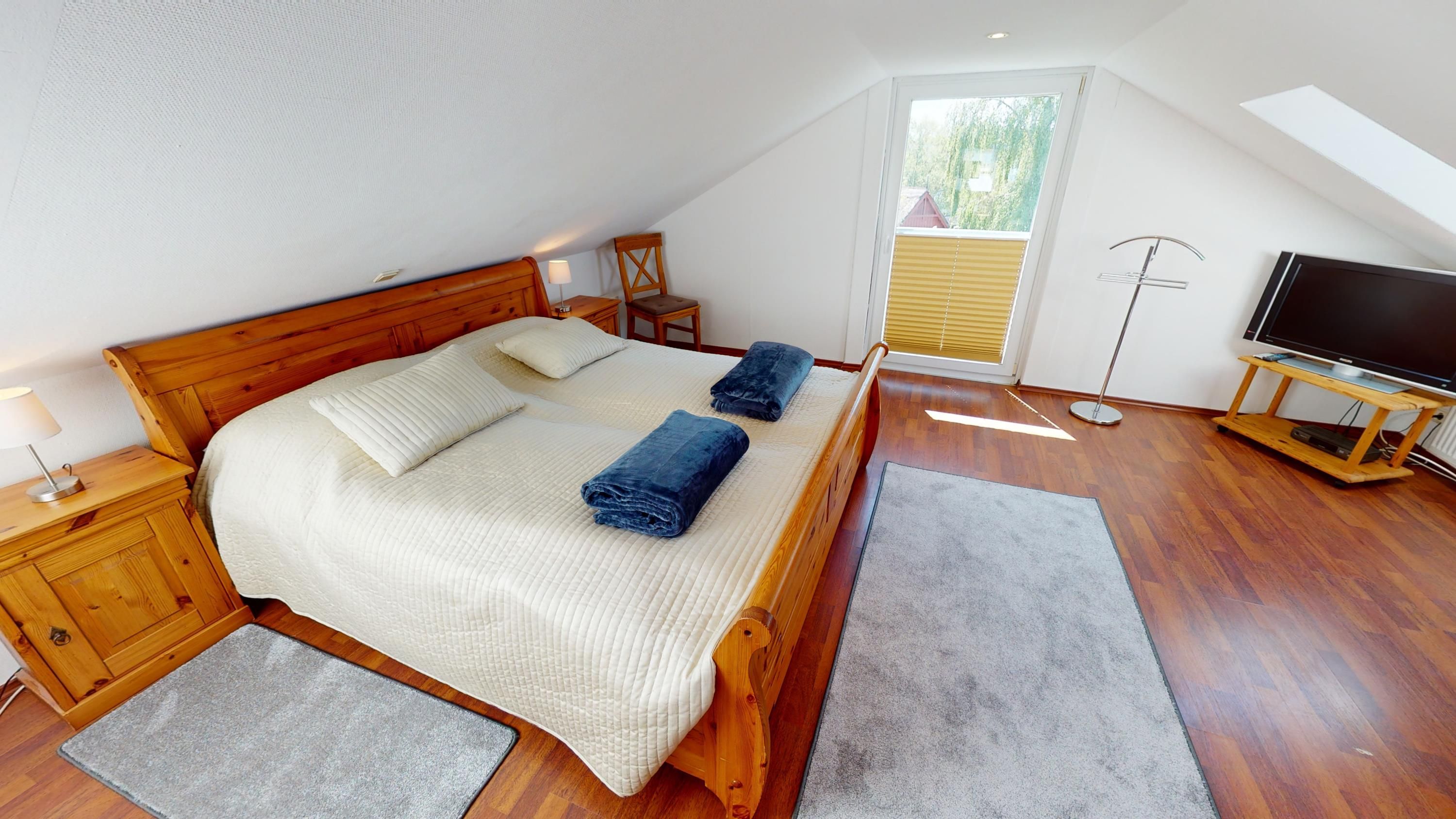 Im Dachgeschoss öffnet sich das Vorzimmer mit einem Einzelbett, das bei Bedarf um ein zweites Bett erweitert werden kann – ideal für Kinder oder Einzelreisende. Ein weiteres Schlafzimmer mit Doppelbett und französischem Balkon gibt den Blick auf die Au frei – morgens wie abends ein stilles, schönes Bild.