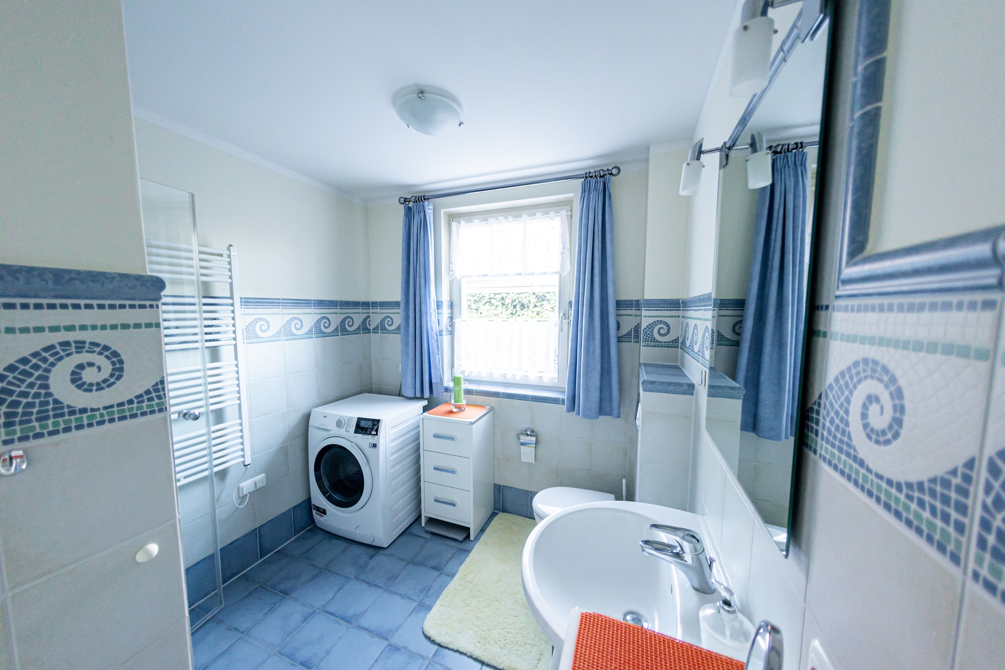 Im Badezimmer befindet sich außerdem eine Waschmaschine.
